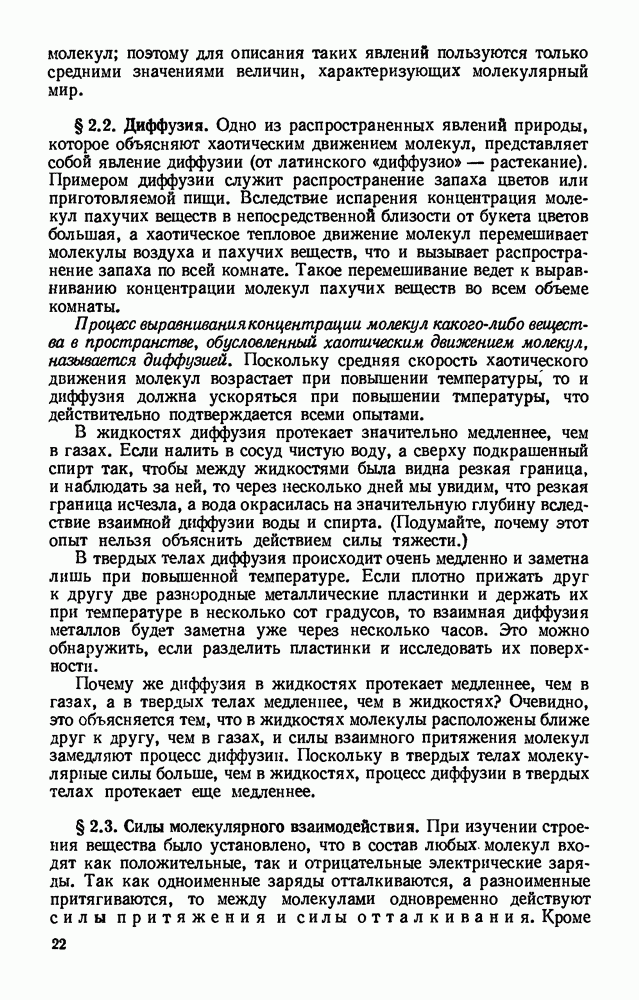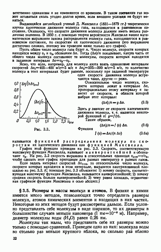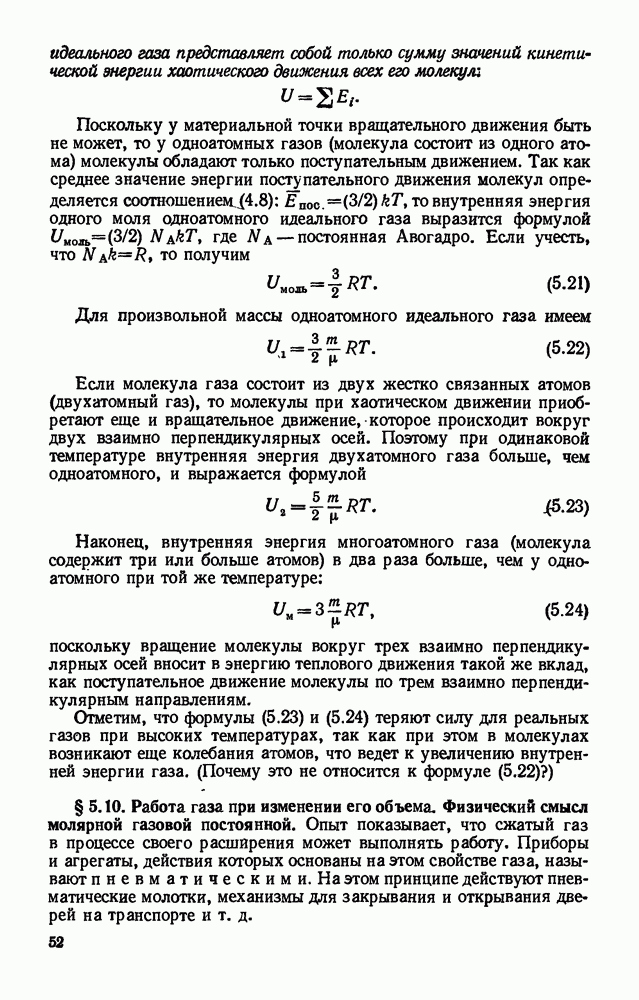 Вспомним, что собственный объем молекул газа составляет ничтожную часть от объема, занятого газом (если газ не сильно сжат); это, кстати сказать, тоже соответствует тому, что природа молекул газа не влияет существенно на его свойства. Следовательно, молекулы идеального газа всегда должны иметь пренебрежимо малый объем по сравнению с общим объемом, занятым газом. В этом смысле молекулы одноатомного идеального газа можно представить в виде материальных точек, а молекулы многоатомного газа — в виде жестко связанных материальных точек.