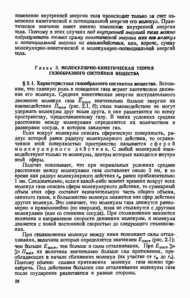 Выше говорилось (§ 3.1), что физические свойства газа определяются хаотическим движением его молекул, а взаимодействие молекул газа существенного влияния на его свойства не оказывает, причем это взаимодействие имеет характер столкновений, а притяжением молекул часто можно пренебречь. Силы отталкивания возникают при столкновении молекул на очень короткое время, и большую часть времени молекулы газа движутся как свободные частицы.