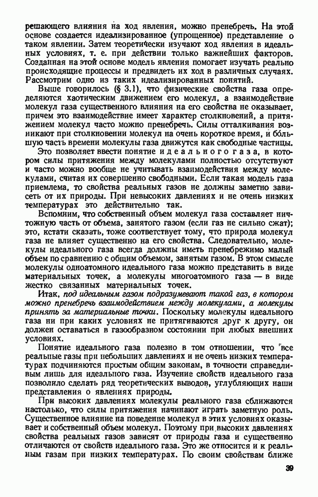 Это позволяет ввести понятие идеального газа, в котором силы притяжения между молекулами полностью отсутствуют и часто можно вообще не учитывать взаимодействия между молекулами, считая их совершенно свободными. Если такая модель газа приемлема, то свойства реальных газов не должны заметно зависеть от их природы. При невысоких давлениях и не очень низких температурах это действительно так.