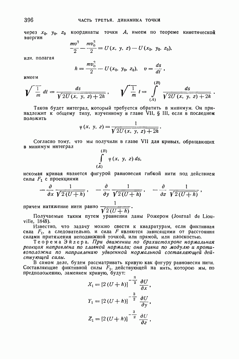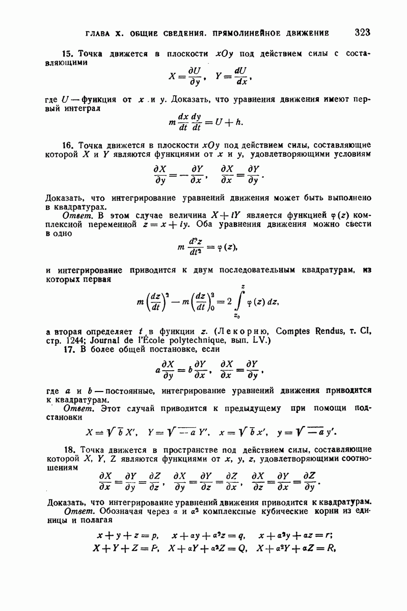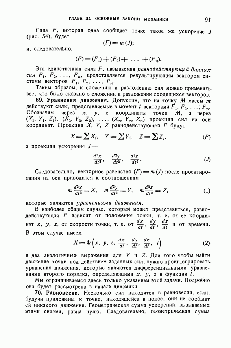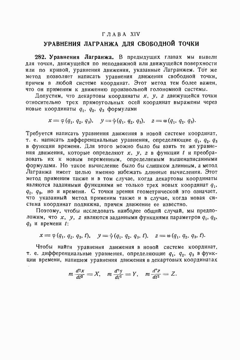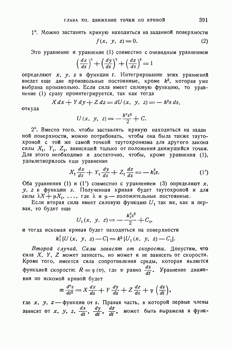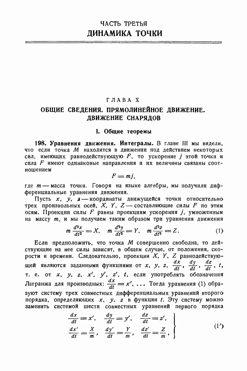 точки. Если потом отпустить точку и подвергнуть ее действию указанных сил, то она придет в движение, уравнения которого в конечной форме получатся после интегрирования уравнений (1). В этих уравнениях проекции X, Y, Z являются известными функциями координат