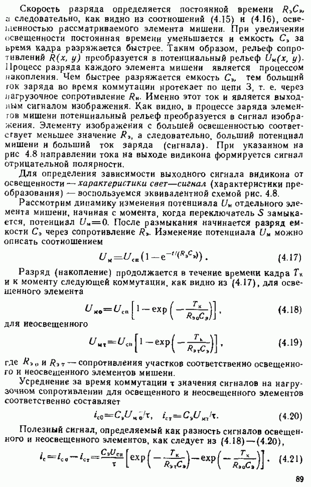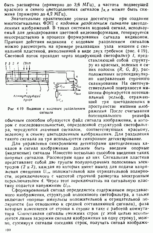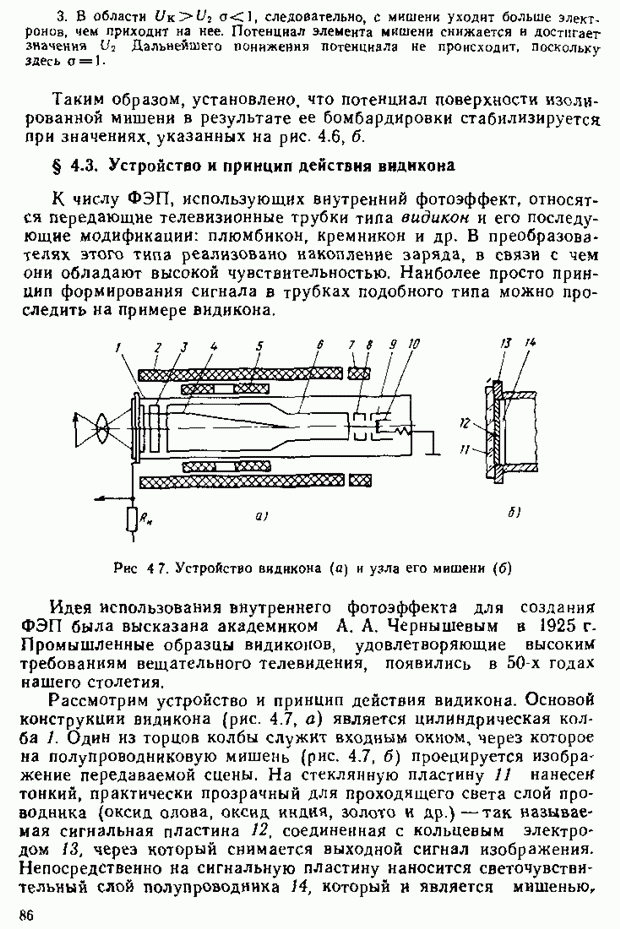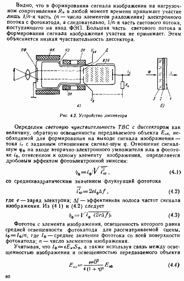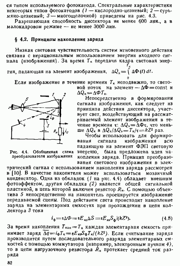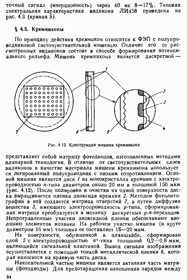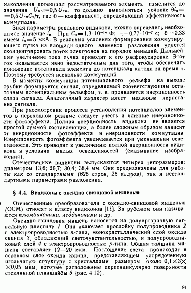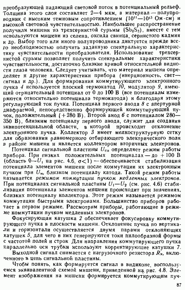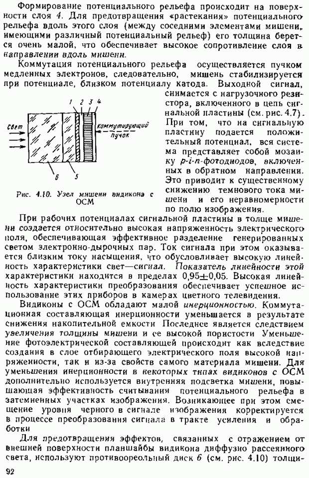 § 4.4. Видиконы с оксидно-свинцовой мишеньюОтечественные преобразователи с оксидно - свинцовой мишенью (ОСМ) относят к классу видиконов Оксидно-свинцовая мишень наносится на полупрозрачную сигнальную пластину 1. Она включает прослойку полупроводника 2 с электропроводностью Формирование потенциального рельефа происходит на поверхности слоя 4. Для предотвращения «растекания» потенциального рельефа вдоль этого слоя (между соседними элементами мишени, имеющими различный потенциальный рельеф) его толщина берется очень малой, что обеспечивает высокое сопротивление слоя в направлении вцоль мншенн. Коммутация потенциального рельефа осуществляется пучком медленных электронов, следовательно, мишень стабилизируется при потенциале, близком потенциалу катода. Выходной сигнал, снимается с нагрузочного резистора, включенного в цепь сигнальной пластины (см. рис. 4.7). При том, что на сигнальную пластину подается положительный потенциал, вся система представляет собой мозаику При рабочих потенциалах сигнальной пластины в толще мишени создается относительно высокая напряженность электрического поля, обеспечивающая эффективное разделение генерированных светом злектронно - дырочных пар. Ток сигнала при этом оказывается близким току насыщения, что обусловливает высокую линейность характеристики свет — сигнал. Показатель линейности этой характеристики находится в пределах 0,95±0,05. Высокая линейность характеристики преобразования обеспечивает успешное использование этих приборов в камерах цветного телевидения.
