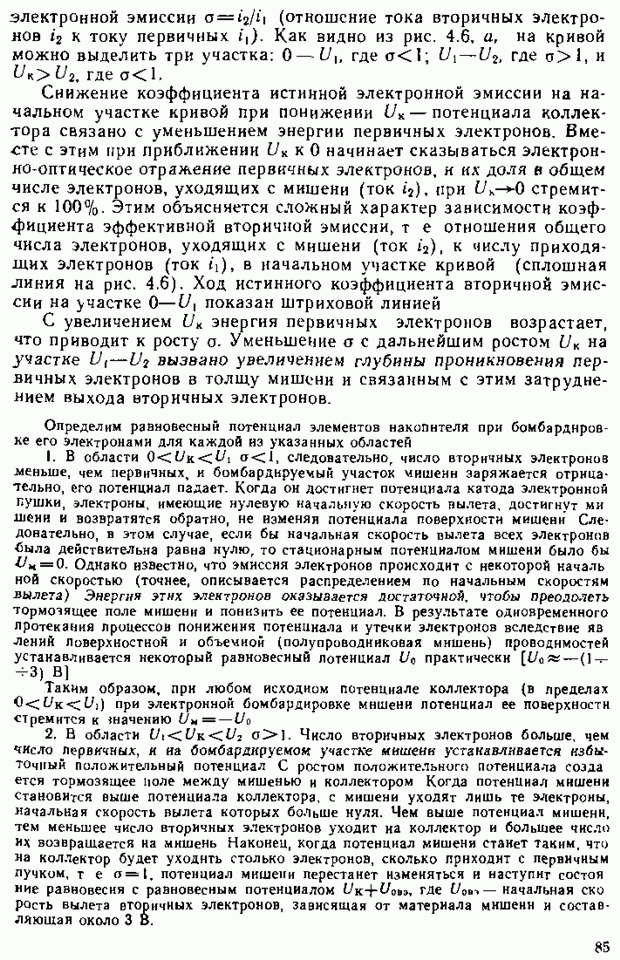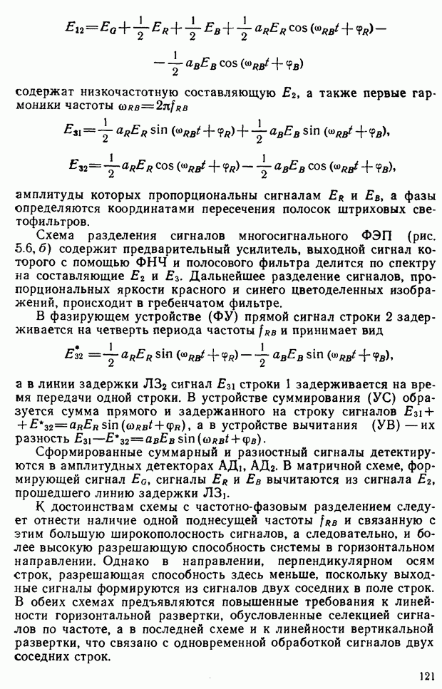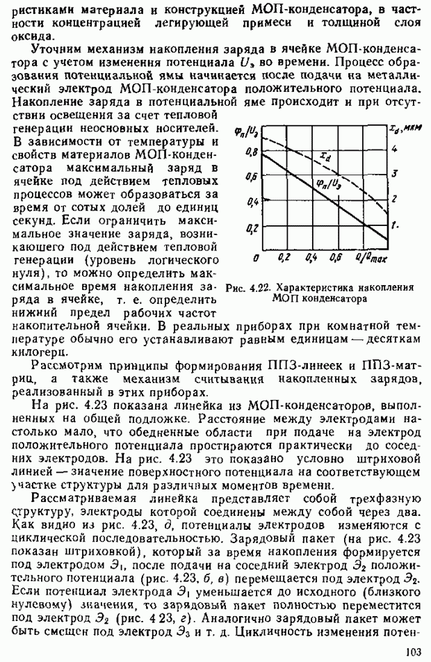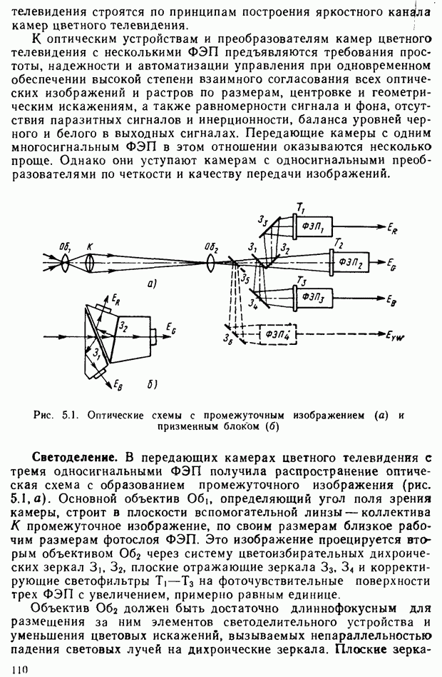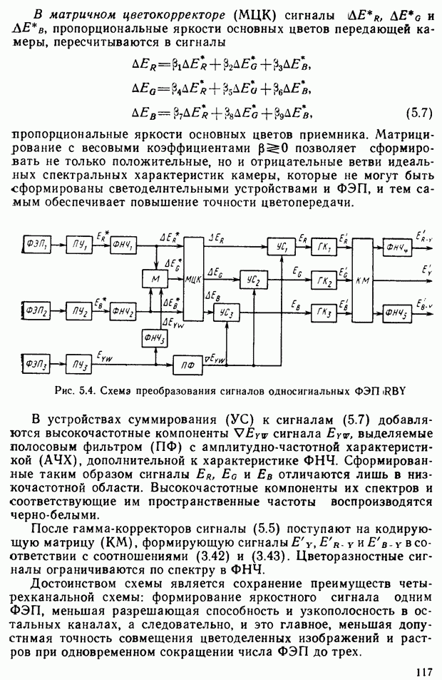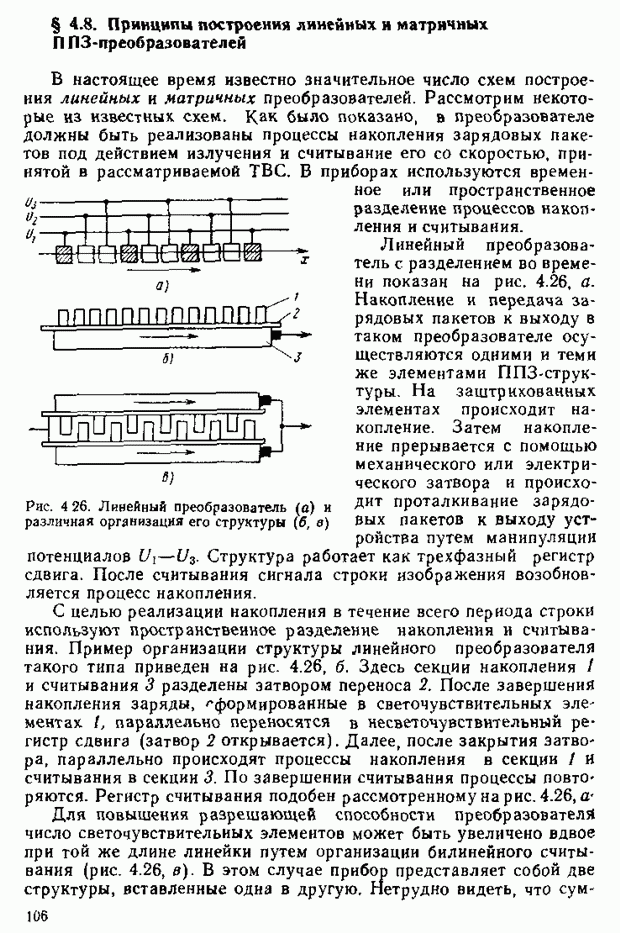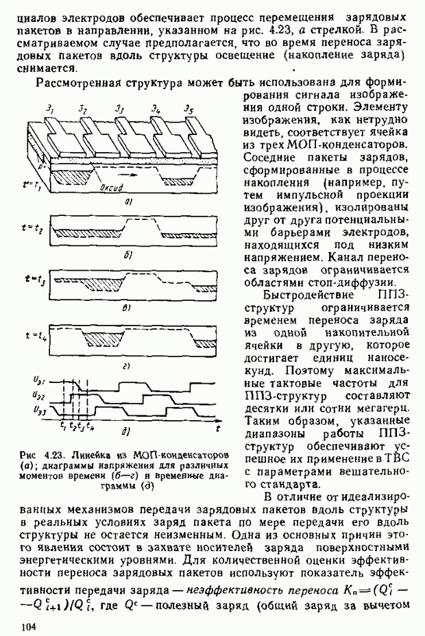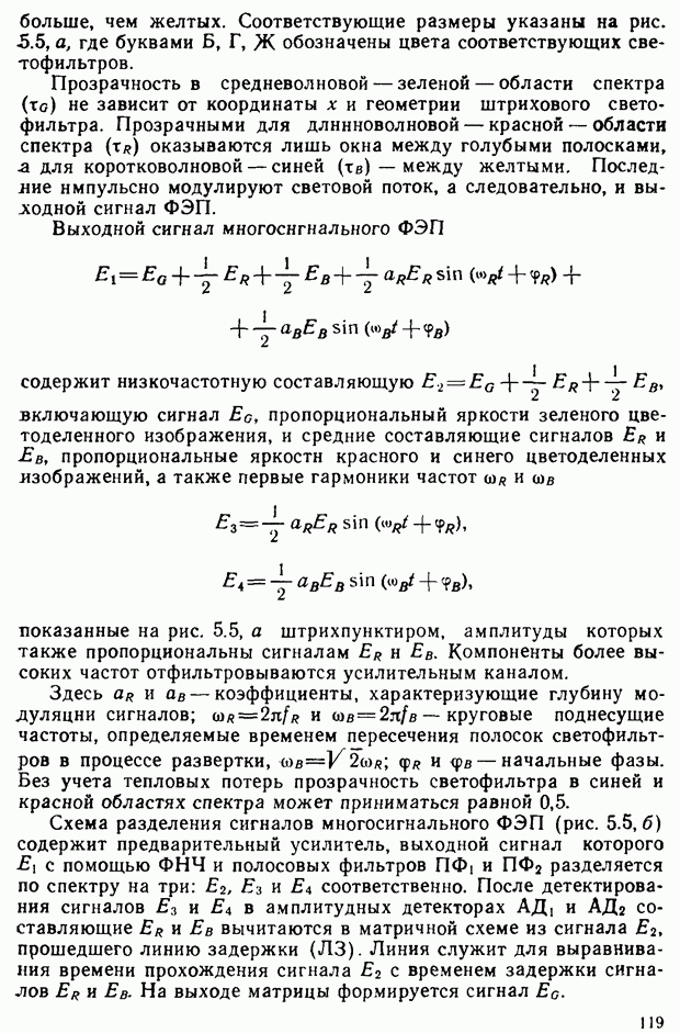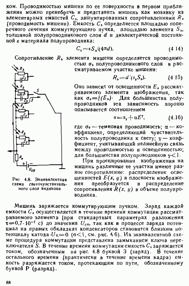 § 4.4. Видиконы с оксидно-свинцовой мишеньюОтечественные преобразователи с оксидно - свинцовой мишенью (ОСМ) относят к классу видиконов Оксидно-свинцовая мишень наносится на полупрозрачную сигнальную пластину 1. Она включает прослойку полупроводника 2 с электропроводностью Формирование потенциального рельефа происходит на поверхности слоя 4. Для предотвращения «растекания» потенциального рельефа вдоль этого слоя (между соседними элементами мишени, имеющими различный потенциальный рельеф) его толщина берется очень малой, что обеспечивает высокое сопротивление слоя в направлении вцоль мншенн. Коммутация потенциального рельефа осуществляется пучком медленных электронов, следовательно, мишень стабилизируется при потенциале, близком потенциалу катода. Выходной сигнал, снимается с нагрузочного резистора, включенного в цепь сигнальной пластины (см. рис. 4.7). При том, что на сигнальную пластину подается положительный потенциал, вся система представляет собой мозаику При рабочих потенциалах сигнальной пластины в толще мишени создается относительно высокая напряженность электрического поля, обеспечивающая эффективное разделение генерированных светом злектронно - дырочных пар. Ток сигнала при этом оказывается близким току насыщения, что обусловливает высокую линейность характеристики свет — сигнал. Показатель линейности этой характеристики находится в пределах 0,95±0,05. Высокая линейность характеристики преобразования обеспечивает успешное использование этих приборов в камерах цветного телевидения.