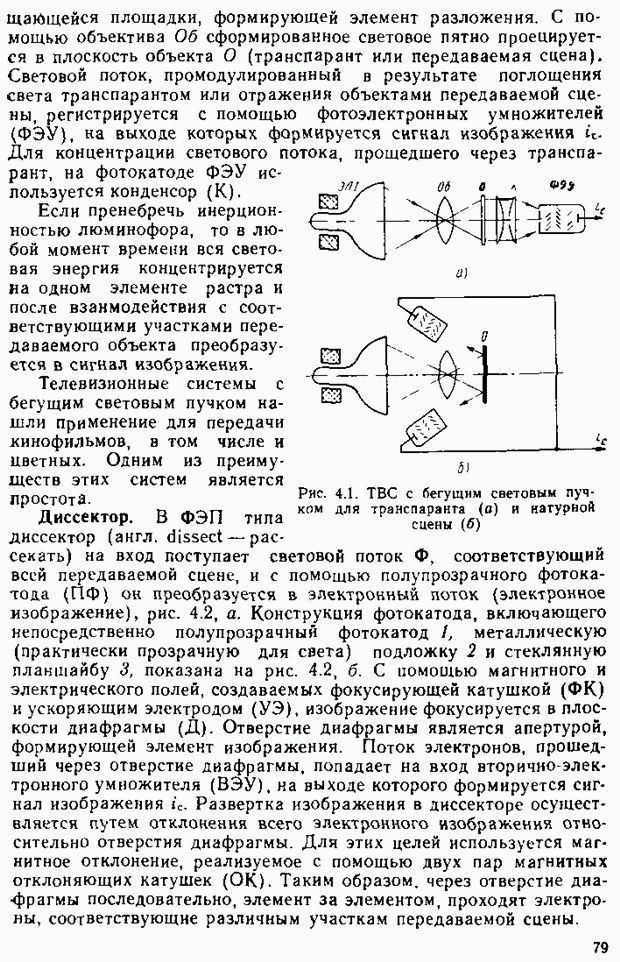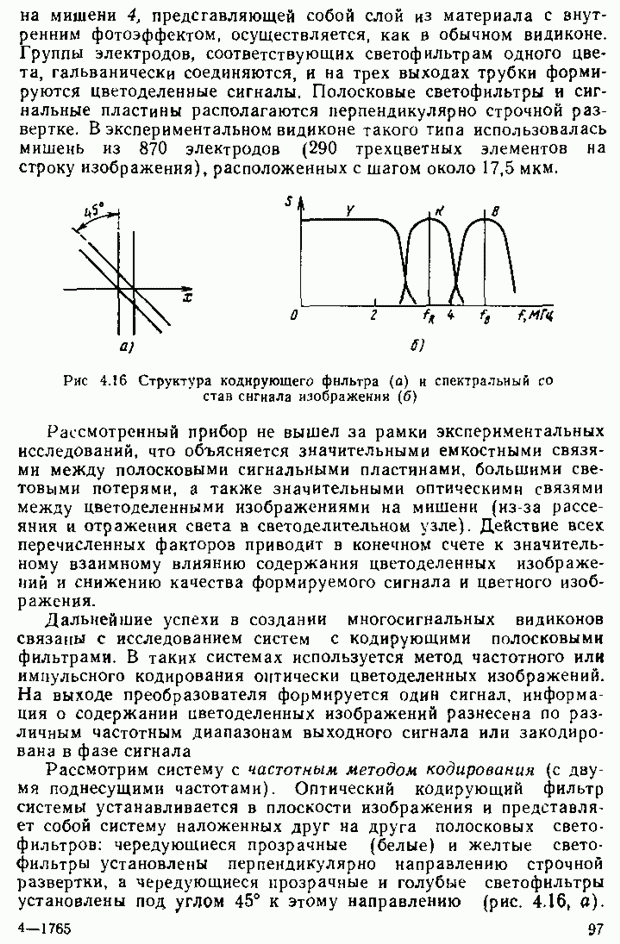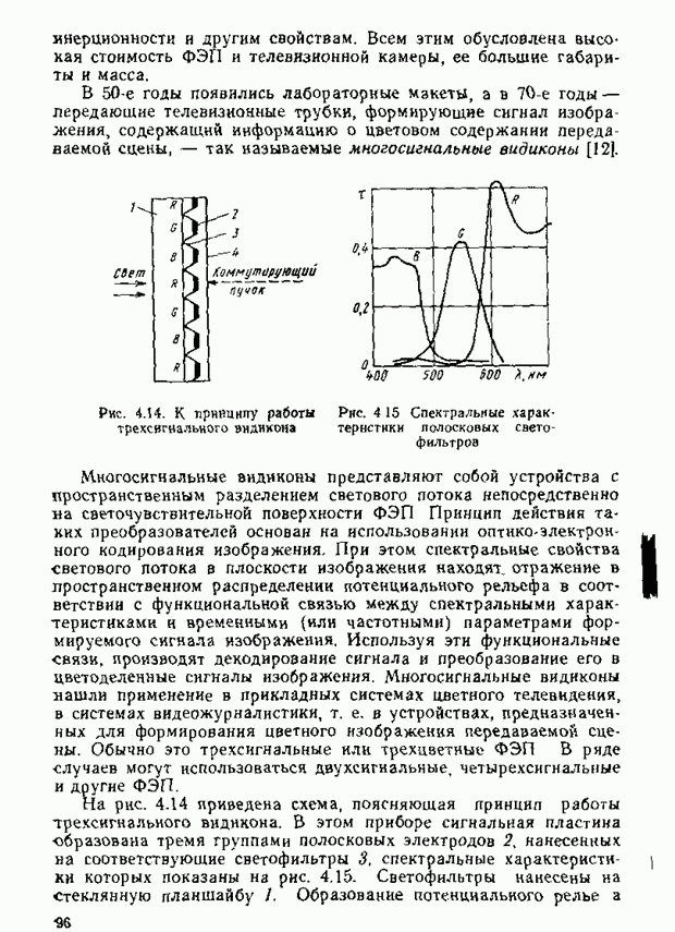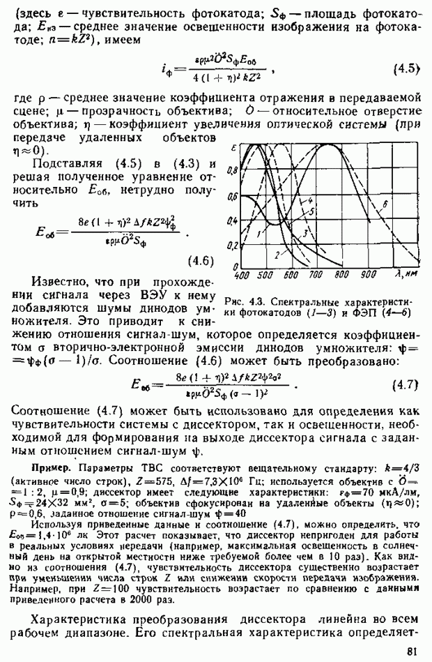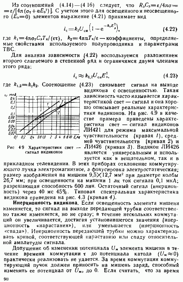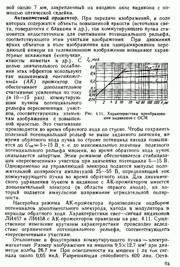 Рис. 4 11. Характеристики преобразовании видиконов с ОСМ Отклонение и фокусировка коммутирующего пучка — электромагнитные Размер изображения на мишени Остаточный сигнал (инерционность) через 40 мс 8-17%. Типовая спектральная характеристика видикона ЛИ458 приведена на рис. 4.3 (кривая 5).