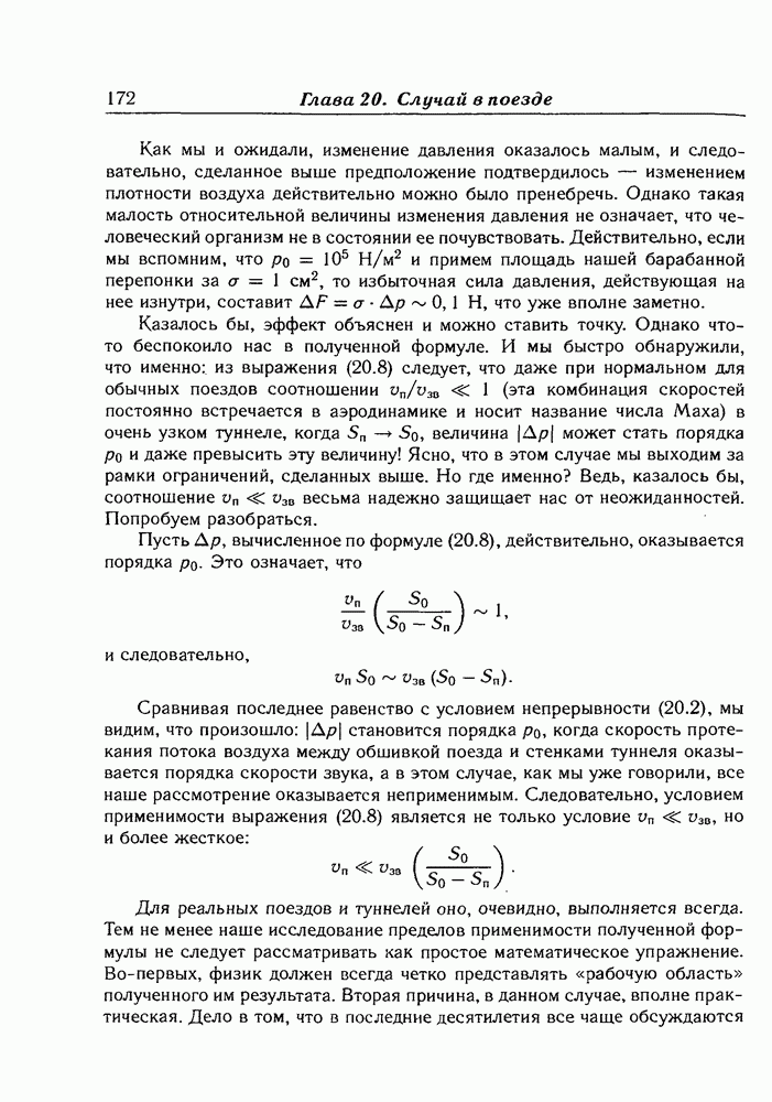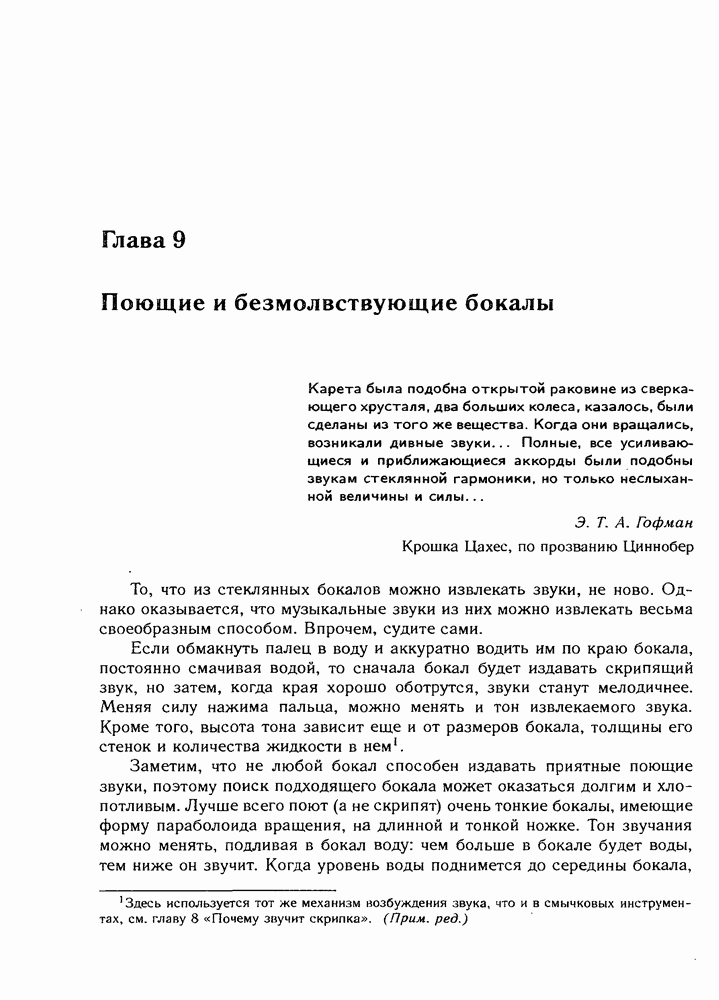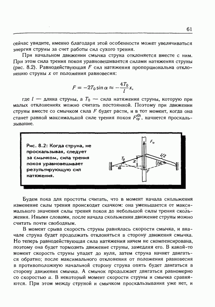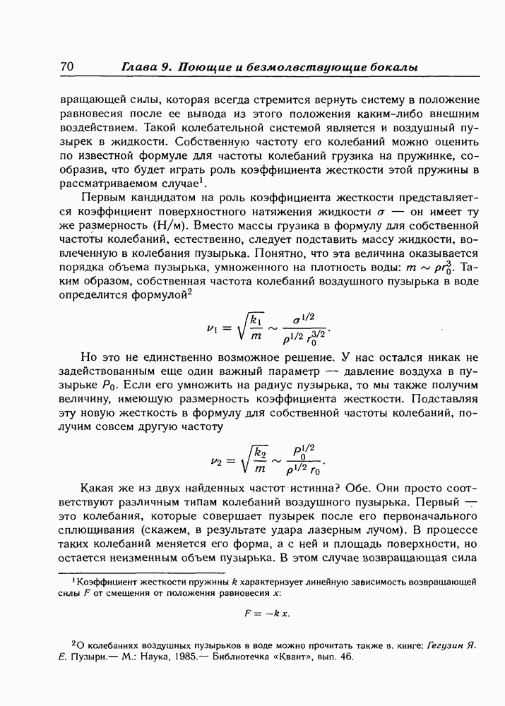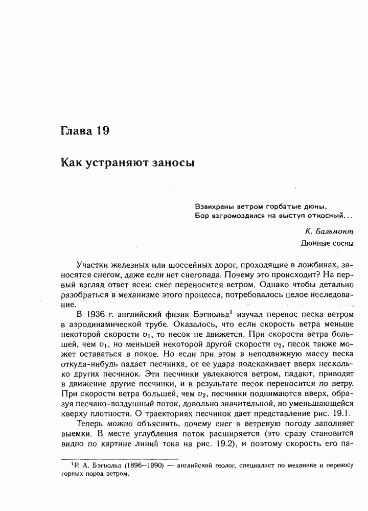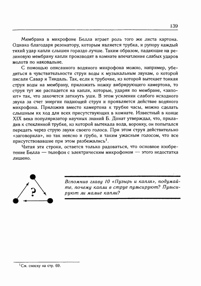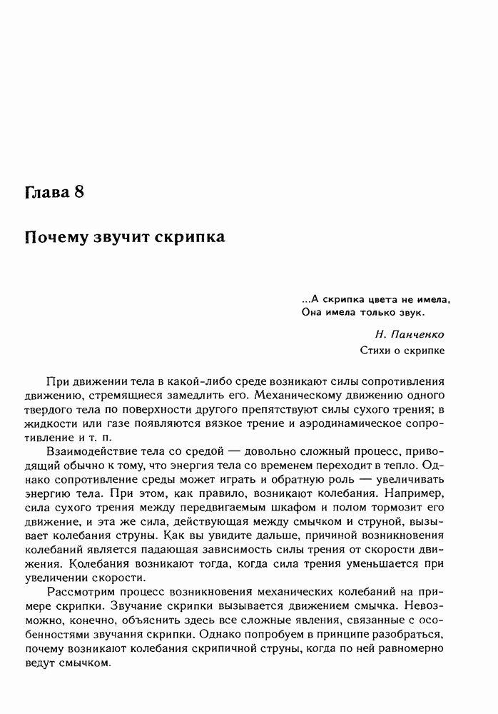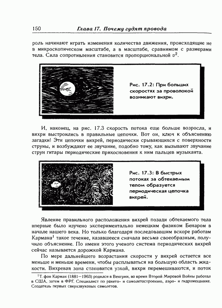 Глава 17. Почему гудят проводаПрохладою дышит Там ветер вечерний, и в листьях шумит И ветви колышет И арфу лобзает... Но арфа молчит... И вдруг. .. из молчанья Поднялся протяжно задумчивый звон. В. Жуковский Эоловая арфа Еще древние греки заметили, что струна, натянутая на ветру, иногда начинает мелодично звучать — петь. Возможно, уже тогда была известна эолова арфа, названная по имени бога ветра Эола. Эолова арфа состоит из рамки, на которой натянуто несколько струн; ее помещают в таком месте, где струны обдуваются ветром. Если даже ограничиться одной струной, можно получить целый ряд различных тонов. Нечто подобное, но с гораздо меньшим разнообразием тонов происходит, когда ветер приводит в движение телеграфные провода. Довольно долго это и многие другие явления, связанные с обтеканием тел воздухом и водой, не были объяснены. Только Ньютон, основоположник современной механики, дал первый научный подход к решению таких задач. По закону сопротивления движению тел в жидкости или газе, открытому Ньютоном, сила сопротивления пропорциональна квадрату скорости: