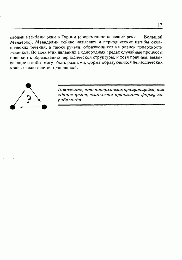 Рис. 17.3: В быстрых потоках за обтекаемым телом образуется периодическая цепочка вихрей. Явление правильного расположения вихрей позади обтекаемого тела впервые было изучено экспериментально немецким физиком Бенаром в начале нашего века. Но только благодаря последовавшим вскоре работам Кармана такое течение, казавшееся сначала весьма своеобразным, получило объяснение. По имени этого ученого система периодических вихрей сейчас называется дорожкой Кармана. По мере дальнейшего возрастания скорости у вихрей остается все меньше и меньше времени, чтобы расплываться на большую область жидкости. Вихревая зона становится узкой, вихри перемешиваются, и поток становится хаотичным и нерегулярным (турбулентным). Правда, при очень больших скоростях в экспериментах последнего времени обнаружено появление какой-то новой периодичности, но детали ее до сих пор пока еще не ясны. Может показаться, что вихревая дорожка Кармана — просто красивое явление природы, не имеющее практического значения. Но это не так. Провода линий электропередачи также колеблются под действием ветра, дующего с постоянной скоростью, из-за отрыва вихрей. В местах крепления проводов к опорам возникают значительные усилия, которые могут приводить к разрушениям. Под действием ветра раскачиваются высокие дымовые трубы.