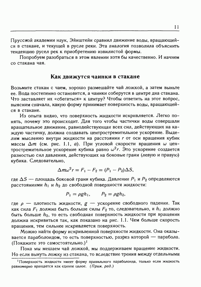 Здесь В дальнейшем выяснилось, что формула Ньютона верна не всегда. В том случае, когда скорость движения тела мала по сравнению со скоростями теплового движения молекул, закон сопротивления Ньютона уже не справедлив. Как мы уже обсуждали в предыдущих разделах, при достаточно медленном движении тела сила сопротивления пропорциональна его скорости (закон Стокса), а не ее квадрату, как это происходит при быстром движении. Такая ситуация возникает, например, при движении мелких капель дождя в облаке, при оседании осадка в стакане, при движении капель вещества А в «Волшебной лампе». Однако в современной технике с ее стремительными скоростями обычно справедлив закон сопротивления Ньютона. Казалось бы, раз известны законы сопротивления, можно объяснить гудение проводов или пение эоловой арфы. Но это не так. Ведь если бы сила сопротивления была постоянной (или росла с увеличением скорости), то ветер просто натягивал бы струну, а не возбуждал ее звучания. В чем же дело? Чтобы объяснить звучание струны, оказывается недостаточно тех простых представлений о силе сопротивления, которые мы только что разобрали. Давайте обсудим более детально некоторые типы течения жидкости вокруг неподвижного тела (это удобнее, чем рассматривать движение тела в неподвижной жидкости, а ответ, разумеется, будет тот же). Посмотрите на рис. 17.1. Это случай малой скорости жидкости. Линии тока жидкости огибают цилиндр (на рисунке показано сечение) и плавно продолжаются за ним. Такой поток называется ламинарным. Сила сопротивления в этом случае обязана своим происхождением внутреннему трению в жидкости (вязкости) и пропорциональна