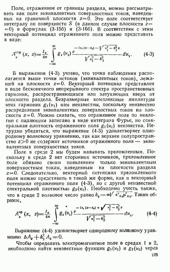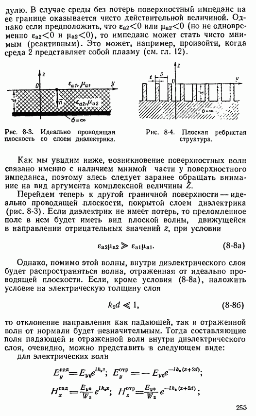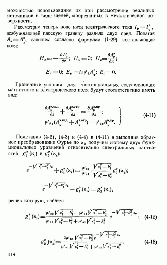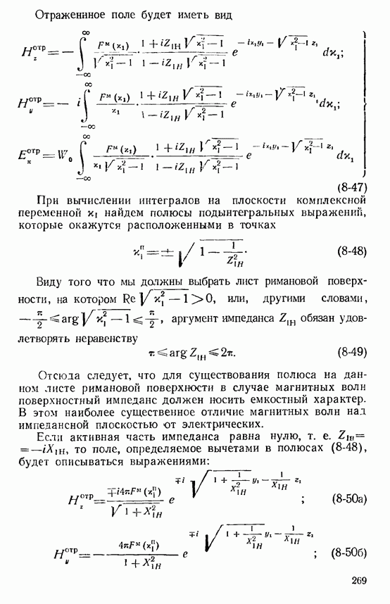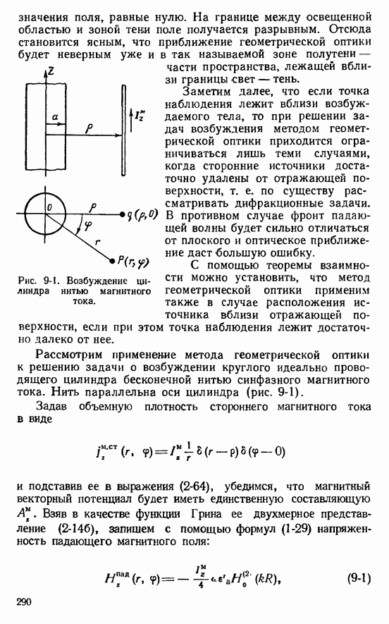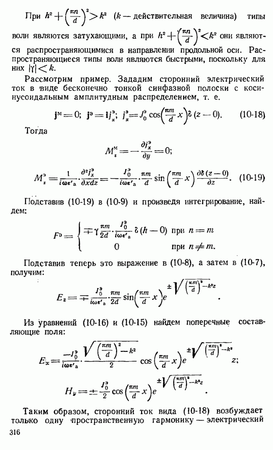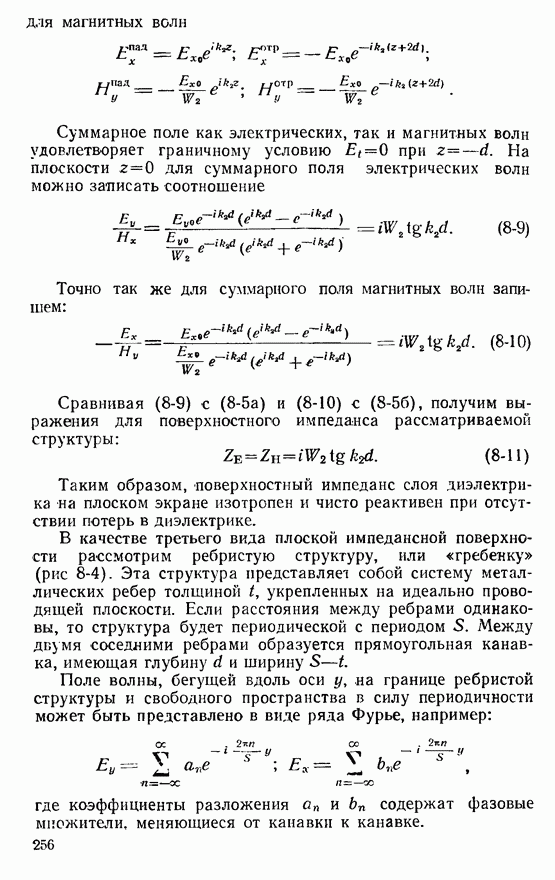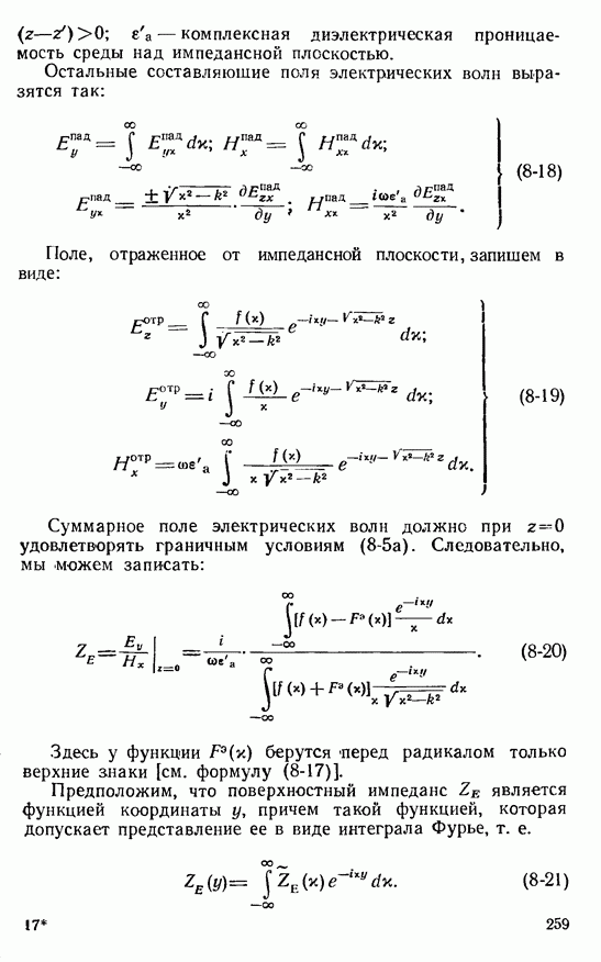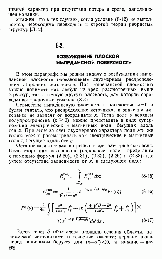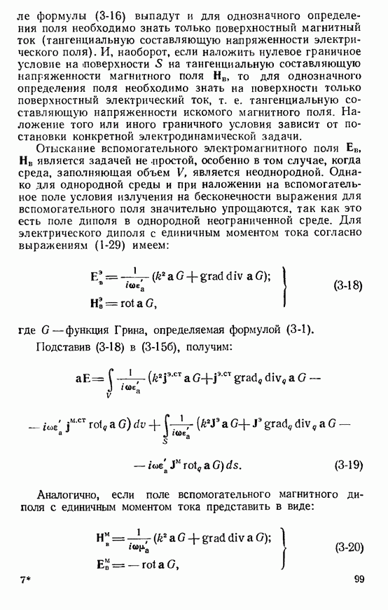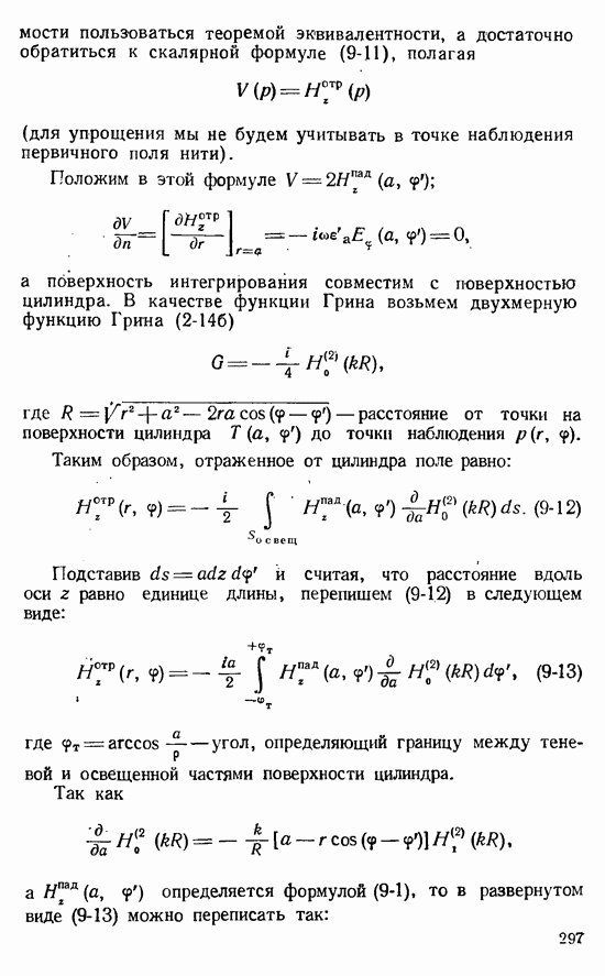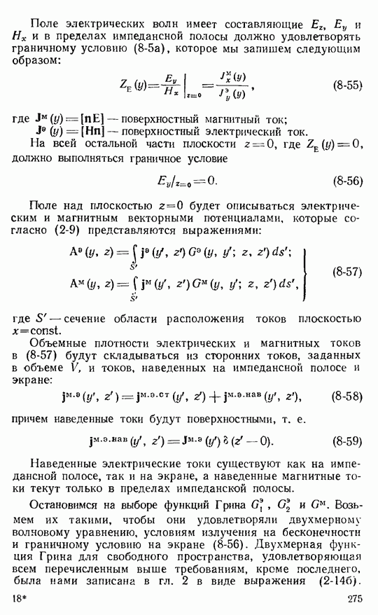 Наведенные электрические токи существуют как на импедансной полосе, так и на экране, а наведенные магнитные токи текут только в пределах импеданской полосы. Остановимся на выборе функций Грина Взяв сумму и разность выражений (2-146), можно получить функции Грина, удовлетворяющие поставленным требованиям. Если мы теперь с помощью формул (1-29) и (8-57) найдем поле