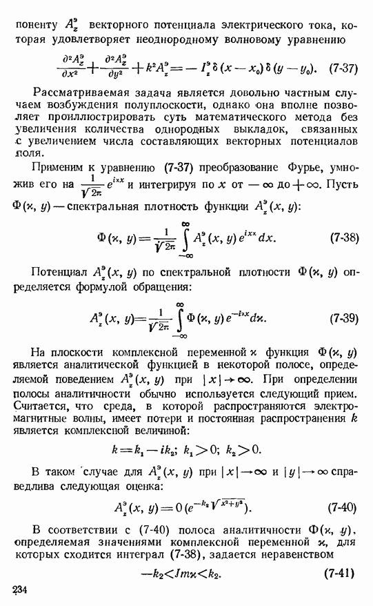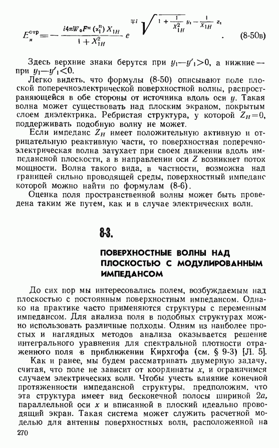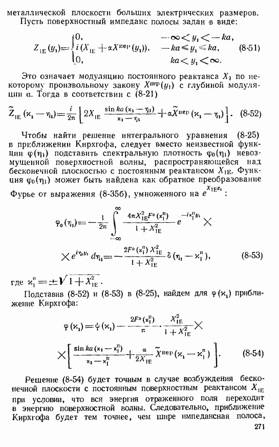 8-4. РАСЧЕТ ТОКОВ НА ИМПЕДАНСНОЙ ПЛОСКОСТИ МЕТОДОМ ИНТЕГРАЛЬНЫХ УРАВНЕНИЙРассмотренное в предыдущем параграфе решение задачи о возбуждении полосы с модулированным импедансом в приближении Кирхгофа хотя и отличается простотой, в силу упомянутых выше ограничений может носить лишь оценочный характер. К тому же необходимость вычисления интегралов Фурье от сложных спектральных плотностей позволяет, как правило, найти лишь поле в дальней зоне, когда эти интегралы можно оценить методом перевала.