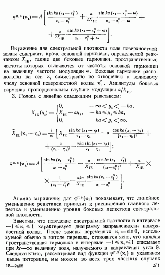 Порядок системы (8-63) равен Очевидно, что нам достаточно решить любое из двух уравнений, так как по найденному электрическому току мы всегда с помощью (8-55) можем определить магнитный ток и наоборот. С другой стороны, при вычислении поля над плоскостью Поле над плоскостью Рассмотрим несколько распределений токов на импедансной полосе, рассчитанных методом Крылова — Боголюбова на электронных вычислительных машинах. Во всех случаях ширина полосы будет равна свободном пространстве), а импеданс полосы будет чисто реактивным. Сторонний источник будет задан в виде нити магнитного тока, лежащей на левом краю полосы