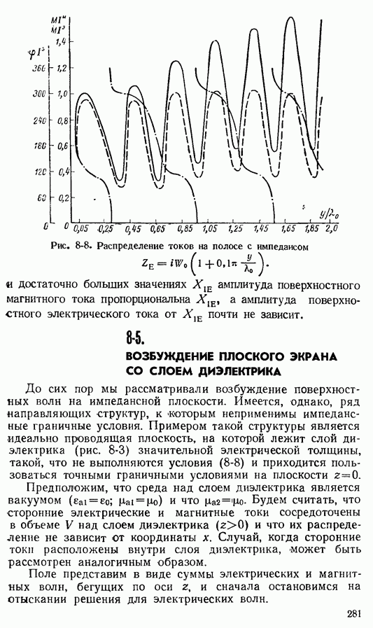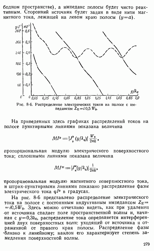 пропорциональная модулю магнитного поверхностного тока, и штрих-пунктирными линиями показано распределение фазы электрического тока На рис. 8-6 представлено распределение электрического тока на полосе с постоянным индуктивным импедансом На рис. 8-7 приведена картина распределения токов на полосе с линейно убывающим поверхностным реактансом