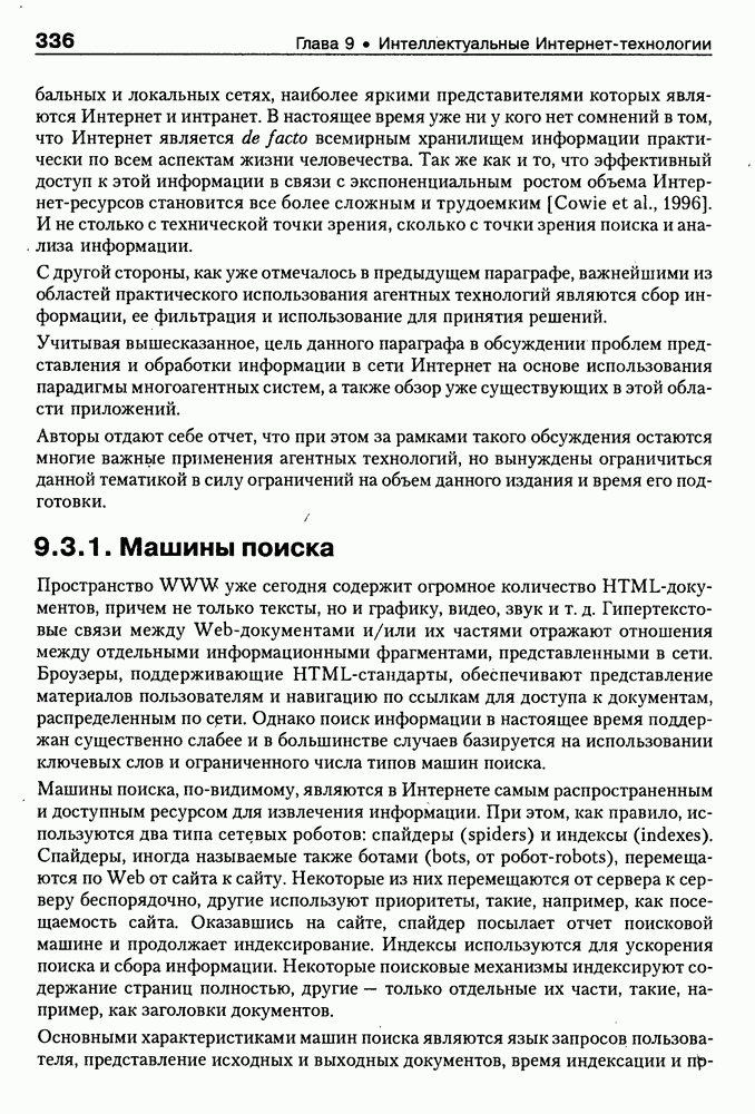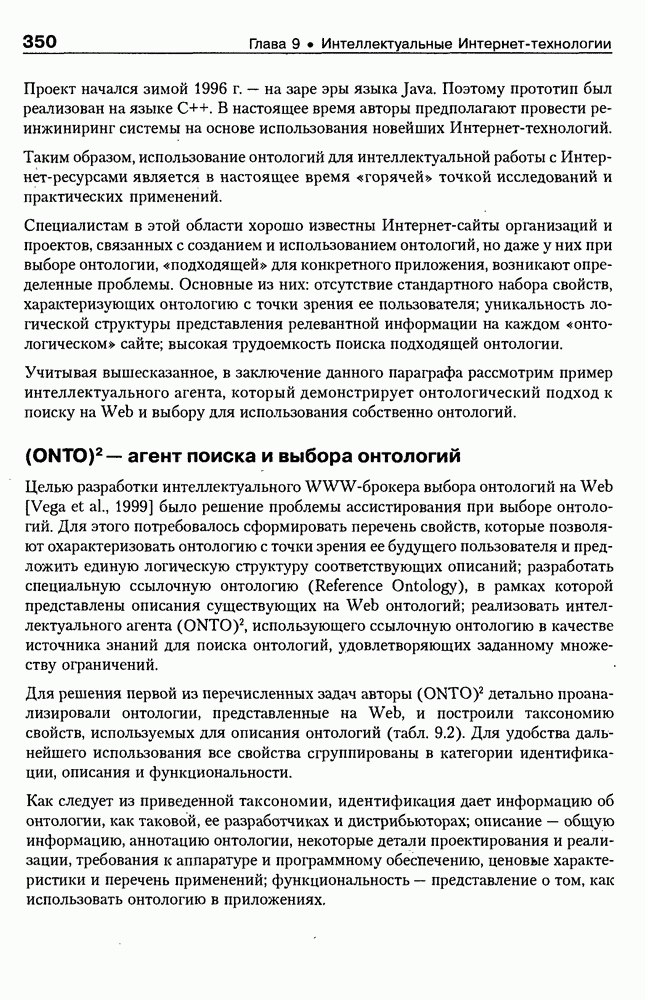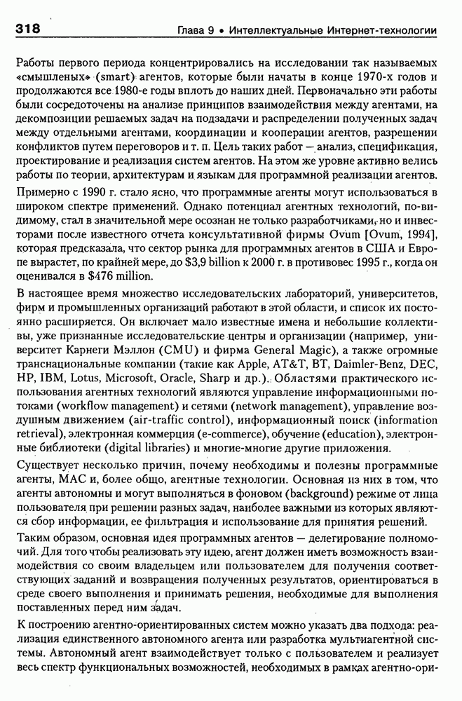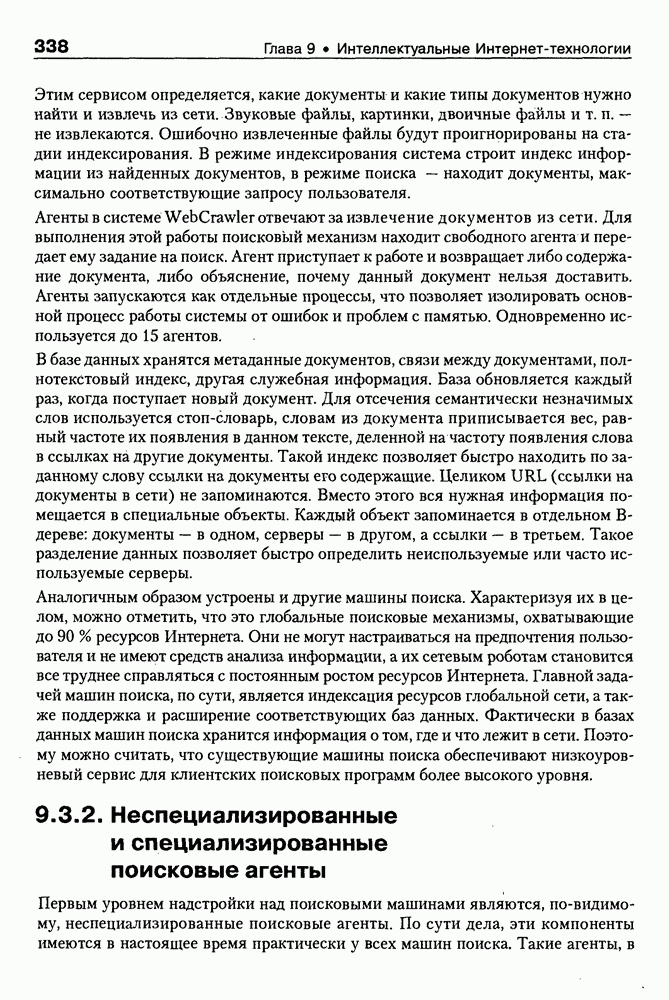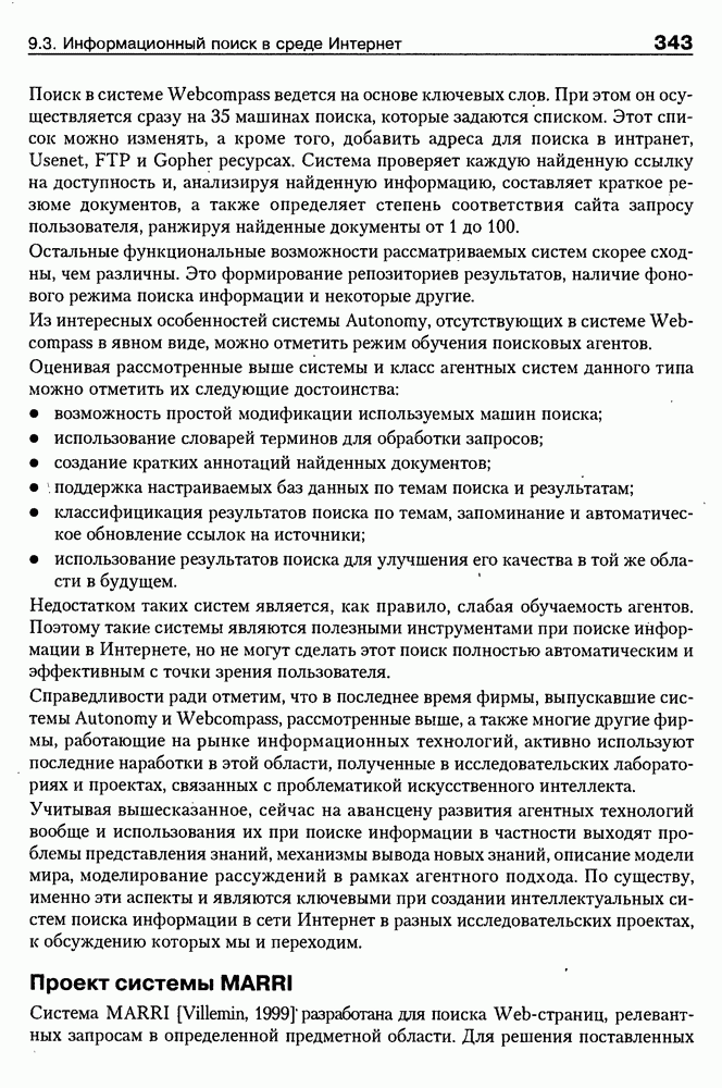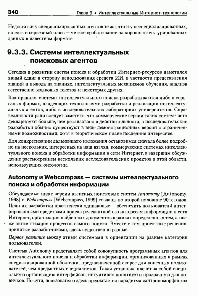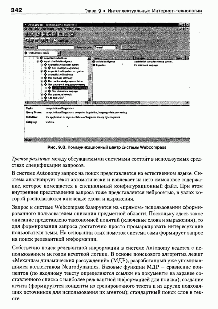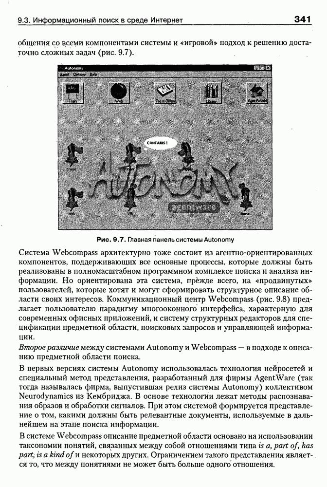 9.3.3. Системы интеллектуальных поисковых агентовСегодня в развитии систем поиска и обработки Интернет-ресурсов наметился явный сдвиг в сторону использования средств ИИ, в частности представления знаний и вывода на знаниях, интеллектуальных механизмов обучения, анализа естественно-языковых текстов и некоторых других. Как правило, системы интеллектуального поиска разрабатываются либо в серьезных фирмах, владеющих технологиями разработки и реализации интеллектуальных агентов, либо в исследовательских лабораториях университетов. Справедливости ради следует заметить, что коммерческие версии таких систем часто декларируют больше, чем реализовано в действительности, а исследовательские разработки обычно существуют в виде демонстрационных версий с ограниченными возможностями, хотя в теоретическом плане последние интереснее. Для конкретизации дальнейшего изложения остановимся сначала более подробно на нескольких, интересных на наш взгляд, коммерческих системах интеллектуального поиска и обработки информации в сети Интернет, а завершим обсуждение рассмотрением нескольких исследовательских проектов в этой области, использующих онтологии. Autonomy и Webcompass — системы интеллектуального поиска и обработки информацииОбсуждаемые ниже версии агентных поисковых систем Autonomy [Autonomy, 1998] и Webcompass [Webcompass 1999] созданы во второй половине 90-х годов. Цели их разработки практически одинаковые — обеспечить пользователя интегрированными средствами поиска релевантной его интересам информации в сети Интернет, организация найденных документов в рамках определенных тем, а также автоматизация процессов самого поиска. Вместе с тем проектные решения, принятые разработчиками, здесь существенно разные. Первое различие между этими системами в ориентации на разные категории пользователей. Система Autonomy представляет собой совокупность программных агентов для интеллектуального поиска и обработки информации, организованных в рамках специализированной оболочки, предназначенной скорее для конечных пользователей, чем предметных специалистов. Такая установка влечет за собой специальную организацию интерфейсов, интуитивно понятную и прозрачную для новичков. По сути, пользователю здесь предлагается парадигма «антропоморфного» общения со всеми компонентами системы и «игровой» подход к решению достаточно сложных задач (рис. 9.7). (см. скан) Рис. 9.7. Главная панель системы Autonomy Система Webcompass архитектурно тоже состоит из агентно-ориентированных компонентов, поддерживающих все основные процессы, которые должны быть реализованы в полномасштабном программном комплексе поиска и анализа информации. Но ориентирована эта система, прежде всего, на «продвинутых» пользователей, которые хотят и могут сформировать структурное описание области своих интересов. Коммуникационный центр Webcompass (рис. 9.8) предлагает пользователю парадигму многооконного интерфейса, характерную для современных офисных приложений, и систему структурных редакторов для спецификации предметной области, поисковых запросов и управляющей информации. Второе различие между системами Autonomy и Webcompass — в подходе к описанию предметной области поиска. В первых версиях системы Autonomy использовалась технология нейросетей и специальный метод представления, разработанный для фирмы AgentWare (так