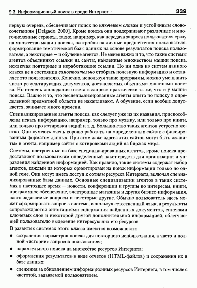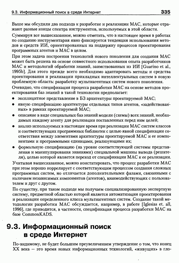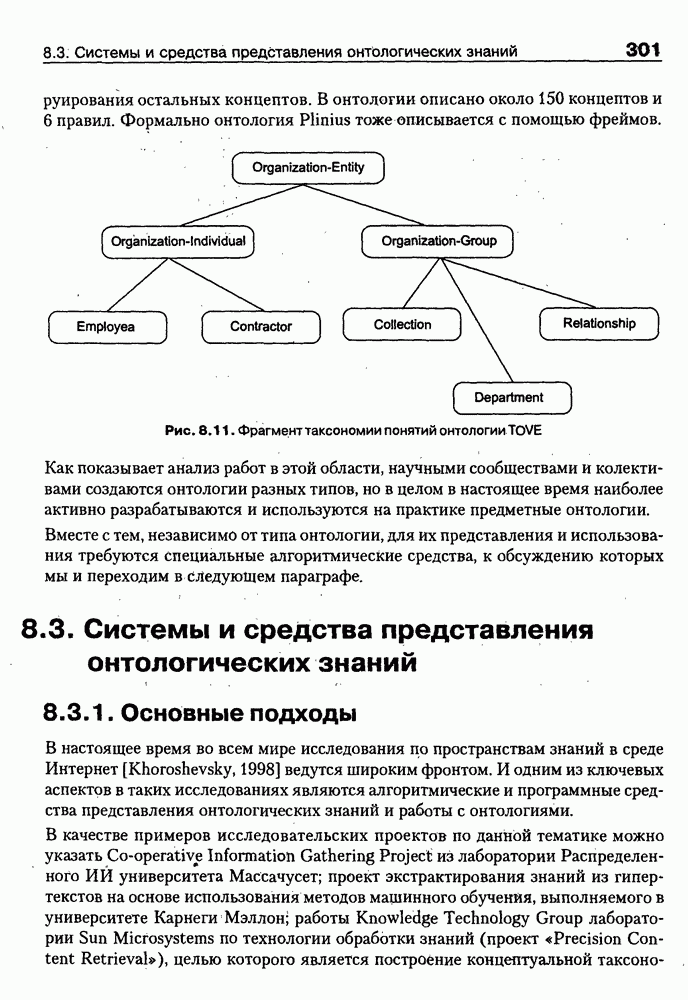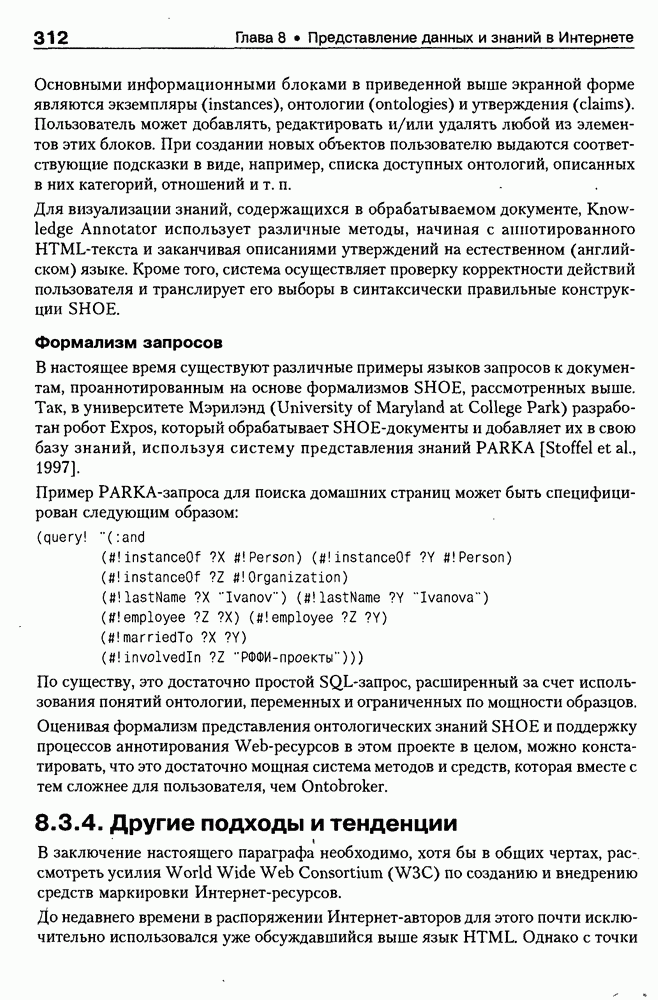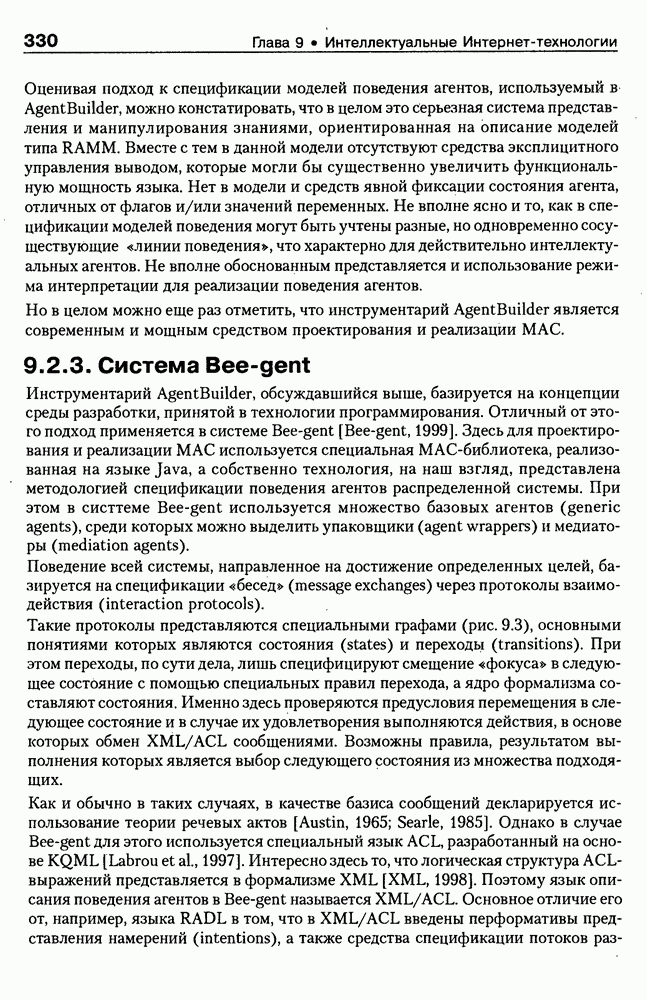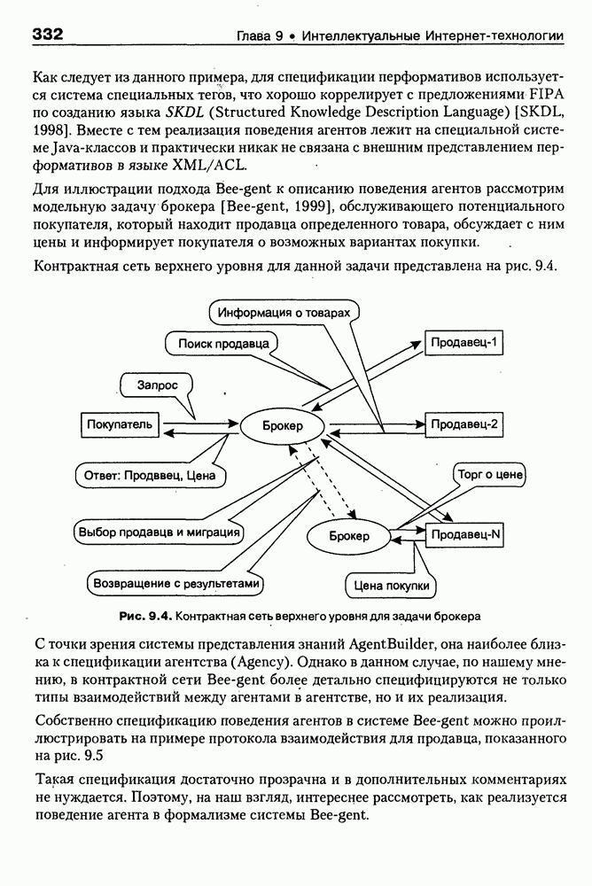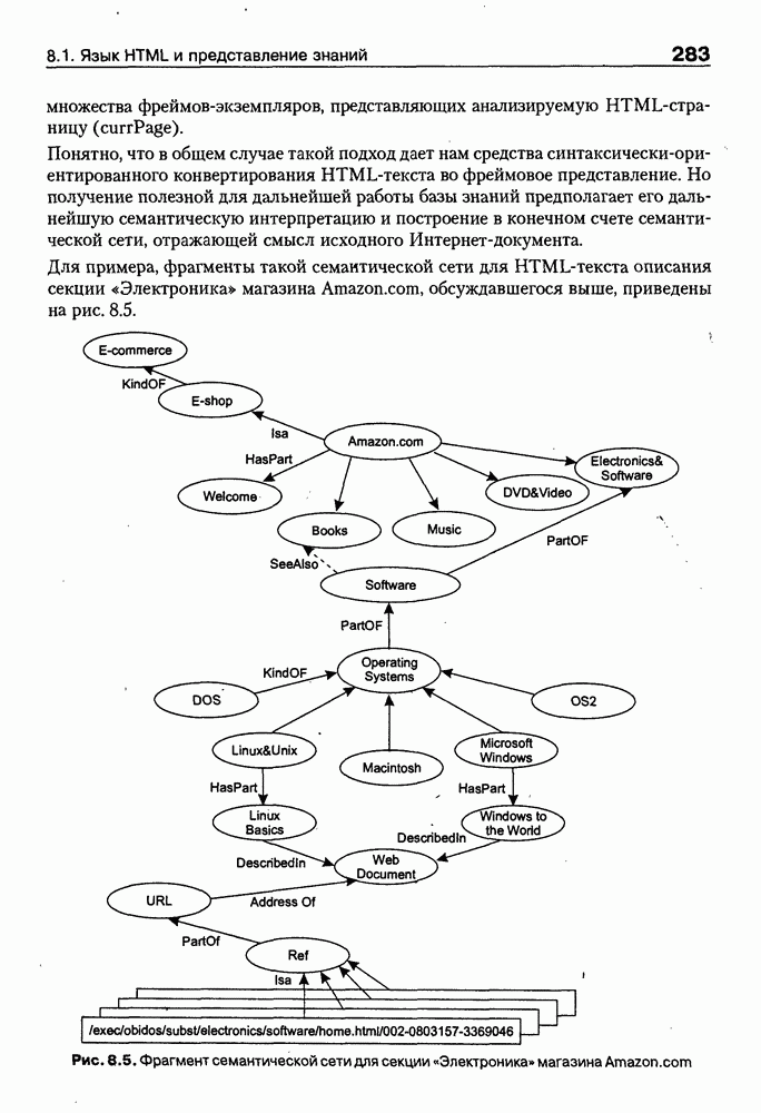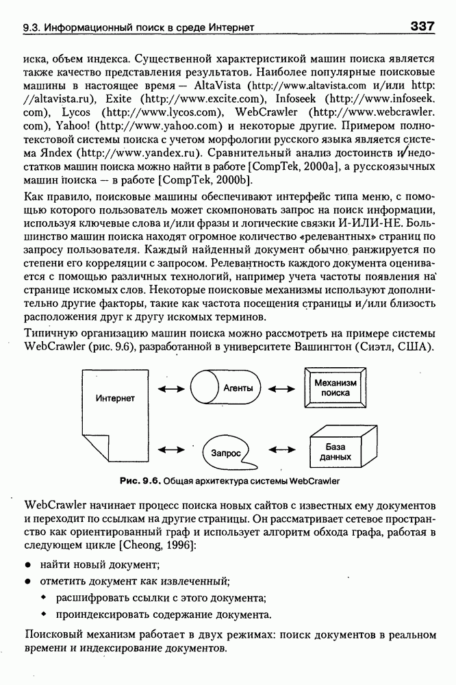 9.3.3. Системы интеллектуальных поисковых агентовСегодня в развитии систем поиска и обработки Интернет-ресурсов наметился явный сдвиг в сторону использования средств ИИ, в частности представления знаний и вывода на знаниях, интеллектуальных механизмов обучения, анализа естественно-языковых текстов и некоторых других. Как правило, системы интеллектуального поиска разрабатываются либо в серьезных фирмах, владеющих технологиями разработки и реализации интеллектуальных агентов, либо в исследовательских лабораториях университетов. Справедливости ради следует заметить, что коммерческие версии таких систем часто декларируют больше, чем реализовано в действительности, а исследовательские разработки обычно существуют в виде демонстрационных версий с ограниченными возможностями, хотя в теоретическом плане последние интереснее. Для конкретизации дальнейшего изложения остановимся сначала более подробно на нескольких, интересных на наш взгляд, коммерческих системах интеллектуального поиска и обработки информации в сети Интернет, а завершим обсуждение рассмотрением нескольких исследовательских проектов в этой области, использующих онтологии. Autonomy и Webcompass — системы интеллектуального поиска и обработки информацииОбсуждаемые ниже версии агентных поисковых систем Autonomy [Autonomy, 1998] и Webcompass [Webcompass 1999] созданы во второй половине 90-х годов. Цели их разработки практически одинаковые — обеспечить пользователя интегрированными средствами поиска релевантной его интересам информации в сети Интернет, организация найденных документов в рамках определенных тем, а также автоматизация процессов самого поиска. Вместе с тем проектные решения, принятые разработчиками, здесь существенно разные. Первое различие между этими системами в ориентации на разные категории пользователей. Система Autonomy представляет собой совокупность программных агентов для интеллектуального поиска и обработки информации, организованных в рамках специализированной оболочки, предназначенной скорее для конечных пользователей, чем предметных специалистов. Такая установка влечет за собой специальную организацию интерфейсов, интуитивно понятную и прозрачную для новичков. По сути, пользователю здесь предлагается парадигма «антропоморфного» общения со всеми компонентами системы и «игровой» подход к решению достаточно сложных задач (рис. 9.7). (см. скан) Рис. 9.7. Главная панель системы Autonomy Система Webcompass архитектурно тоже состоит из агентно-ориентированных компонентов, поддерживающих все основные процессы, которые должны быть реализованы в полномасштабном программном комплексе поиска и анализа информации. Но ориентирована эта система, прежде всего, на «продвинутых» пользователей, которые хотят и могут сформировать структурное описание области своих интересов. Коммуникационный центр Webcompass (рис. 9.8) предлагает пользователю парадигму многооконного интерфейса, характерную для современных офисных приложений, и систему структурных редакторов для спецификации предметной области, поисковых запросов и управляющей информации. Второе различие между системами Autonomy и Webcompass — в подходе к описанию предметной области поиска. В первых версиях системы Autonomy использовалась технология нейросетей и специальный метод представления, разработанный для фирмы AgentWare (так