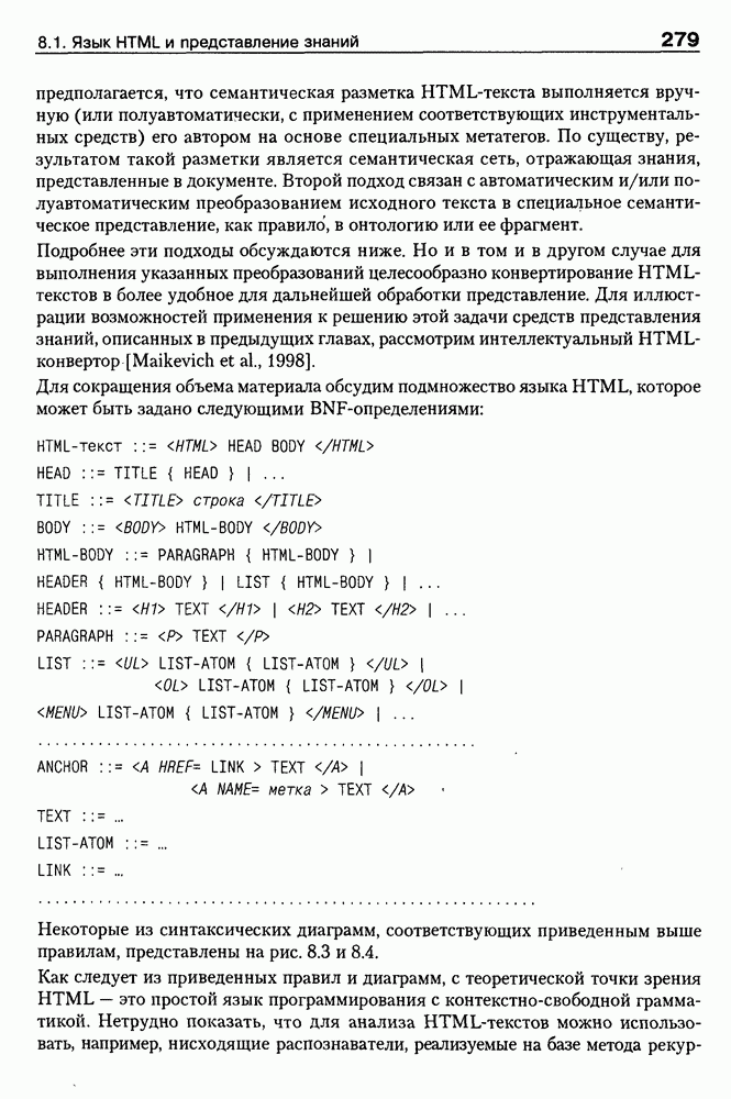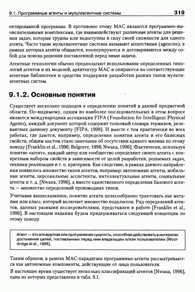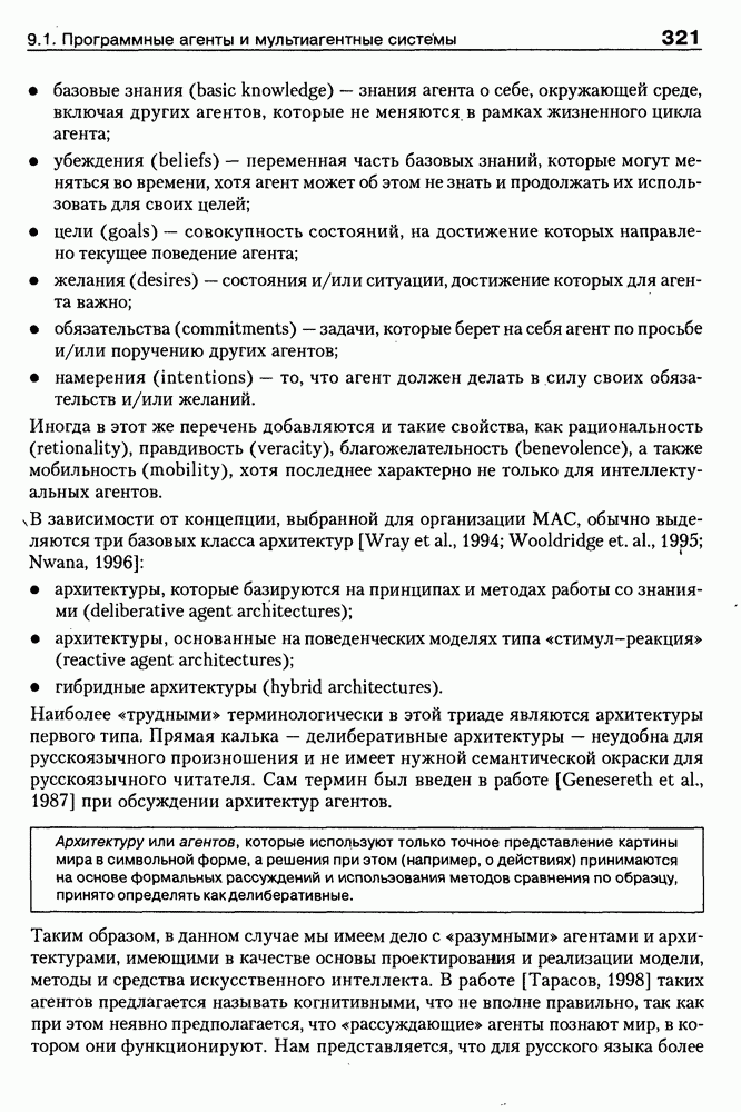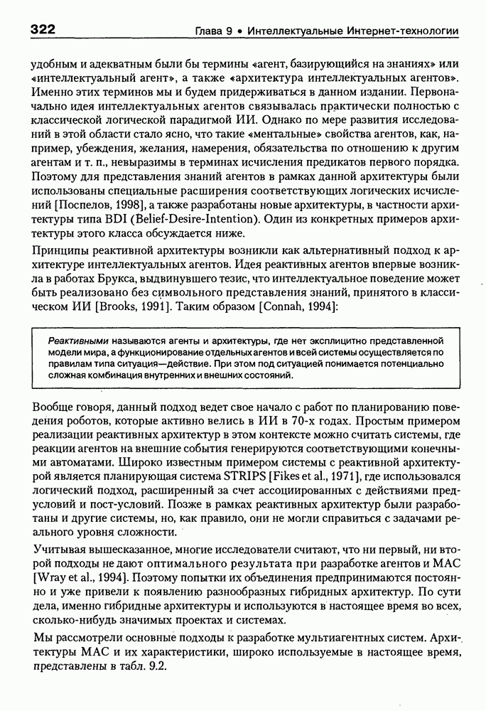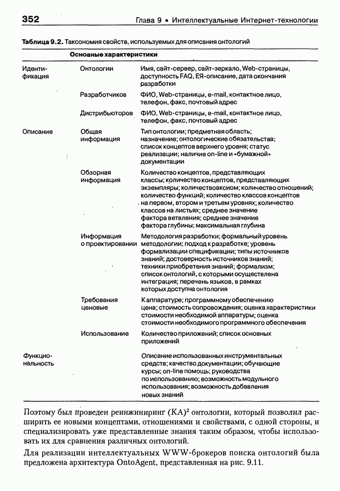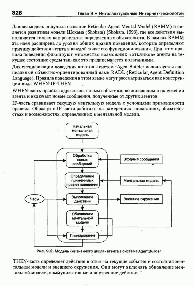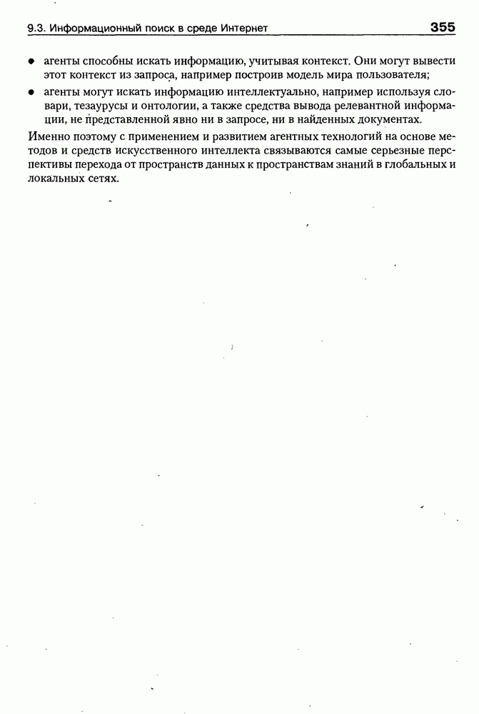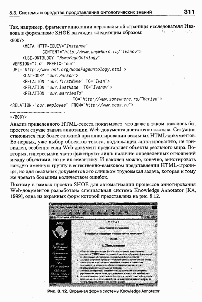 9.3.3. Системы интеллектуальных поисковых агентовСегодня в развитии систем поиска и обработки Интернет-ресурсов наметился явный сдвиг в сторону использования средств ИИ, в частности представления знаний и вывода на знаниях, интеллектуальных механизмов обучения, анализа естественно-языковых текстов и некоторых других. Как правило, системы интеллектуального поиска разрабатываются либо в серьезных фирмах, владеющих технологиями разработки и реализации интеллектуальных агентов, либо в исследовательских лабораториях университетов. Справедливости ради следует заметить, что коммерческие версии таких систем часто декларируют больше, чем реализовано в действительности, а исследовательские разработки обычно существуют в виде демонстрационных версий с ограниченными возможностями, хотя в теоретическом плане последние интереснее. Для конкретизации дальнейшего изложения остановимся сначала более подробно на нескольких, интересных на наш взгляд, коммерческих системах интеллектуального поиска и обработки информации в сети Интернет, а завершим обсуждение рассмотрением нескольких исследовательских проектов в этой области, использующих онтологии. Autonomy и Webcompass — системы интеллектуального поиска и обработки информацииОбсуждаемые ниже версии агентных поисковых систем Autonomy [Autonomy, 1998] и Webcompass [Webcompass 1999] созданы во второй половине 90-х годов. Цели их разработки практически одинаковые — обеспечить пользователя интегрированными средствами поиска релевантной его интересам информации в сети Интернет, организация найденных документов в рамках определенных тем, а также автоматизация процессов самого поиска. Вместе с тем проектные решения, принятые разработчиками, здесь существенно разные. Первое различие между этими системами в ориентации на разные категории пользователей. Система Autonomy представляет собой совокупность программных агентов для интеллектуального поиска и обработки информации, организованных в рамках специализированной оболочки, предназначенной скорее для конечных пользователей, чем предметных специалистов. Такая установка влечет за собой специальную организацию интерфейсов, интуитивно понятную и прозрачную для новичков. По сути, пользователю здесь предлагается парадигма «антропоморфного» общения со всеми компонентами системы и «игровой» подход к решению достаточно сложных задач (рис. 9.7). (см. скан) Рис. 9.7. Главная панель системы Autonomy Система Webcompass архитектурно тоже состоит из агентно-ориентированных компонентов, поддерживающих все основные процессы, которые должны быть реализованы в полномасштабном программном комплексе поиска и анализа информации. Но ориентирована эта система, прежде всего, на «продвинутых» пользователей, которые хотят и могут сформировать структурное описание области своих интересов. Коммуникационный центр Webcompass (рис. 9.8) предлагает пользователю парадигму многооконного интерфейса, характерную для современных офисных приложений, и систему структурных редакторов для спецификации предметной области, поисковых запросов и управляющей информации. Второе различие между системами Autonomy и Webcompass — в подходе к описанию предметной области поиска. В первых версиях системы Autonomy использовалась технология нейросетей и специальный метод представления, разработанный для фирмы AgentWare (так