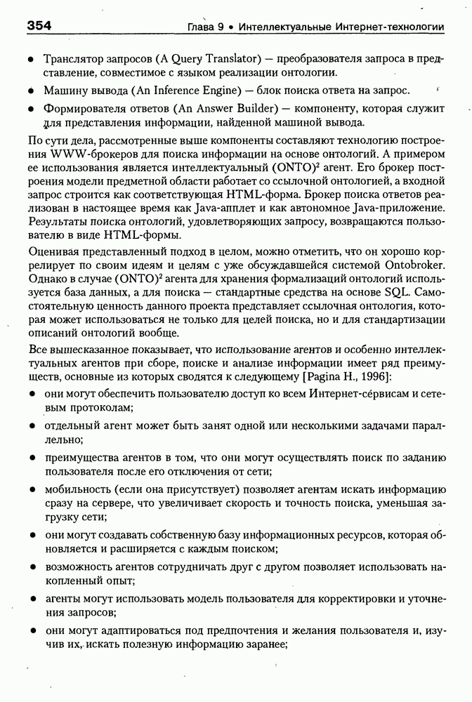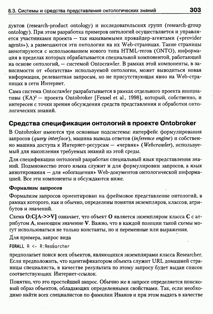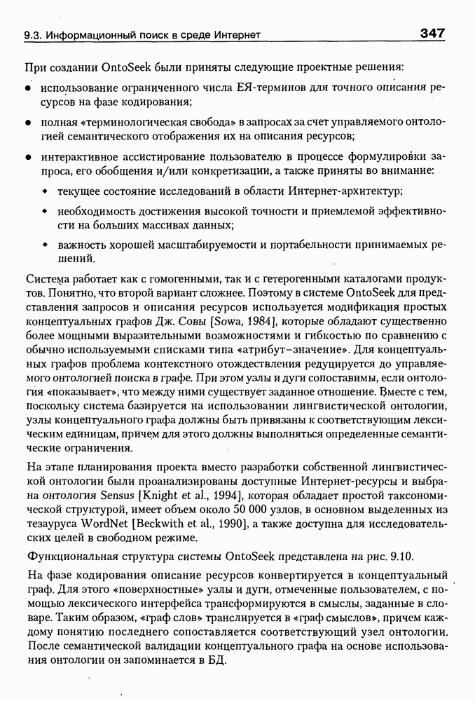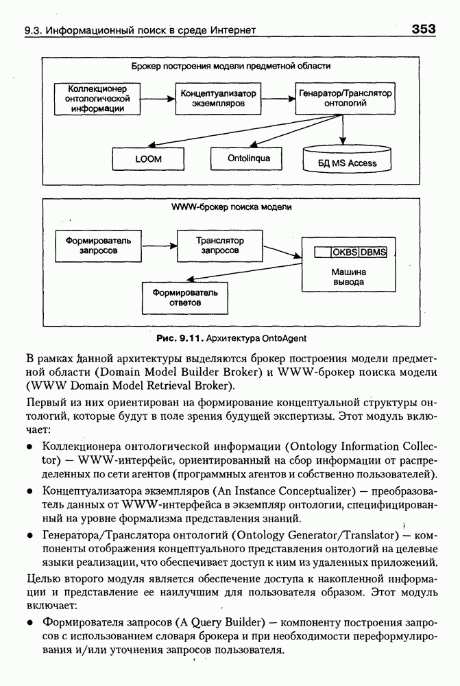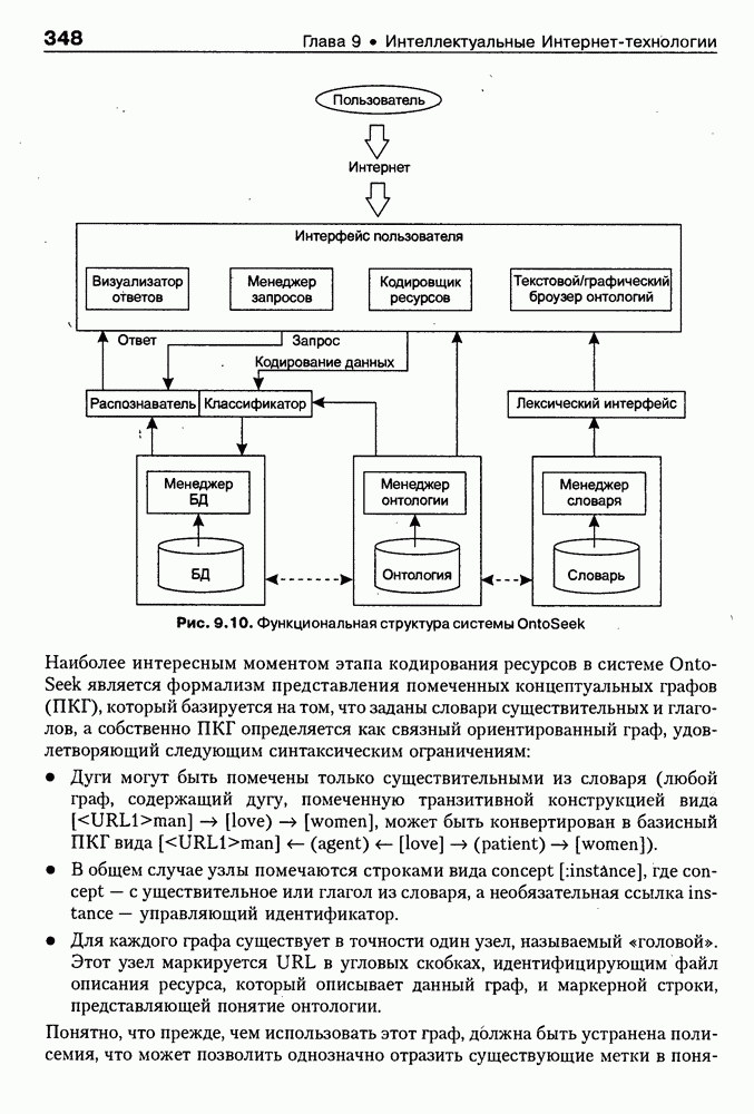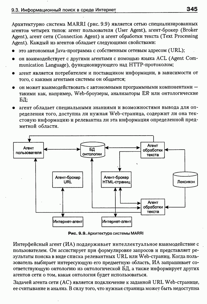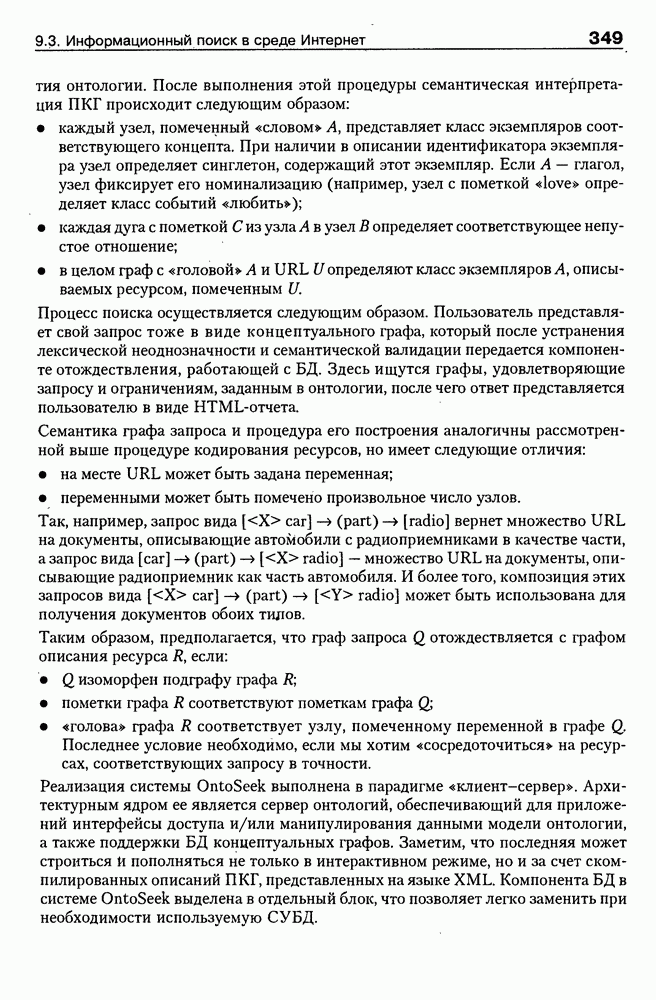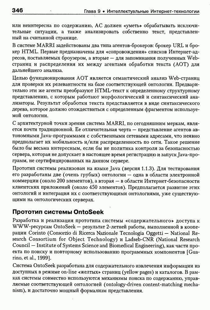 Рис. 9.9. Архитектура системы MARRI Интерфейсный агент (ИА) поддерживает интеллектуальное взаимодействие с пользователем. Он ассистирует при формулировке запросов и представляет результаты поиска в виде списка релевантных URL или Web-страниц. Когда пользователь выбирает интересующую его предметную область, ИА запрашивает соответствующую онтологию из онтологической БД, а также информирует других агентов сети о том, какая онтология будет использоваться. Задачей агента сети (АС) является подключение к заданной URL Web-странице, ее считывание и анализ. В силу того, что нужная страница может быть недоступна или неинтересна по содержанию, АС должен «уметь» обрабатывать исключительные ситуации, а также анализировать собственно текст, представленный на считанной странице. В системе MARRI задействованы два типа агентов-брокеров: брокер URL и брокер HTML. Первые предназначены для «сопровождения» списков Интернет-адресов, поставляемых броузером, а вторые — для запоминания полученных Web-страниц и распределения их между агентами обработки текста (АОТ) для дальнейшего анализа. Целью функционирования АОТ является семантический анализ Web-страниц для проверки их релевантности на базе соответствующей онтологии. Предварительно эти же агенты преобразуют HTML-текст к определенному структурному представлению, с которым работают морфологический и синтаксический анализаторы. Результат обработки текста представляется в виде синтаксического дерева, которое должно отождествиться с определенным фрагментом используемой онтологии. С архитектурной точки зрения система MARRI, по сегодняшним меркам, является почти традиционной. Ее отличительная черта — представление агентов автономными Java-программами с собственными сетевыми адресами, что неявно предполагает их мобильность и/или распределенность по сети. Такое решение было бы весьма интересным, если бы не политика контроля за безопасностью сервера, которая не допускает в настоящее время регистрацию и запуск Java-npoграмм, не сертифицированных на данном сервере. Прототип системы реализован на языке Java (версия 1.1.3). Для тестирования его разработаны две (очень грубых) онтологии — одна в области электронной коммерции (около 200 элементов), а вторая — в области Интернет-безопасности клиентских приложений (около 450 элементов). Предполагается развитие этих онтологий и интеграция их с соответствующими онтологиями, уже существующими на онтологических серверах. Прототип системы OntoSeekРазработка и реализация прототипа системы «содержательного» доступа к WWW-ресурсам OntoSeek — результат 2-летней работы, выполненной в кооперации Corinto (Consorzio di Ricerca Nazionale Tecnologia Oggetti - National Research Consortium for Object Technology) и Ladseb-CNR (National Research Council - Institute of Systems Science and Biomedical Engineering), как части проекта по поиску и повторному использованию программных компонентов [Gua-rino, et al., 1999]. Система OntoSeek разработана для содержательного извлечения информации из доступных в режиме on-line «желтых» страниц (yellow pages) и каталогов. В рамках системы совместно используются механизмы поиска по содержанию, управляемые соответствующей онтологией (ontology-driven content-matching mechanism), и достаточно мощный формализм представления. При создании OntoSeek были приняты следующие проектные решения: • использование ограниченного числа ЕЯ-терминов для точного описания ресурсов на фазе кодирования; • полная «