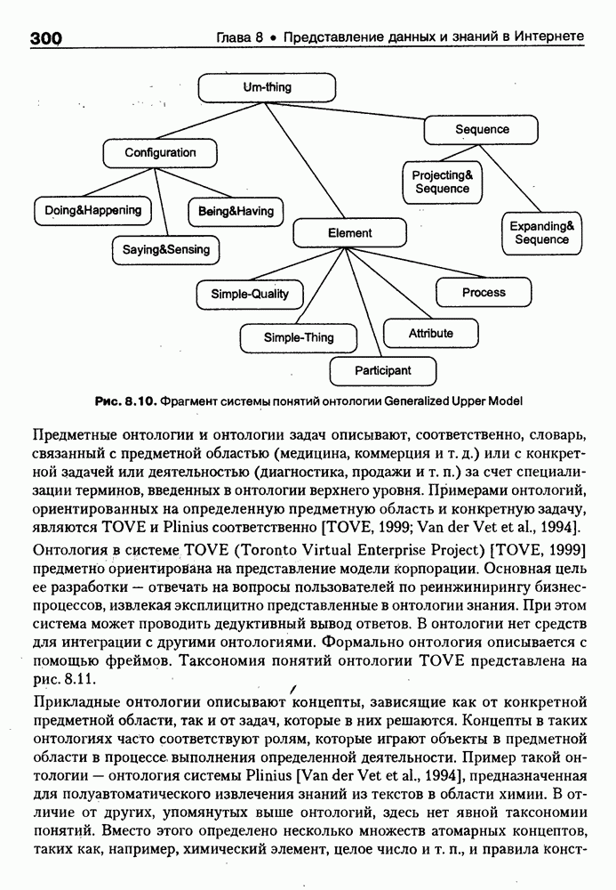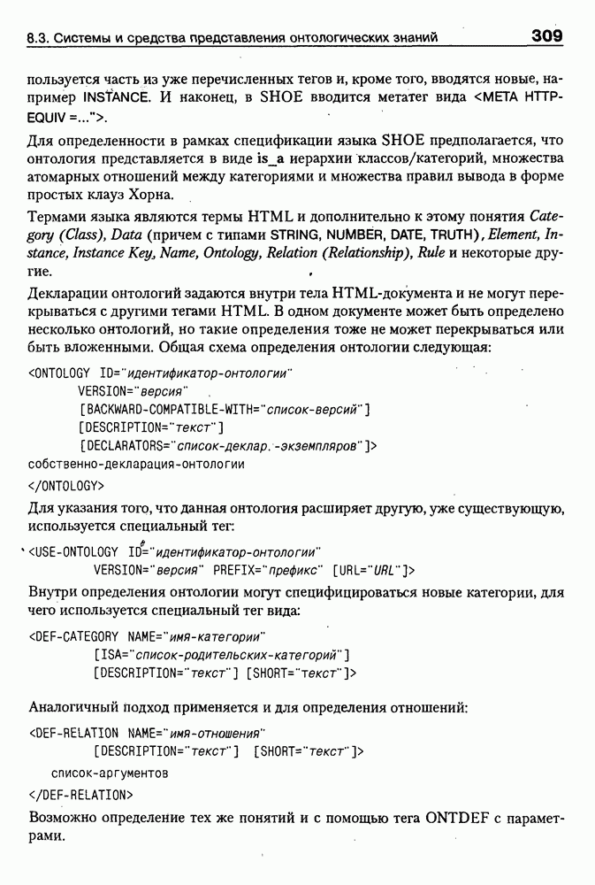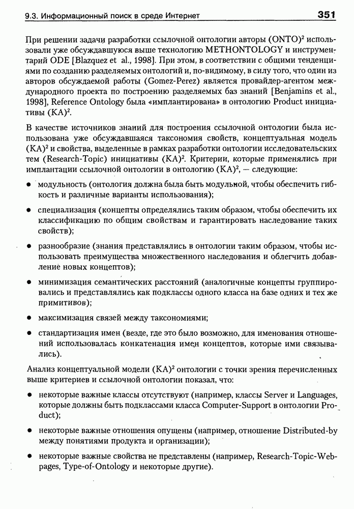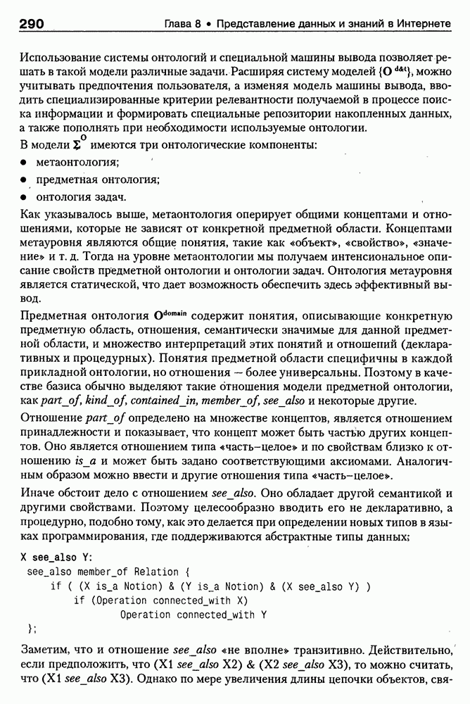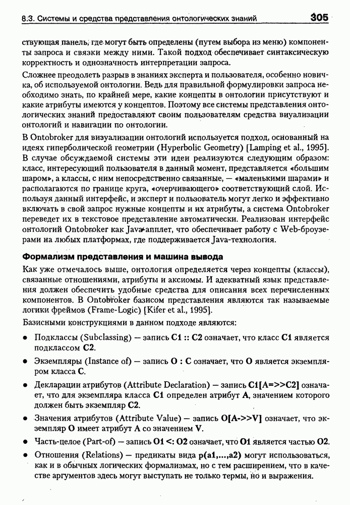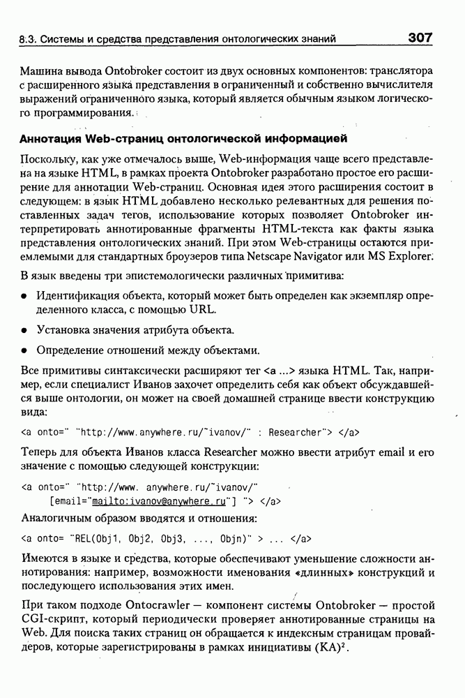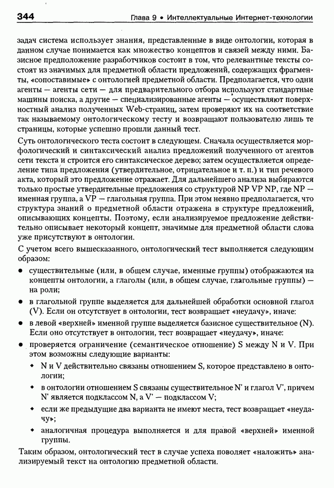 Рис. 9.9. Архитектура системы MARRI Интерфейсный агент (ИА) поддерживает интеллектуальное взаимодействие с пользователем. Он ассистирует при формулировке запросов и представляет результаты поиска в виде списка релевантных URL или Web-страниц. Когда пользователь выбирает интересующую его предметную область, ИА запрашивает соответствующую онтологию из онтологической БД, а также информирует других агентов сети о том, какая онтология будет использоваться. Задачей агента сети (АС) является подключение к заданной URL Web-странице, ее считывание и анализ. В силу того, что нужная страница может быть недоступна или неинтересна по содержанию, АС должен «уметь» обрабатывать исключительные ситуации, а также анализировать собственно текст, представленный на считанной странице. В системе MARRI задействованы два типа агентов-брокеров: брокер URL и брокер HTML. Первые предназначены для «сопровождения» списков Интернет-адресов, поставляемых броузером, а вторые — для запоминания полученных Web-страниц и распределения их между агентами обработки текста (АОТ) для дальнейшего анализа. Целью функционирования АОТ является семантический анализ Web-страниц для проверки их релевантности на базе соответствующей онтологии. Предварительно эти же агенты преобразуют HTML-текст к определенному структурному представлению, с которым работают морфологический и синтаксический анализаторы. Результат обработки текста представляется в виде синтаксического дерева, которое должно отождествиться с определенным фрагментом используемой онтологии. С архитектурной точки зрения система MARRI, по сегодняшним меркам, является почти традиционной. Ее отличительная черта — представление агентов автономными Java-программами с собственными сетевыми адресами, что неявно предполагает их мобильность и/или распределенность по сети. Такое решение было бы весьма интересным, если бы не политика контроля за безопасностью сервера, которая не допускает в настоящее время регистрацию и запуск Java-npoграмм, не сертифицированных на данном сервере. Прототип системы реализован на языке Java (версия 1.1.3). Для тестирования его разработаны две (очень грубых) онтологии — одна в области электронной коммерции (около 200 элементов), а вторая — в области Интернет-безопасности клиентских приложений (около 450 элементов). Предполагается развитие этих онтологий и интеграция их с соответствующими онтологиями, уже существующими на онтологических серверах. Прототип системы OntoSeekРазработка и реализация прототипа системы «содержательного» доступа к WWW-ресурсам OntoSeek — результат 2-летней работы, выполненной в кооперации Corinto (Consorzio di Ricerca Nazionale Tecnologia Oggetti - National Research Consortium for Object Technology) и Ladseb-CNR (National Research Council - Institute of Systems Science and Biomedical Engineering), как части проекта по поиску и повторному использованию программных компонентов [Gua-rino, et al., 1999]. Система OntoSeek разработана для содержательного извлечения информации из доступных в режиме on-line «желтых» страниц (yellow pages) и каталогов. В рамках системы совместно используются механизмы поиска по содержанию, управляемые соответствующей онтологией (ontology-driven content-matching mechanism), и достаточно мощный формализм представления. При создании OntoSeek были приняты следующие проектные решения: • использование ограниченного числа ЕЯ-терминов для точного описания ресурсов на фазе кодирования; • полная «