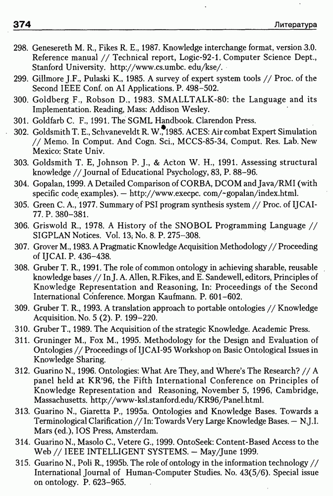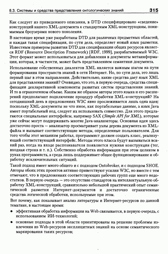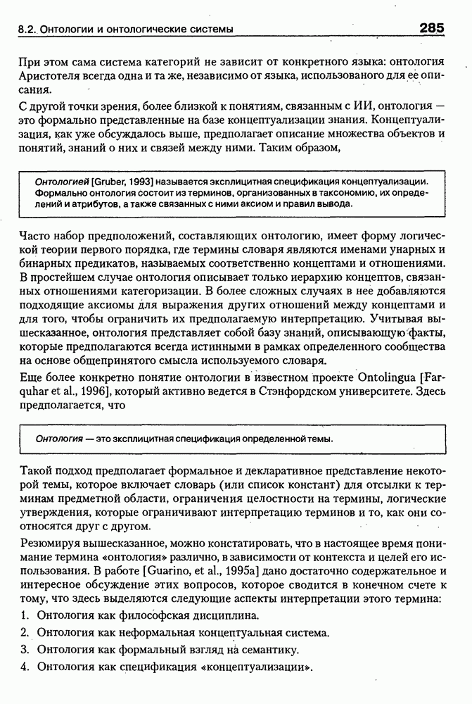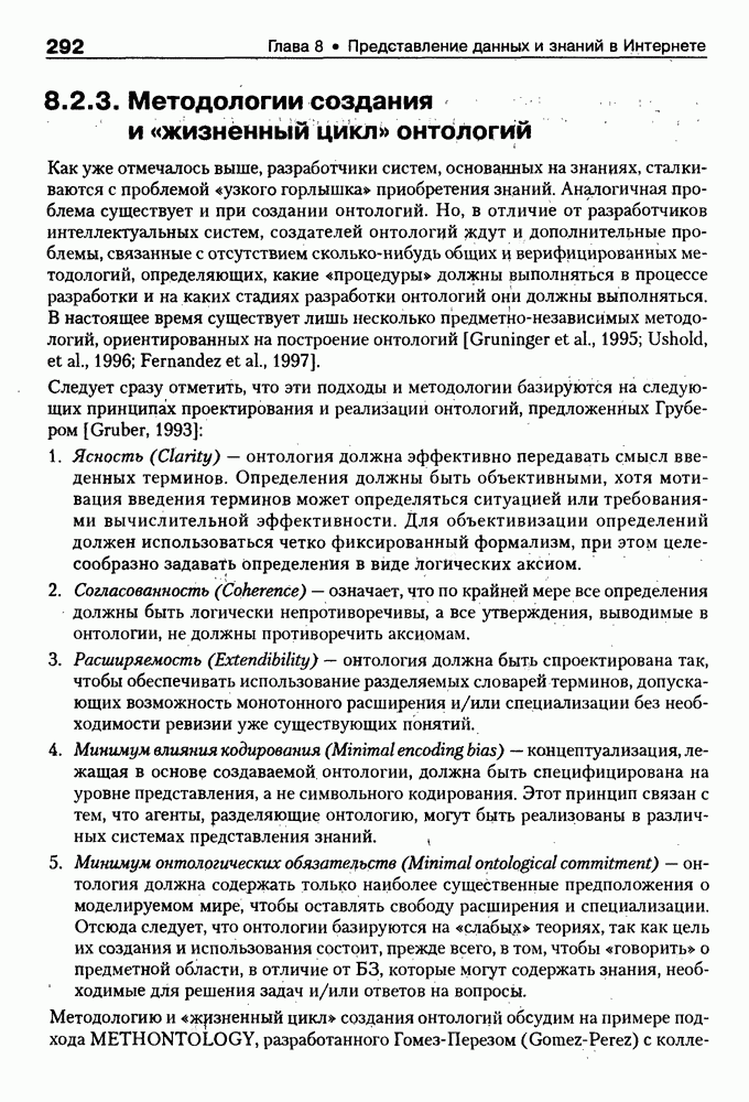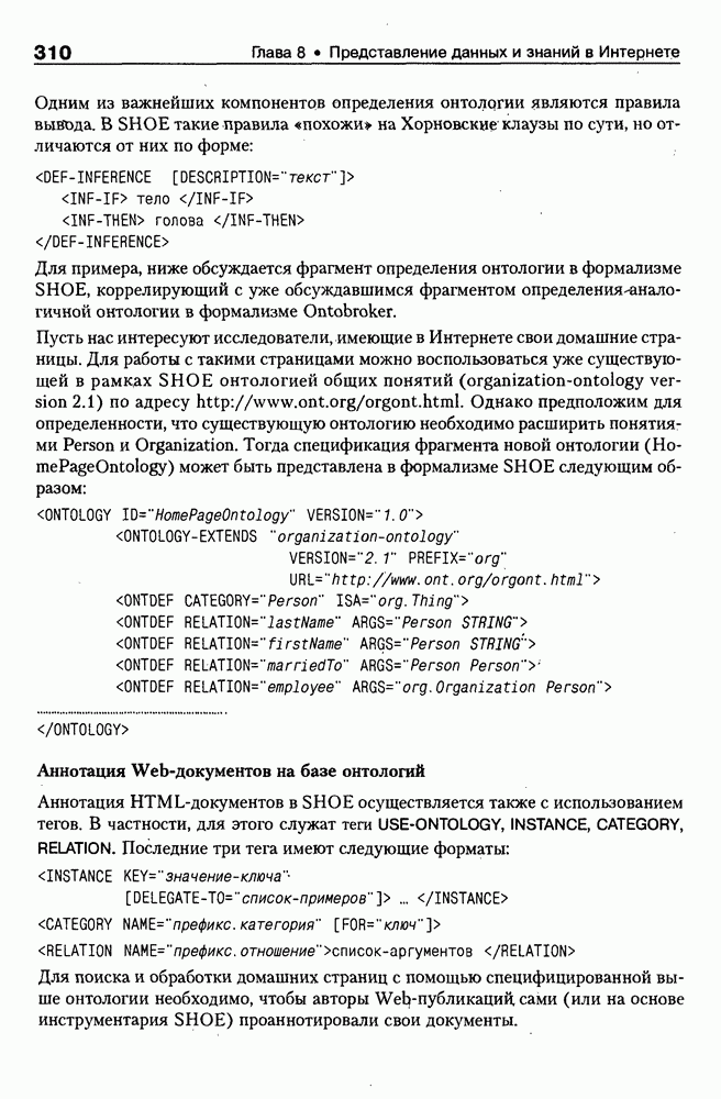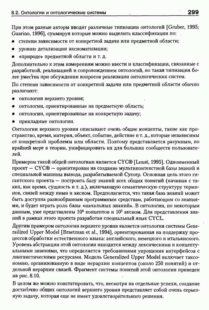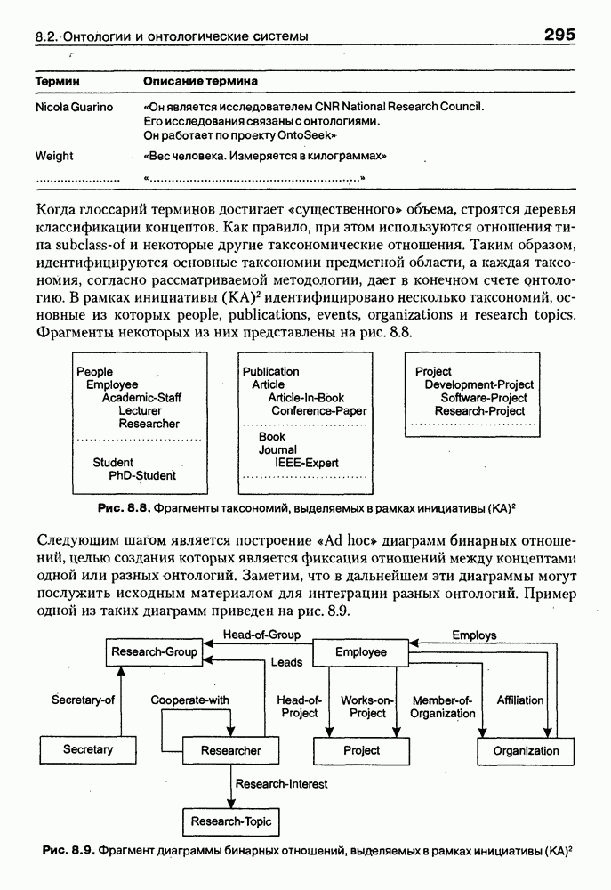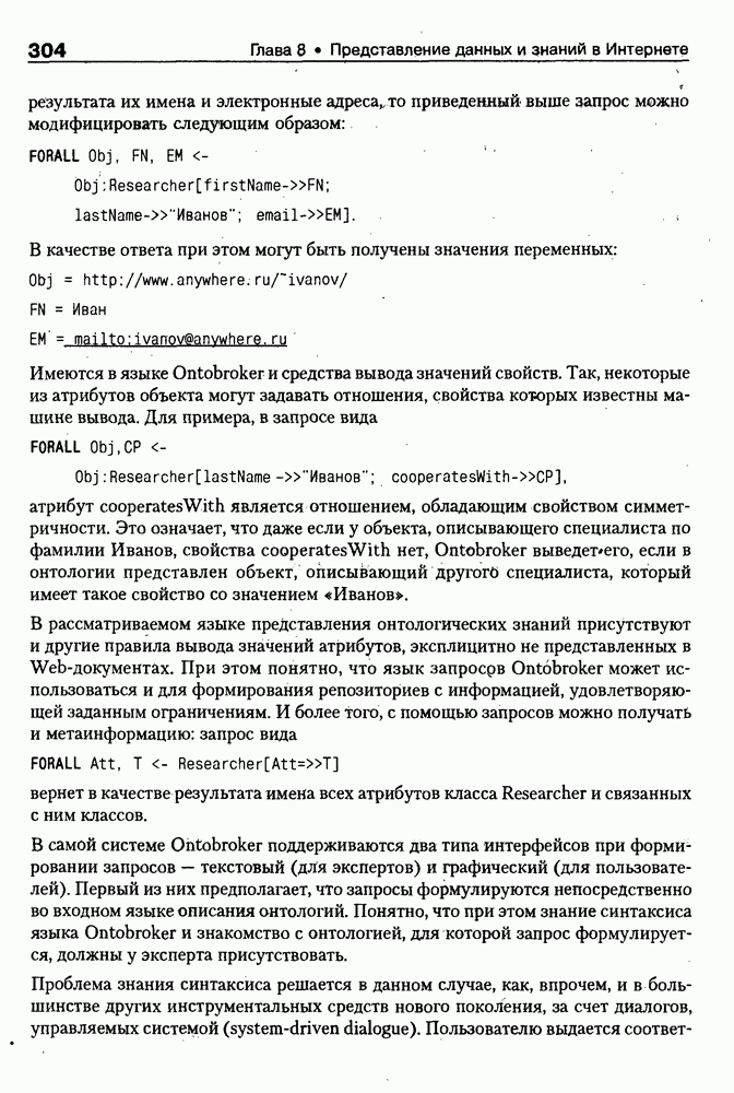 Рис. 9.9. Архитектура системы MARRI Интерфейсный агент (ИА) поддерживает интеллектуальное взаимодействие с пользователем. Он ассистирует при формулировке запросов и представляет результаты поиска в виде списка релевантных URL или Web-страниц. Когда пользователь выбирает интересующую его предметную область, ИА запрашивает соответствующую онтологию из онтологической БД, а также информирует других агентов сети о том, какая онтология будет использоваться. Задачей агента сети (АС) является подключение к заданной URL Web-странице, ее считывание и анализ. В силу того, что нужная страница может быть недоступна или неинтересна по содержанию, АС должен «уметь» обрабатывать исключительные ситуации, а также анализировать собственно текст, представленный на считанной странице. В системе MARRI задействованы два типа агентов-брокеров: брокер URL и брокер HTML. Первые предназначены для «сопровождения» списков Интернет-адресов, поставляемых броузером, а вторые — для запоминания полученных Web-страниц и распределения их между агентами обработки текста (АОТ) для дальнейшего анализа. Целью функционирования АОТ является семантический анализ Web-страниц для проверки их релевантности на базе соответствующей онтологии. Предварительно эти же агенты преобразуют HTML-текст к определенному структурному представлению, с которым работают морфологический и синтаксический анализаторы. Результат обработки текста представляется в виде синтаксического дерева, которое должно отождествиться с определенным фрагментом используемой онтологии. С архитектурной точки зрения система MARRI, по сегодняшним меркам, является почти традиционной. Ее отличительная черта — представление агентов автономными Java-программами с собственными сетевыми адресами, что неявно предполагает их мобильность и/или распределенность по сети. Такое решение было бы весьма интересным, если бы не политика контроля за безопасностью сервера, которая не допускает в настоящее время регистрацию и запуск Java-npoграмм, не сертифицированных на данном сервере. Прототип системы реализован на языке Java (версия 1.1.3). Для тестирования его разработаны две (очень грубых) онтологии — одна в области электронной коммерции (около 200 элементов), а вторая — в области Интернет-безопасности клиентских приложений (около 450 элементов). Предполагается развитие этих онтологий и интеграция их с соответствующими онтологиями, уже существующими на онтологических серверах. Прототип системы OntoSeekРазработка и реализация прототипа системы «содержательного» доступа к WWW-ресурсам OntoSeek — результат 2-летней работы, выполненной в кооперации Corinto (Consorzio di Ricerca Nazionale Tecnologia Oggetti - National Research Consortium for Object Technology) и Ladseb-CNR (National Research Council - Institute of Systems Science and Biomedical Engineering), как части проекта по поиску и повторному использованию программных компонентов [Gua-rino, et al., 1999]. Система OntoSeek разработана для содержательного извлечения информации из доступных в режиме on-line «желтых» страниц (yellow pages) и каталогов. В рамках системы совместно используются механизмы поиска по содержанию, управляемые соответствующей онтологией (ontology-driven content-matching mechanism), и достаточно мощный формализм представления. При создании OntoSeek были приняты следующие проектные решения: • использование ограниченного числа ЕЯ-терминов для точного описания ресурсов на фазе кодирования; • полная «