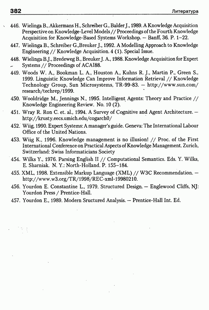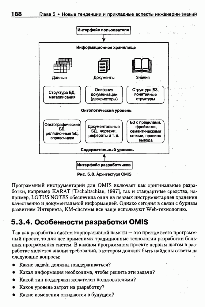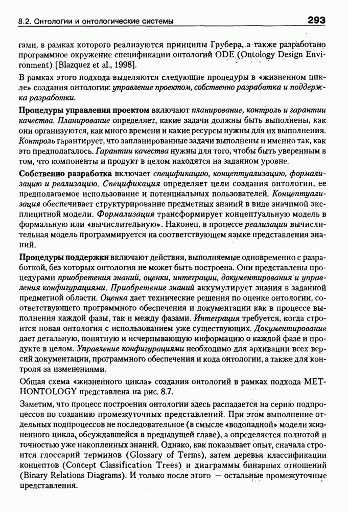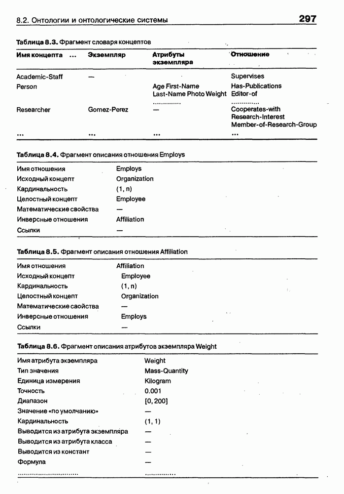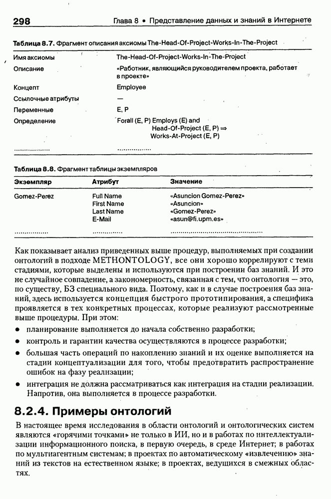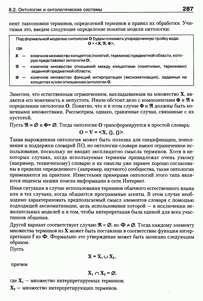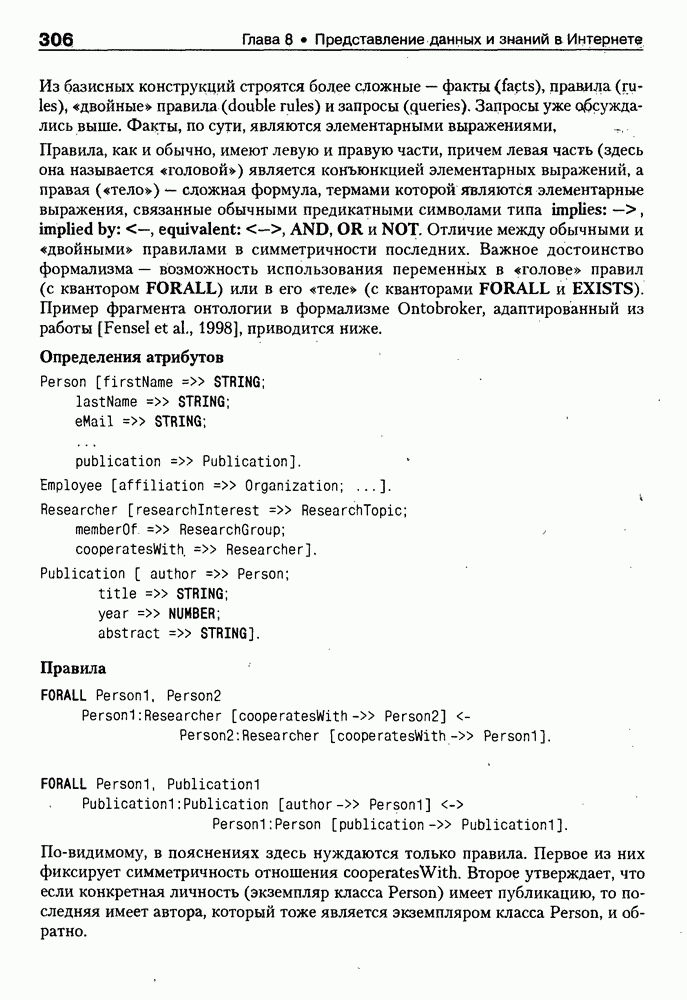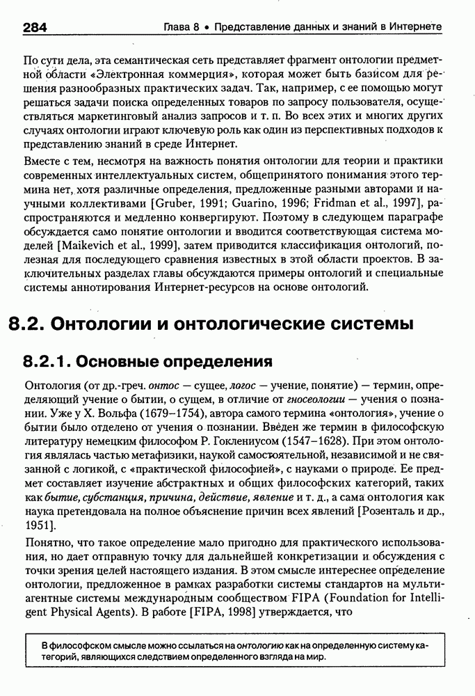 Рис. 9.9. Архитектура системы MARRI Интерфейсный агент (ИА) поддерживает интеллектуальное взаимодействие с пользователем. Он ассистирует при формулировке запросов и представляет результаты поиска в виде списка релевантных URL или Web-страниц. Когда пользователь выбирает интересующую его предметную область, ИА запрашивает соответствующую онтологию из онтологической БД, а также информирует других агентов сети о том, какая онтология будет использоваться. Задачей агента сети (АС) является подключение к заданной URL Web-странице, ее считывание и анализ. В силу того, что нужная страница может быть недоступна или неинтересна по содержанию, АС должен «уметь» обрабатывать исключительные ситуации, а также анализировать собственно текст, представленный на считанной странице. В системе MARRI задействованы два типа агентов-брокеров: брокер URL и брокер HTML. Первые предназначены для «сопровождения» списков Интернет-адресов, поставляемых броузером, а вторые — для запоминания полученных Web-страниц и распределения их между агентами обработки текста (АОТ) для дальнейшего анализа. Целью функционирования АОТ является семантический анализ Web-страниц для проверки их релевантности на базе соответствующей онтологии. Предварительно эти же агенты преобразуют HTML-текст к определенному структурному представлению, с которым работают морфологический и синтаксический анализаторы. Результат обработки текста представляется в виде синтаксического дерева, которое должно отождествиться с определенным фрагментом используемой онтологии. С архитектурной точки зрения система MARRI, по сегодняшним меркам, является почти традиционной. Ее отличительная черта — представление агентов автономными Java-программами с собственными сетевыми адресами, что неявно предполагает их мобильность и/или распределенность по сети. Такое решение было бы весьма интересным, если бы не политика контроля за безопасностью сервера, которая не допускает в настоящее время регистрацию и запуск Java-npoграмм, не сертифицированных на данном сервере. Прототип системы реализован на языке Java (версия 1.1.3). Для тестирования его разработаны две (очень грубых) онтологии — одна в области электронной коммерции (около 200 элементов), а вторая — в области Интернет-безопасности клиентских приложений (около 450 элементов). Предполагается развитие этих онтологий и интеграция их с соответствующими онтологиями, уже существующими на онтологических серверах. Прототип системы OntoSeekРазработка и реализация прототипа системы «содержательного» доступа к WWW-ресурсам OntoSeek — результат 2-летней работы, выполненной в кооперации Corinto (Consorzio di Ricerca Nazionale Tecnologia Oggetti - National Research Consortium for Object Technology) и Ladseb-CNR (National Research Council - Institute of Systems Science and Biomedical Engineering), как части проекта по поиску и повторному использованию программных компонентов [Gua-rino, et al., 1999]. Система OntoSeek разработана для содержательного извлечения информации из доступных в режиме on-line «желтых» страниц (yellow pages) и каталогов. В рамках системы совместно используются механизмы поиска по содержанию, управляемые соответствующей онтологией (ontology-driven content-matching mechanism), и достаточно мощный формализм представления. При создании OntoSeek были приняты следующие проектные решения: • использование ограниченного числа ЕЯ-терминов для точного описания ресурсов на фазе кодирования; • полная «