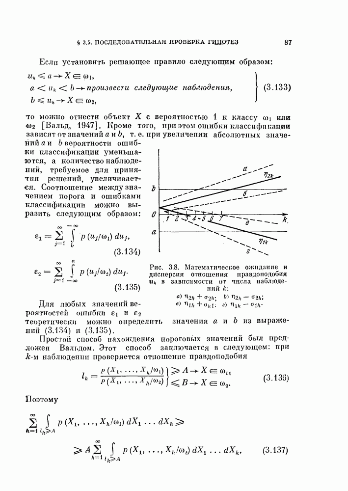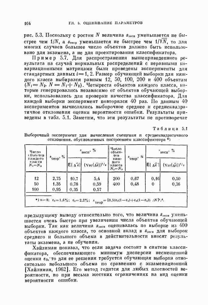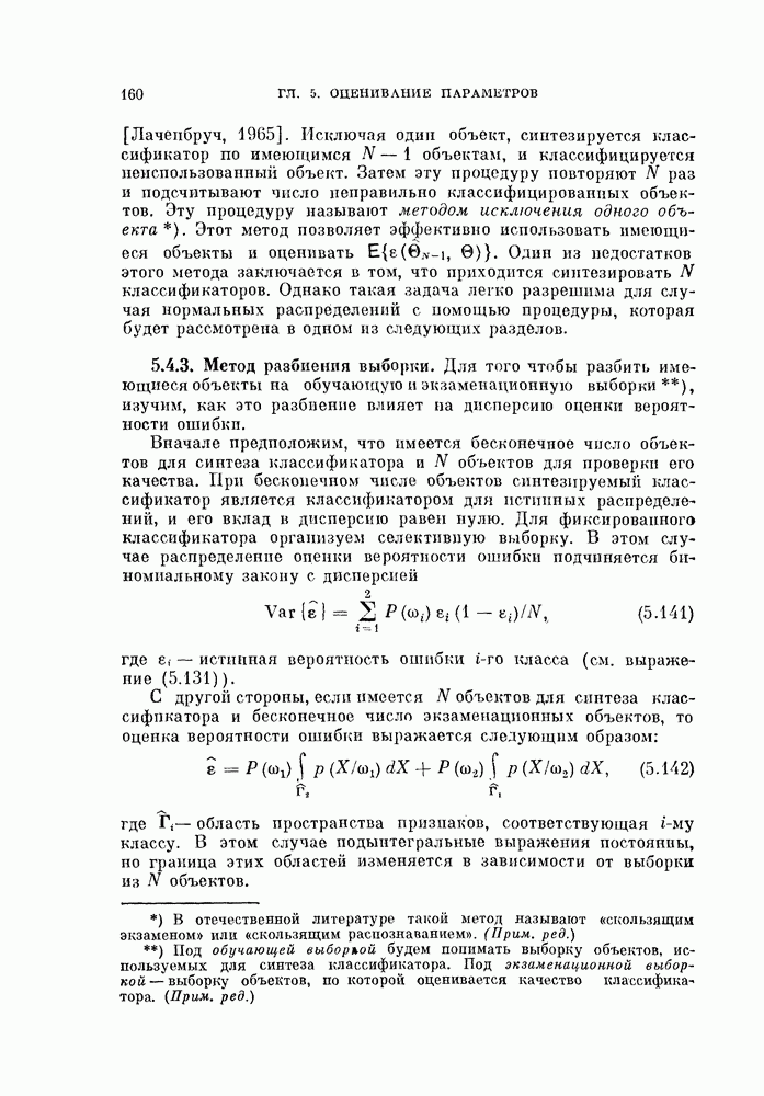 1. Метод разбиения выборкц. Вначале имеющиеся объекты разбивают на две группы и используют одну из них для синтеза классификатора, а другую — для проверки его качества. Этот метод называют методом разбиения выборки. Основной вопрос, характерный для этого метода, заключается в том, как разделить объекты. Для ответа на этот вопрос изучим в следующем разделе влияние числа «обучающих» и числа «экзаменационных» объектов на дисперсию оценки ошибки классификации.