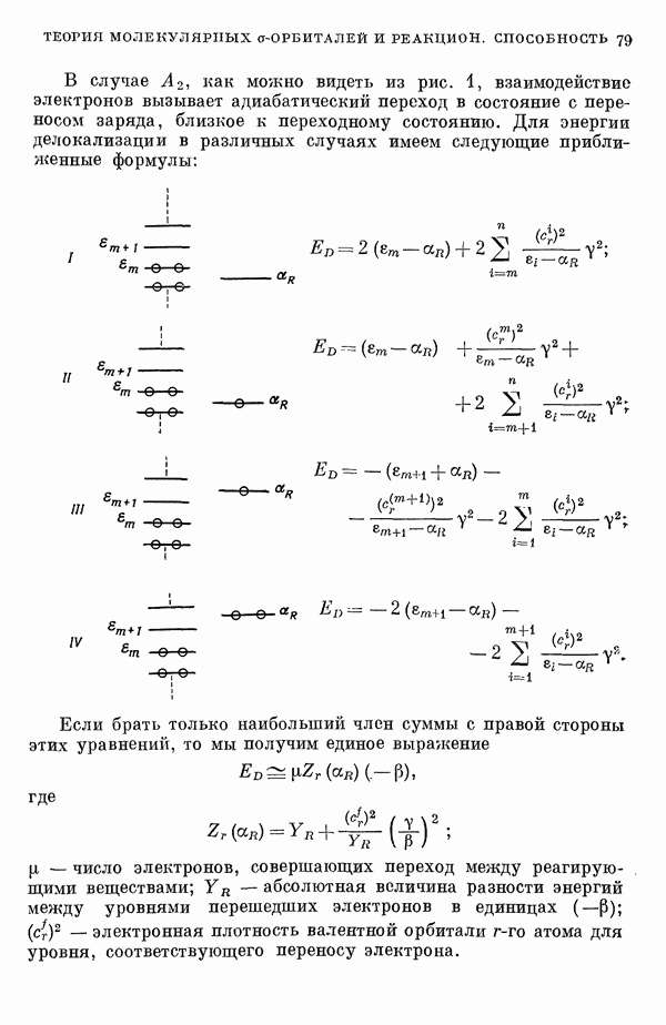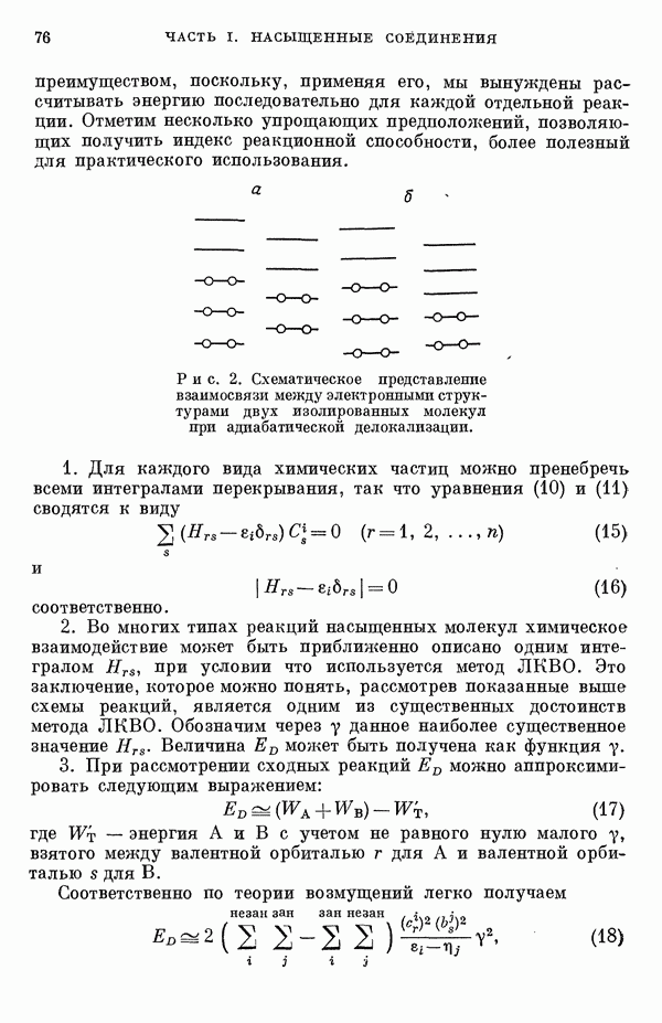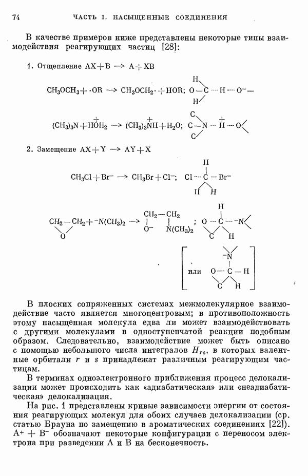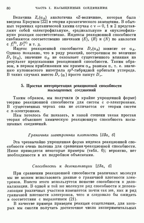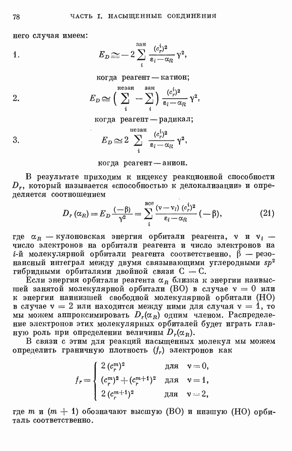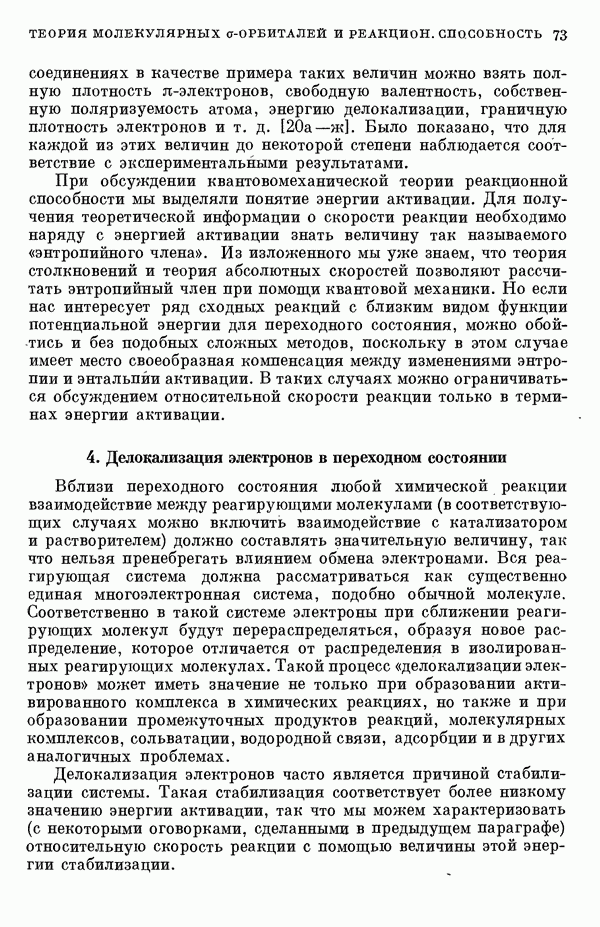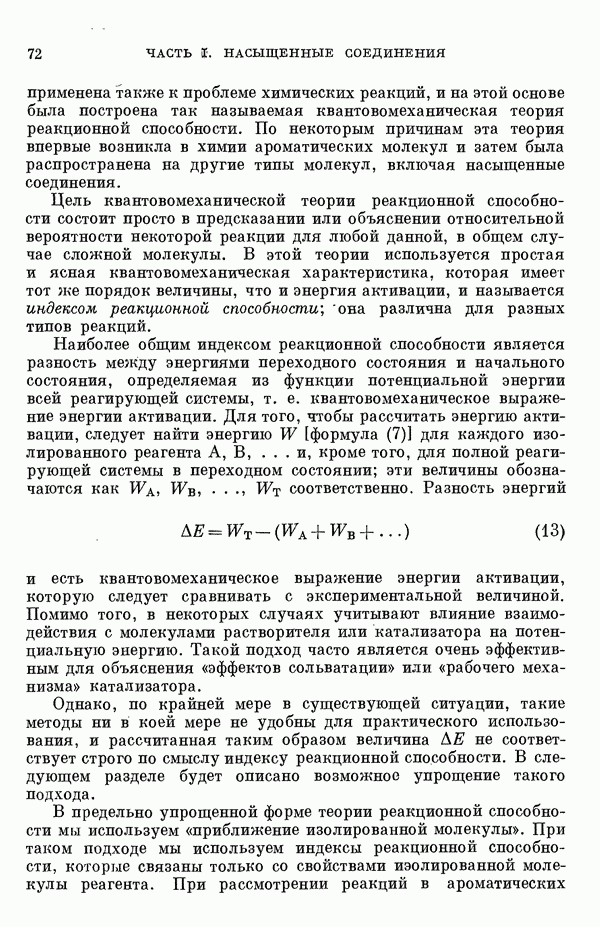 и есть квантовомеханическое выражение энергии активации, которую следует сравнивать с экспериментальной величиной. Помимо того, в некоторых случаях учитывают влияние взаимодействия с молекулами растворителя или катализатора на потенциальную энергию. Такой подход часто является очень эффективным для объяснения «эффектов сольватации» или «рабочего механизма» катализатора. Однако, по крайней мере в существующей ситуации, такие методы ни в коей мере не удобны для практического использования, и рассчитанная таким образом величина В предельно упрощенной форме теории реакционной способности мы используем «приближение изолированной молекулы». При таком подходе мы используем индексы реакционной способности, которые связаны только со свойствами изолированной молекулы реагента. При рассмотрении реакций в ароматических соединениях в качестве примера таких величин можно взять полную плотность При обсуждении квантовомеханической теории реакционной способности мы выделяли понятие энергии активации. Для получения теоретической информации о скорости реакции необходимо наряду с энергией активации знать величину так называемого «энтропийного члена». Из изложенного мы уже знаем, что теория столкновений и теория абсолютных скоростей позволяют рассчитать энтропийный член при помощи квантовой механики. Но если нас интересует ряд сходных реакций с близким видом функции потенциальной энергии для переходного состояния, можно обойтись и без подобных сложных методов, поскольку в этом случае имеет место своеобразная компенсация между изменениями энтропии и энтальпии активации. В таких случаях можно ограничиваться обсуждением относительной скорости реакции только в терминах энергии активации.
