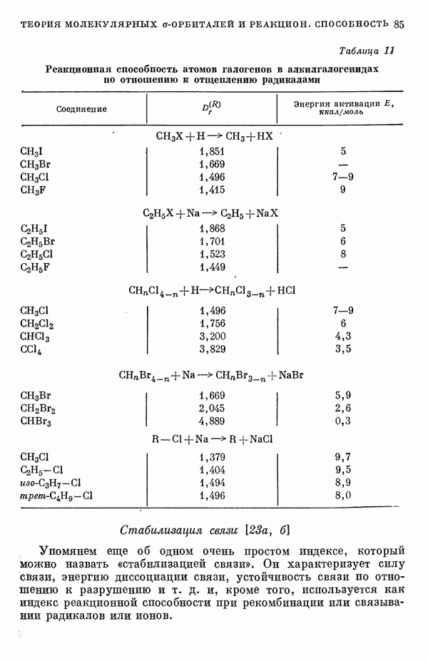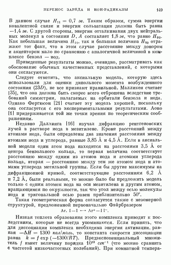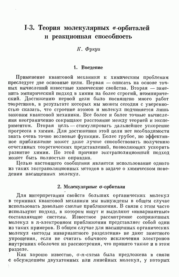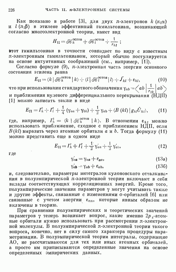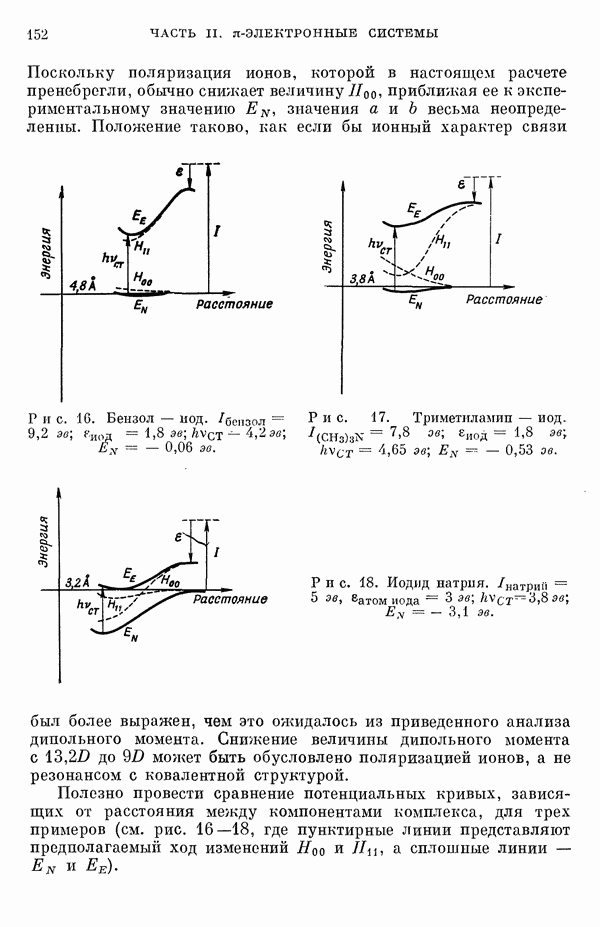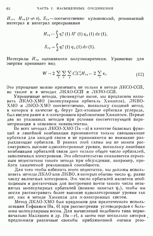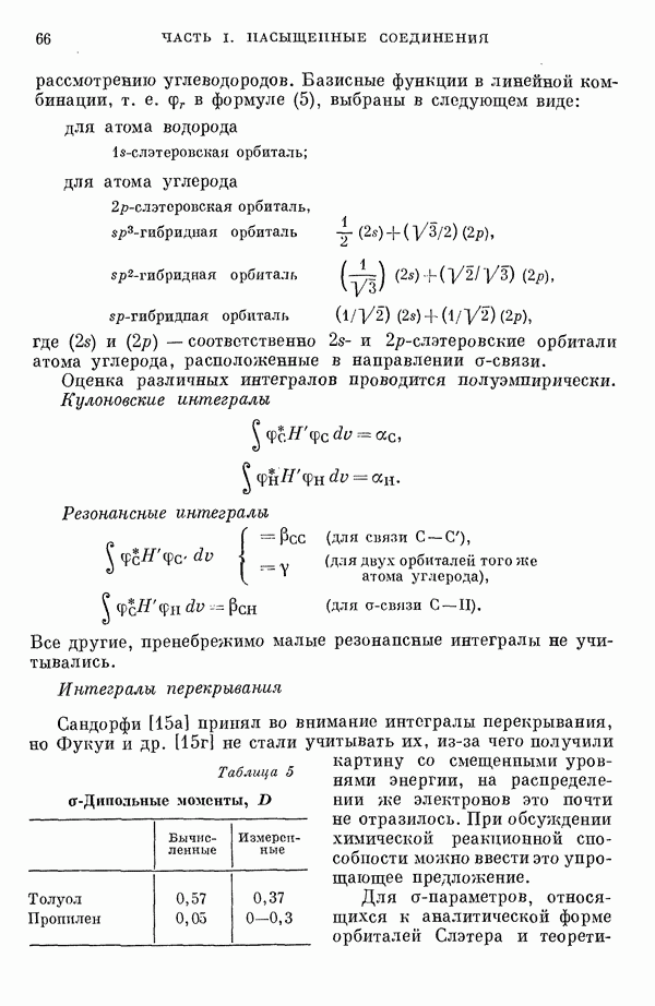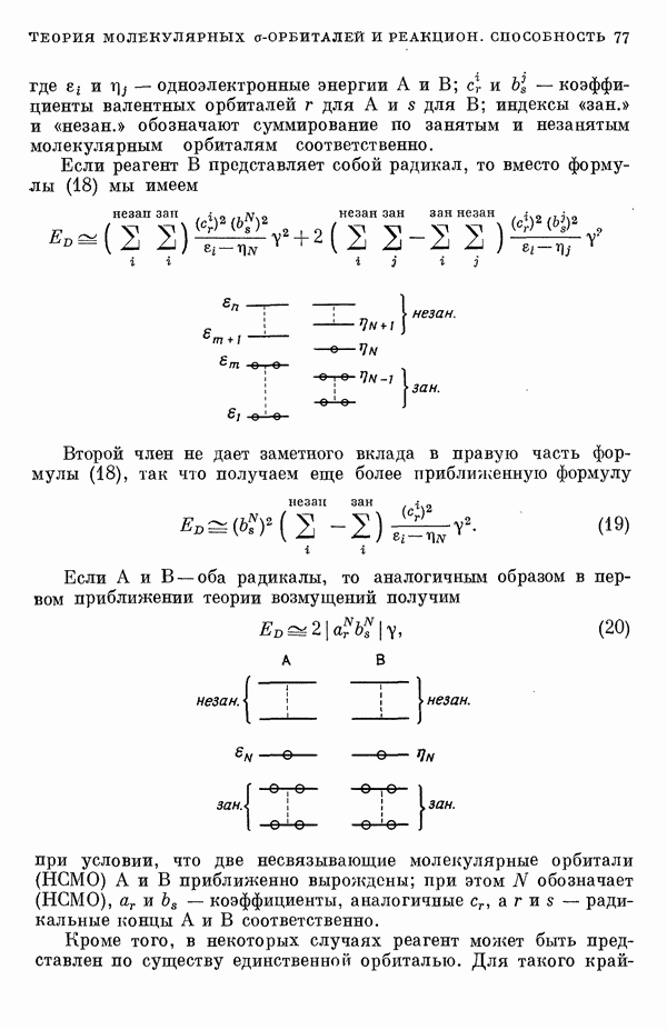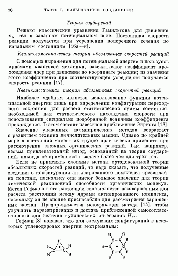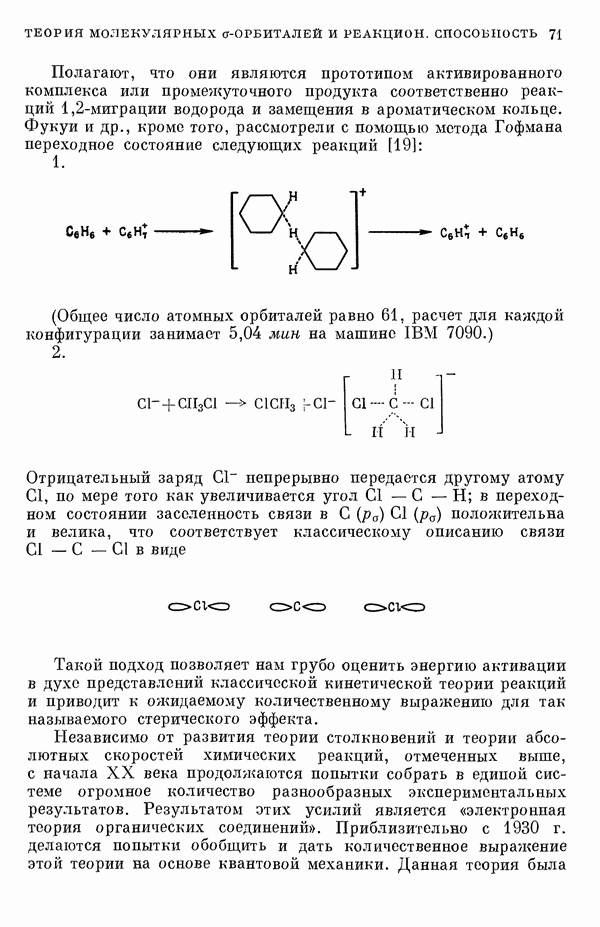 3. Теория химической реакционной способностиВ предыдущем разделе были описаны три типа линейных комбинаций для построения приближенных молекулярных орбиталей. Метод ЛKAO-XMO, который был введен в практику Гофманом, оказывается удобным для обсуждения устойчивых конфигураций молекулярных систем. Системы с химическим взаимодействием рассматриваются, как правило, так же, как имолекулы, вприближении Борна—Оппенгеймера. Энергия всей системы в целом рассчитывается для каждого набора фиксированных координат ядер. Таким образом мы получаем функцию потенциальной энергии, определяющую поле, в котором движутся ядра. Эта потенциальная энергия является функцией Теория соударенийРешают классические уравнения Гамильтона для движения Квантовомеханическая теория абсолютных скоростей реакцийС помощью выражения для потенциальной энергии и пользуясь приемами квантовой механики, рассчитывают коэффициент прохождения ядер при движении по координате реакции; из значения этого коэффициента при соответствующем усреднении получается скорость реакции [17]. Квазиклассическая теория абсолютных скоростей реакцийНаиболее удобным является использование функции потенциальной энергии лишь при определении конфигурации переходного состояния для расчета статистической суммы состояния, необходимой для статистического нахождения скорости при использовании специально подобранной величины коэффициента прохождения. В этом состоит известное приближение Эйринга [18]. Значение указанных неэмпирических методов возрастает с развитием техники вычислительных машин. Однако по крайней мере в настоящий момент их трудно практически применять при рассмотрении сложных органических реакций. Так, например, весьма привлекательный метод, основанный на теории соударений, никогда не применялся в задаче более чем для трех тел. Если не применять сложные методы ортодоксальной теории абсолютных скоростей реакций, то надо сказать, что полученные сведения о конфигурации активированного комплекса чрезвычайно полезны, поскольку они имеют большое значение для теории химической реакционной способности органических молекул. Метод Гофмана в его настоящем виде является несовершенным для расчета расстояний между ядрами активированного комплекса, поскольку он не вполне приспособлен для рассмотрения заряженных частиц. Предпринимается модификация метода [14], чтобы улучшить параметризацию и достичь приближенной самосогласо-ванности для величин кулоновских интегралов Гофман [8] показал, что для следующих конфигураций в некоторых углеводородах энергия экстремальна: