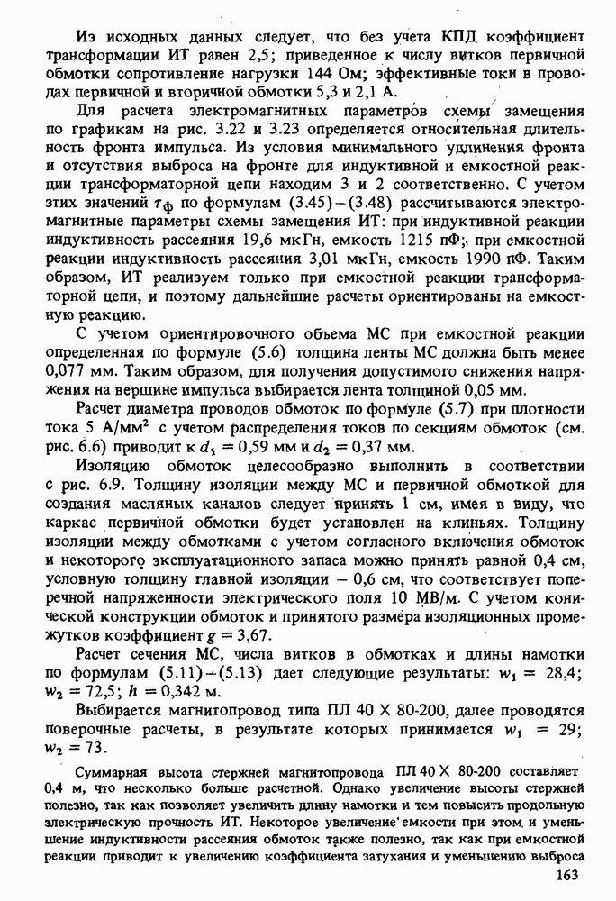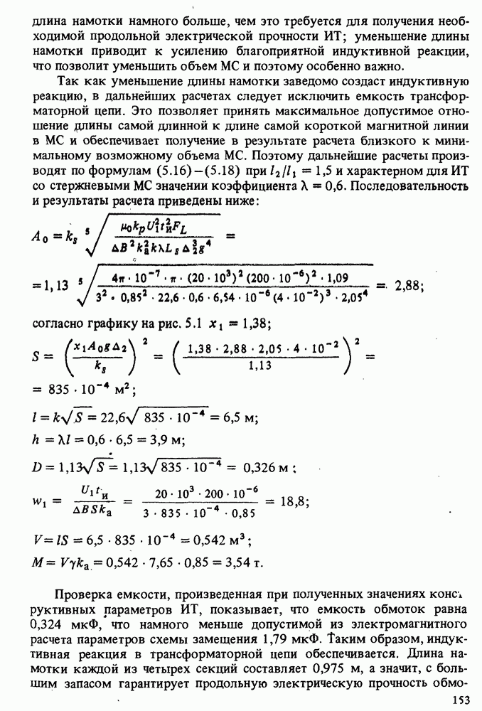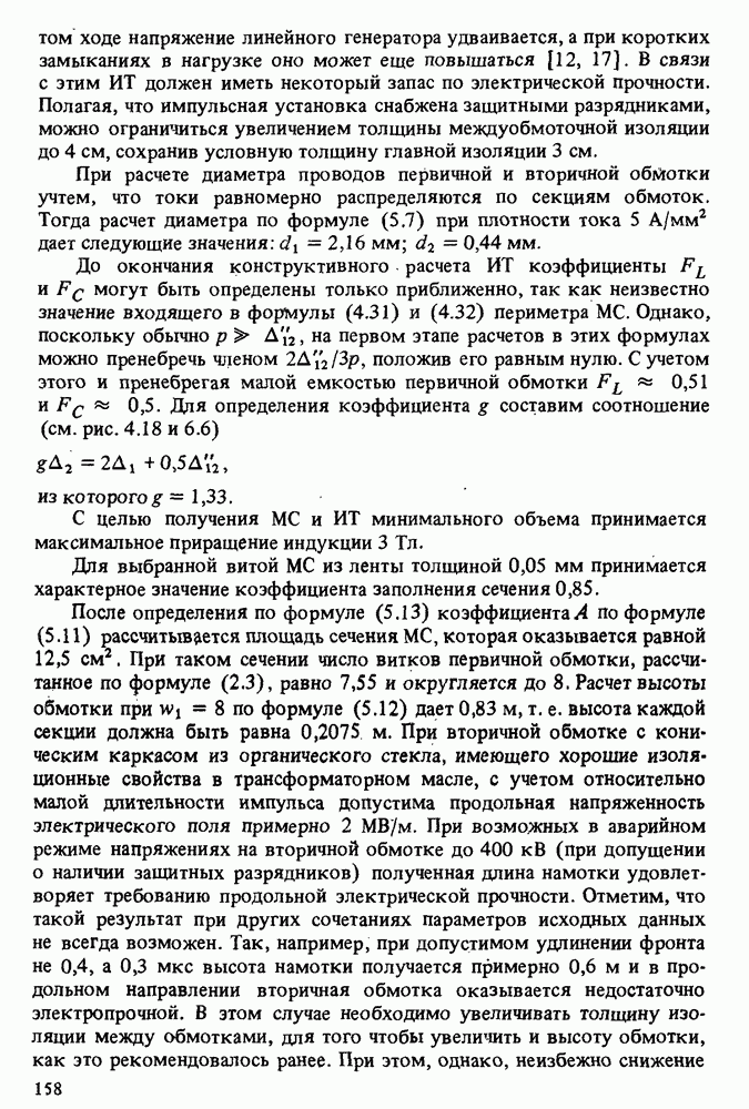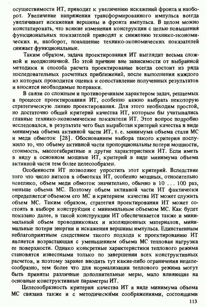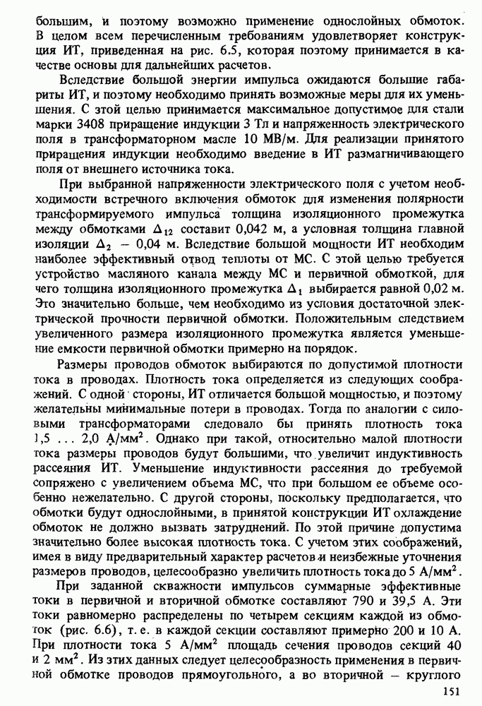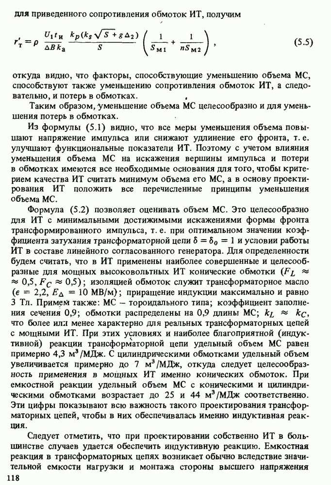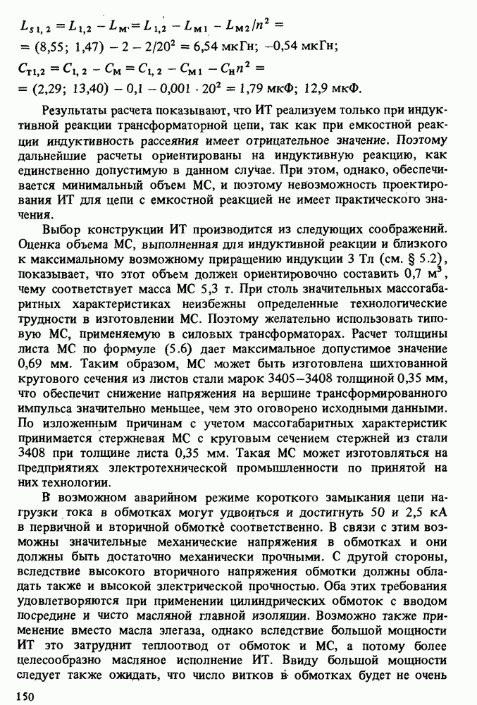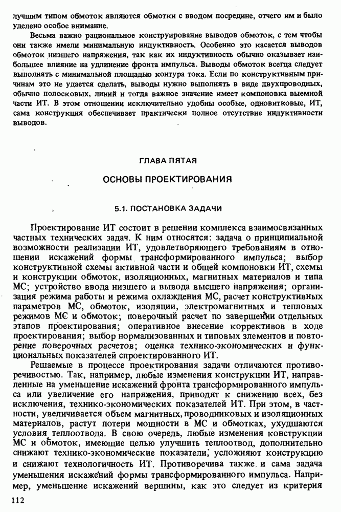 ГЛАВА ПЯТАЯ. ОСНОВЫ ПРОЕКТИРОВАНИЯ5.1. ПОСТАНОВКА ЗАДАЧИПроектирование ИТ состоит в решении комплекса взаимосвязанных частных технических задач. К ним относятся: задача о принципиальной возможности реализации ИТ, удовлетворяющего требованиям в отношении искажений формы трансформированного импульса; выбор конструктивной схемы активной части и общей компоновки ИТ, схемы и конструкции обмоток, изоляционных, магнитных материалов и типа МС; устройство ввода низшего и вывода высшего напряжения; организация режима работы и режима охлаждения МС, расчет конструктивных параметров МС, обмоток, изоляции, электромагнитных и тепловых режимов МС и обмоток; поверочный расчет по завершении отдельных этапов проектирования; оперативное внесение коррективов в ходе проектирования; выбор нормализованных и типовых элементов и повторение поверочных расчетов; оценка технико-экономических и функциональных показателей спроектированного ИТ. Решаемые в процессе проектирования задачи отличаются противоречивостью. Так, например, любые изменения конструкции ИТ, направленные на уменьшение искажений фронта трансформированного импульса или увеличение его напряжения, приводят к снижению всех, без исключения, технико-экономических показателей ИТ. При этом, в частности, увеличивается объем магнитных, проводниковых и изоляционных материалов, растут потери мощности в МС и обмотках, ухудшаются условия теплоотвода. В свою очередь, любые изменения конструкции МС и обмоток, имеющие целью улучшить теплоотвод, дополнительно снижают технико-экономические показатели, усложняют конструкцию и снижают технологичность ИТ. Противоречива также и сама задача уменьшения искажений формы трансформированного импульса. Например, уменьшение искажений вершины, как это следует из критерия осуществимости ИТ, приводит к увеличению искажений фронта и наоборот. Увеличение напряжения трансформированного импульса всегда увеличивает искажения вершины и фронта импульса. В целом можно констатировать, что всякие изменения конструкции с целью повышения функциональных показателей приводят к снижению технико-экономических и, наоборот, повышение технико-экономических показателей снижает функциональные. Таким образом, задача проектирования ИТ выглядит весьма сложной и неоднозначной. По этой причине вне зависимости от выбранной методики и способа расчета проектирование всегда состоит из ряда последовательных расчетных приближений, после выполнения каждого из которых проводится оценка и сопоставление полученных результатов и вносятся необходимые поправки. В связи со сложным и противоречивым характером задач, решаемых в процессе проектирования ИТ, особенно важно выбрать некоторую стратегическую линию проектирования. Для этого необходим простой, но достаточно общий критерий качества ИТ, которым бы учитывались главные технико-экономические показатели ИТ. Этот вопрос подробно исследовался, в результате чего был выработан критерий качества в виде минимума объема активной части ИТ, т. е. минимума объема стали МС и меди обмоток [28]. Обоснованием выбора такого критерия послужило то, что объему активной части пропорциональны потери мощности, стоимость, массогабаритные и другие характеристики ИТ. Если иметь в виду в основном мощные ИТ, критерий в виде минимума об