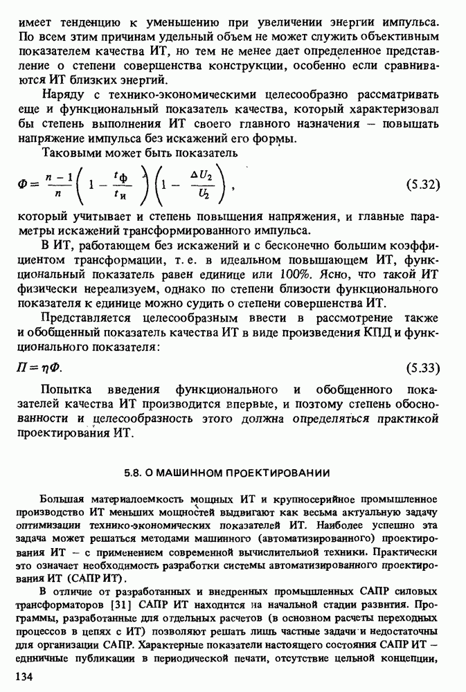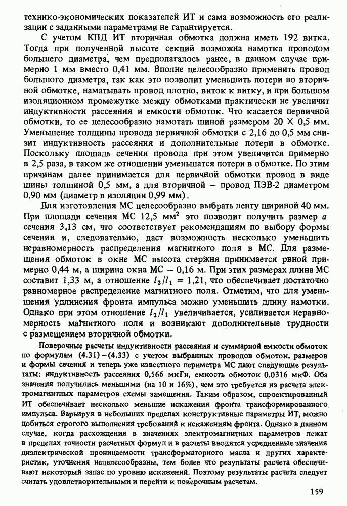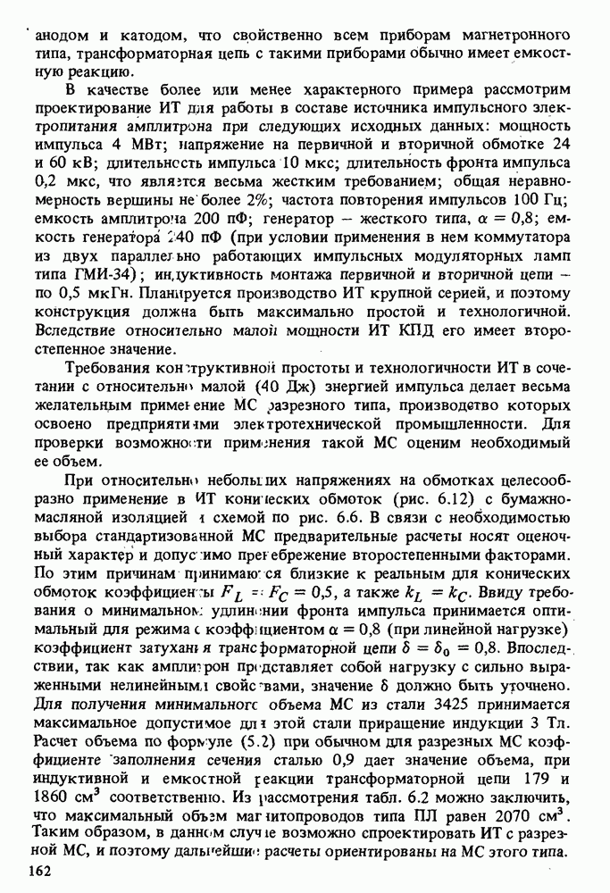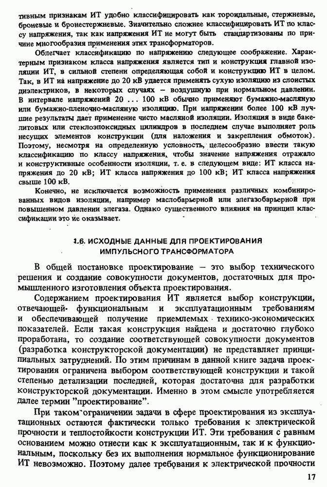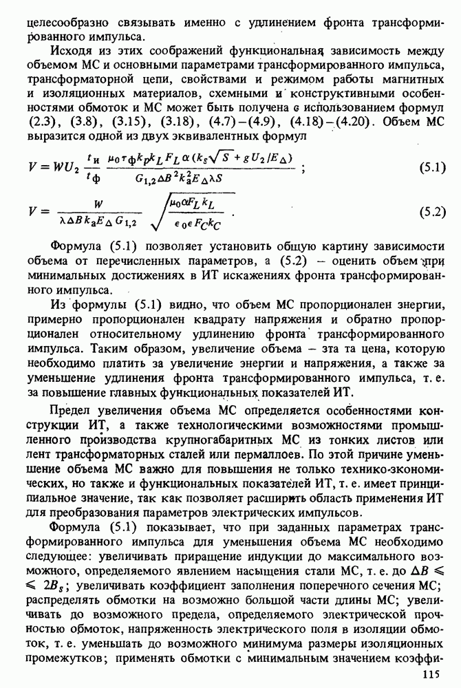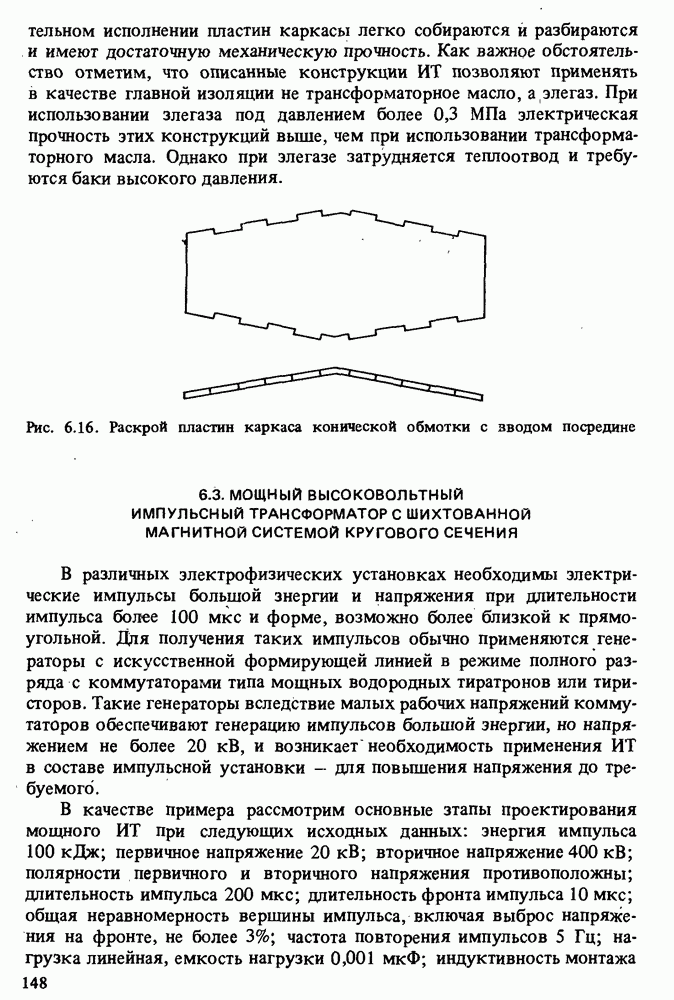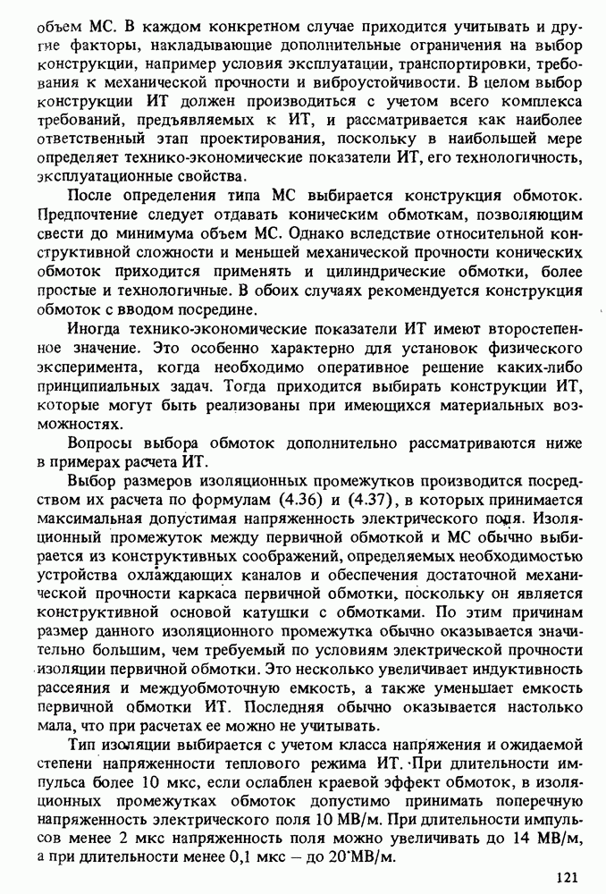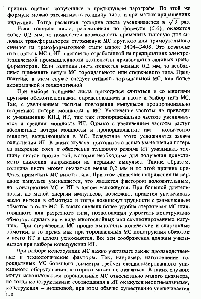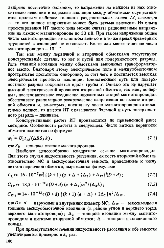 ГЛАВА ПЯТАЯ. ОСНОВЫ ПРОЕКТИРОВАНИЯ5.1. ПОСТАНОВКА ЗАДАЧИПроектирование ИТ состоит в решении комплекса взаимосвязанных частных технических задач. К ним относятся: задача о принципиальной возможности реализации ИТ, удовлетворяющего требованиям в отношении искажений формы трансформированного импульса; выбор конструктивной схемы активной части и общей компоновки ИТ, схемы и конструкции обмоток, изоляционных, магнитных материалов и типа МС; устройство ввода низшего и вывода высшего напряжения; организация режима работы и режима охлаждения МС, расчет конструктивных параметров МС, обмоток, изоляции, электромагнитных и тепловых режимов МС и обмоток; поверочный расчет по завершении отдельных этапов проектирования; оперативное внесение коррективов в ходе проектирования; выбор нормализованных и типовых элементов и повторение поверочных расчетов; оценка технико-экономических и функциональных показателей спроектированного ИТ. Решаемые в процессе проектирования задачи отличаются противоречивостью. Так, например, любые изменения конструкции ИТ, направленные на уменьшение искажений фронта трансформированного импульса или увеличение его напряжения, приводят к снижению всех, без исключения, технико-экономических показателей ИТ. При этом, в частности, увеличивается объем магнитных, проводниковых и изоляционных материалов, растут потери мощности в МС и обмотках, ухудшаются условия теплоотвода. В свою очередь, любые изменения конструкции МС и обмоток, имеющие целью улучшить теплоотвод, дополнительно снижают технико-экономические показатели, усложняют конструкцию и снижают технологичность ИТ. Противоречива также и сама задача уменьшения искажений формы трансформированного импульса. Например, уменьшение искажений вершины, как это следует из критерия осуществимости ИТ, приводит к увеличению искажений фронта и наоборот. Увеличение напряжения трансформированного импульса всегда увеличивает искажения вершины и фронта импульса. В целом можно констатировать, что всякие изменения конструкции с целью повышения функциональных показателей приводят к снижению технико-экономических и, наоборот, повышение технико-экономических показателей снижает функциональные. Таким образом, задача проектирования ИТ выглядит весьма сложной и неоднозначной. По этой причине вне зависимости от выбранной методики и способа расчета проектирование всегда состоит из ряда последовательных расчетных приближений, после выполнения каждого из которых проводится оценка и сопоставление полученных результатов и вносятся необходимые поправки. В связи со сложным и противоречивым характером задач, решаемых в процессе проектирования ИТ, особенно важно выбрать некоторую стратегическую линию проектирования. Для этого необходим простой, но достаточно общий критерий качества ИТ, которым бы учитывались главные технико-экономические показатели ИТ. Этот вопрос подробно исследовался, в результате чего был выработан критерий качества в виде минимума объема активной части ИТ, т. е. минимума объема стали МС и меди обмоток [28]. Обоснованием выбора такого критерия послужило то, что объему активной части пропорциональны потери мощности, стоимость, массогабаритные и другие характеристики ИТ. Если иметь в виду в основном мощные ИТ, критерий в виде минимума об
