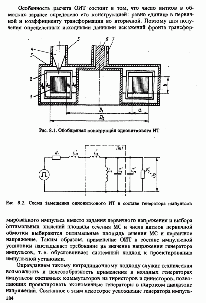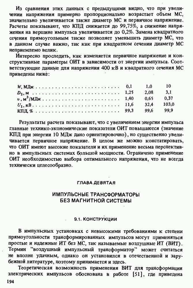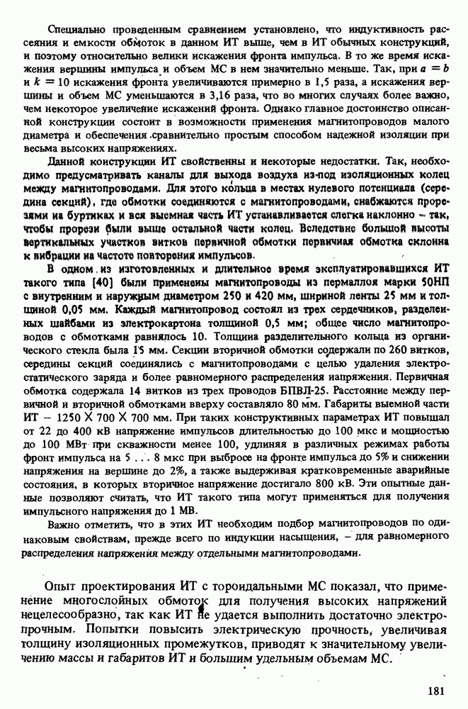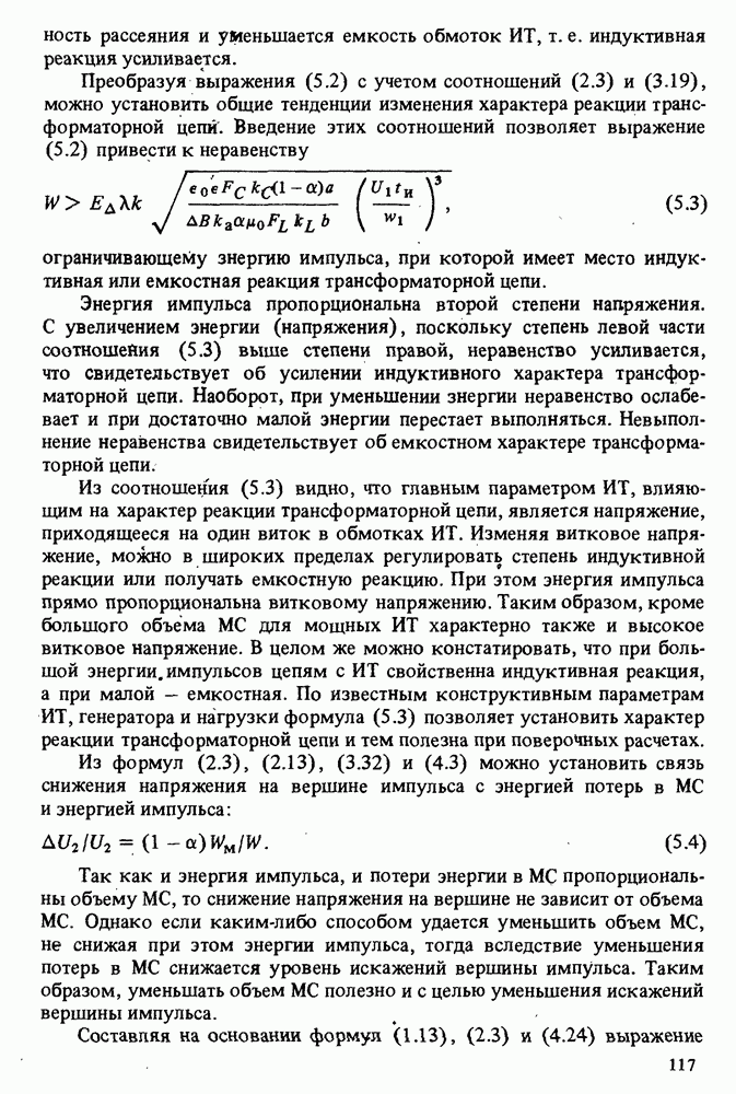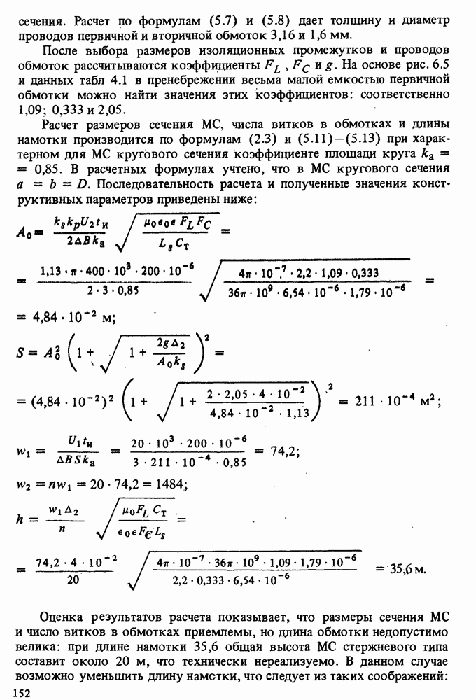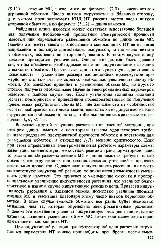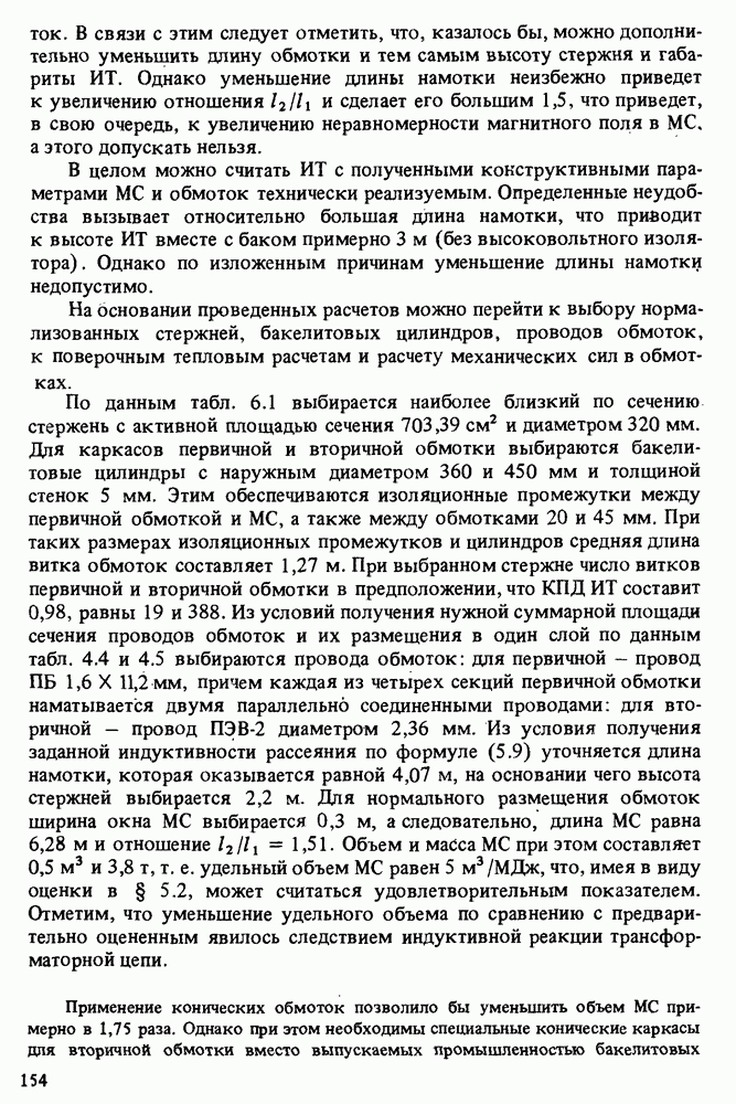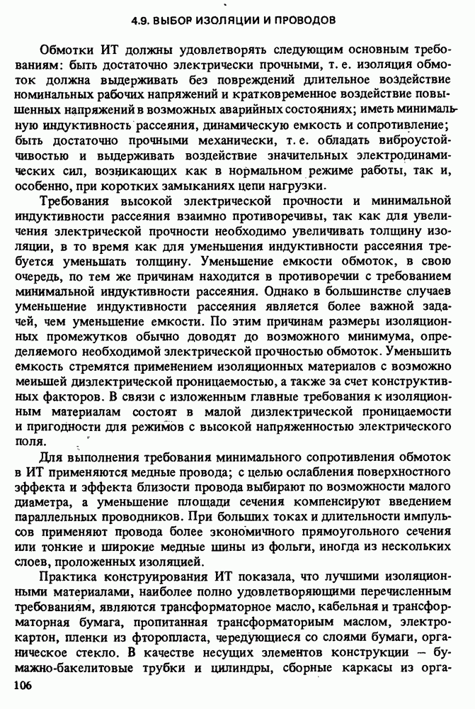 ГЛАВА ПЯТАЯ. ОСНОВЫ ПРОЕКТИРОВАНИЯ5.1. ПОСТАНОВКА ЗАДАЧИПроектирование ИТ состоит в решении комплекса взаимосвязанных частных технических задач. К ним относятся: задача о принципиальной возможности реализации ИТ, удовлетворяющего требованиям в отношении искажений формы трансформированного импульса; выбор конструктивной схемы активной части и общей компоновки ИТ, схемы и конструкции обмоток, изоляционных, магнитных материалов и типа МС; устройство ввода низшего и вывода высшего напряжения; организация режима работы и режима охлаждения МС, расчет конструктивных параметров МС, обмоток, изоляции, электромагнитных и тепловых режимов МС и обмоток; поверочный расчет по завершении отдельных этапов проектирования; оперативное внесение коррективов в ходе проектирования; выбор нормализованных и типовых элементов и повторение поверочных расчетов; оценка технико-экономических и функциональных показателей спроектированного ИТ. Решаемые в процессе проектирования задачи отличаются противоречивостью. Так, например, любые изменения конструкции ИТ, направленные на уменьшение искажений фронта трансформированного импульса или увеличение его напряжения, приводят к снижению всех, без исключения, технико-экономических показателей ИТ. При этом, в частности, увеличивается объем магнитных, проводниковых и изоляционных материалов, растут потери мощности в МС и обмотках, ухудшаются условия теплоотвода. В свою очередь, любые изменения конструкции МС и обмоток, имеющие целью улучшить теплоотвод, дополнительно снижают технико-экономические показатели, усложняют конструкцию и снижают технологичность ИТ. Противоречива также и сама задача уменьшения искажений формы трансформированного импульса. Например, уменьшение искажений вершины, как это следует из критерия осуществимости ИТ, приводит к увеличению искажений фронта и наоборот. Увеличение напряжения трансформированного импульса всегда увеличивает искажения вершины и фронта импульса. В целом можно констатировать, что всякие изменения конструкции с целью повышения функциональных показателей приводят к снижению технико-экономических и, наоборот, повышение технико-экономических показателей снижает функциональные. Таким образом, задача проектирования ИТ выглядит весьма сложной и неоднозначной. По этой причине вне зависимости от выбранной методики и способа расчета проектирование всегда состоит из ряда последовательных расчетных приближений, после выполнения каждого из которых проводится оценка и сопоставление полученных результатов и вносятся необходимые поправки. В связи со сложным и противоречивым характером задач, решаемых в процессе проектирования ИТ, особенно важно выбрать некоторую стратегическую линию проектирования. Для этого необходим простой, но достаточно общий критерий качества ИТ, которым бы учитывались главные технико-экономические показатели ИТ. Этот вопрос подробно исследовался, в результате чего был выработан критерий качества в виде минимума объема активной части ИТ, т. е. минимума объема стали МС и меди обмоток [28]. Обоснованием выбора такого критерия послужило то, что объему активной части пропорциональны потери мощности, стоимость, массогабаритные и другие характеристики ИТ. Если иметь в виду в основном мощные ИТ, критерий в виде минимума об