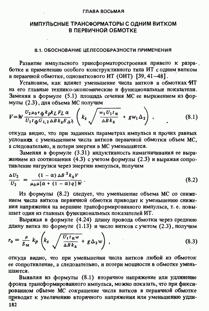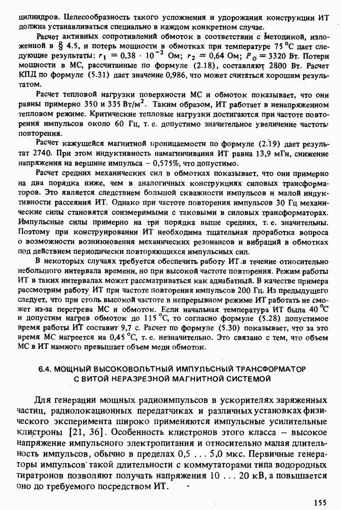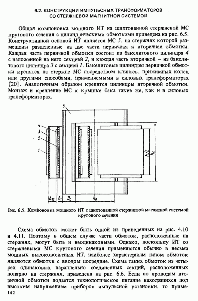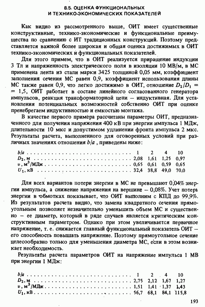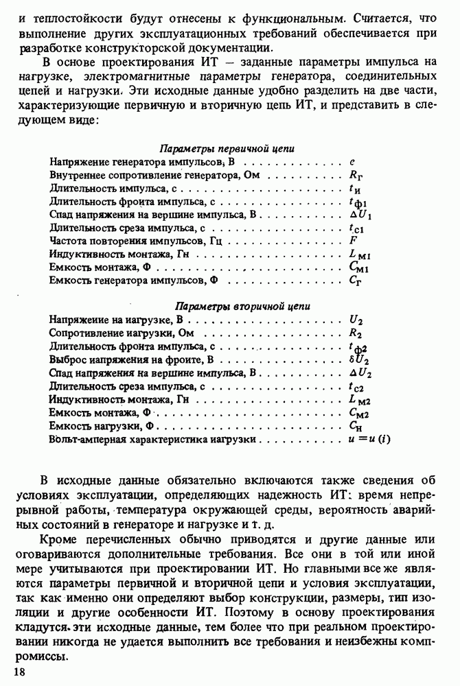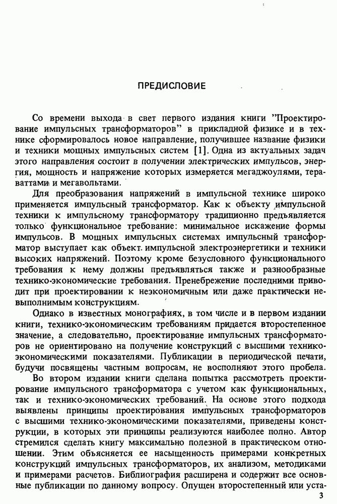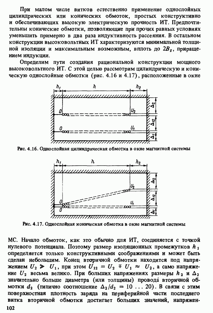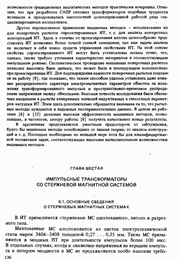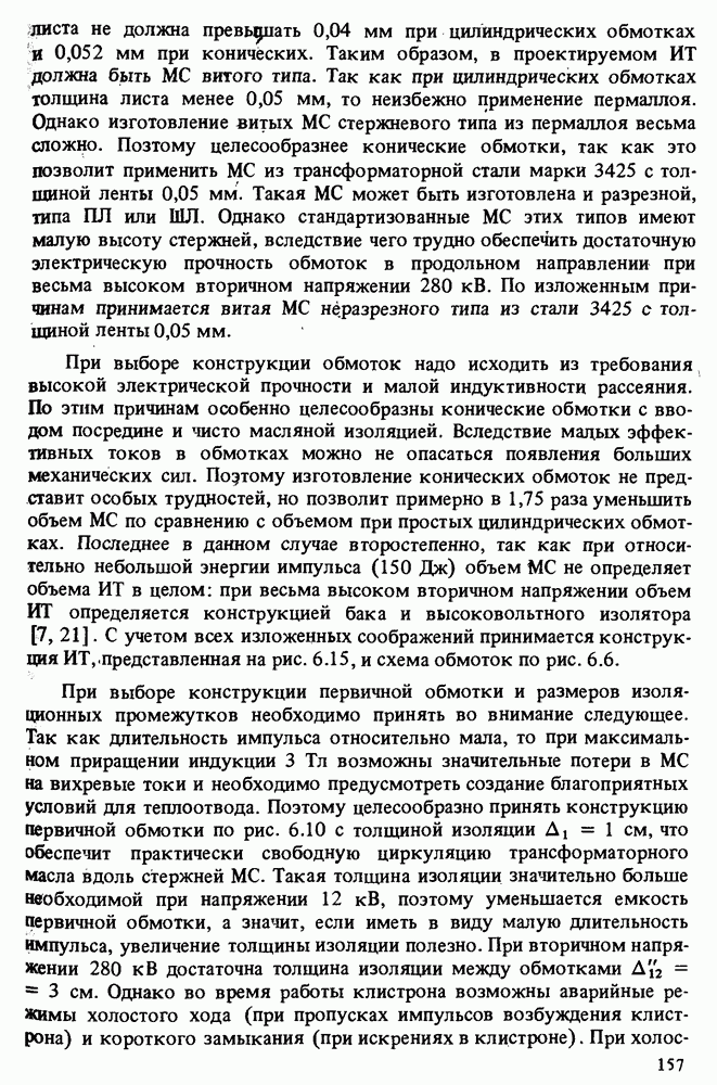 ГЛАВА ПЯТАЯ. ОСНОВЫ ПРОЕКТИРОВАНИЯ5.1. ПОСТАНОВКА ЗАДАЧИПроектирование ИТ состоит в решении комплекса взаимосвязанных частных технических задач. К ним относятся: задача о принципиальной возможности реализации ИТ, удовлетворяющего требованиям в отношении искажений формы трансформированного импульса; выбор конструктивной схемы активной части и общей компоновки ИТ, схемы и конструкции обмоток, изоляционных, магнитных материалов и типа МС; устройство ввода низшего и вывода высшего напряжения; организация режима работы и режима охлаждения МС, расчет конструктивных параметров МС, обмоток, изоляции, электромагнитных и тепловых режимов МС и обмоток; поверочный расчет по завершении отдельных этапов проектирования; оперативное внесение коррективов в ходе проектирования; выбор нормализованных и типовых элементов и повторение поверочных расчетов; оценка технико-экономических и функциональных показателей спроектированного ИТ. Решаемые в процессе проектирования задачи отличаются противоречивостью. Так, например, любые изменения конструкции ИТ, направленные на уменьшение искажений фронта трансформированного импульса или увеличение его напряжения, приводят к снижению всех, без исключения, технико-экономических показателей ИТ. При этом, в частности, увеличивается объем магнитных, проводниковых и изоляционных материалов, растут потери мощности в МС и обмотках, ухудшаются условия теплоотвода. В свою очередь, любые изменения конструкции МС и обмоток, имеющие целью улучшить теплоотвод, дополнительно снижают технико-экономические показатели, усложняют конструкцию и снижают технологичность ИТ. Противоречива также и сама задача уменьшения искажений формы трансформированного импульса. Например, уменьшение искажений вершины, как это следует из критерия осуществимости ИТ, приводит к увеличению искажений фронта и наоборот. Увеличение напряжения трансформированного импульса всегда увеличивает искажения вершины и фронта импульса. В целом можно констатировать, что всякие изменения конструкции с целью повышения функциональных показателей приводят к снижению технико-экономических и, наоборот, повышение технико-экономических показателей снижает функциональные. Таким образом, задача проектирования ИТ выглядит весьма сложной и неоднозначной. По этой причине вне зависимости от выбранной методики и способа расчета проектирование всегда состоит из ряда последовательных расчетных приближений, после выполнения каждого из которых проводится оценка и сопоставление полученных результатов и вносятся необходимые поправки. В связи со сложным и противоречивым характером задач, решаемых в процессе проектирования ИТ, особенно важно выбрать некоторую стратегическую линию проектирования. Для этого необходим простой, но достаточно общий критерий качества ИТ, которым бы учитывались главные технико-экономические показатели ИТ. Этот вопрос подробно исследовался, в результате чего был выработан критерий качества в виде минимума объема активной части ИТ, т. е. минимума объема стали МС и меди обмоток [28]. Обоснованием выбора такого критерия послужило то, что объему активной части пропорциональны потери мощности, стоимость, массогабаритные и другие характеристики ИТ. Если иметь в виду в основном мощные ИТ, критерий в виде минимума об