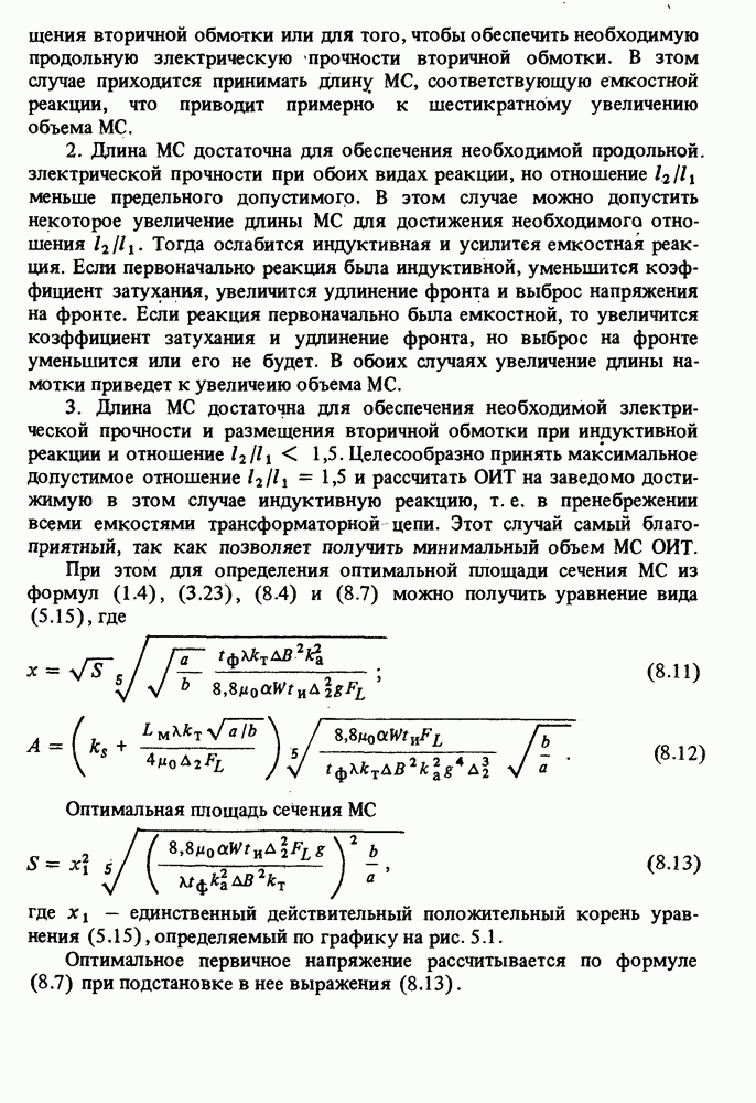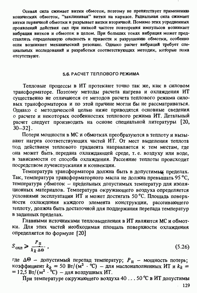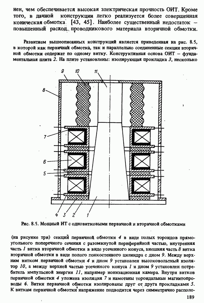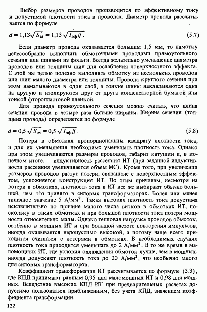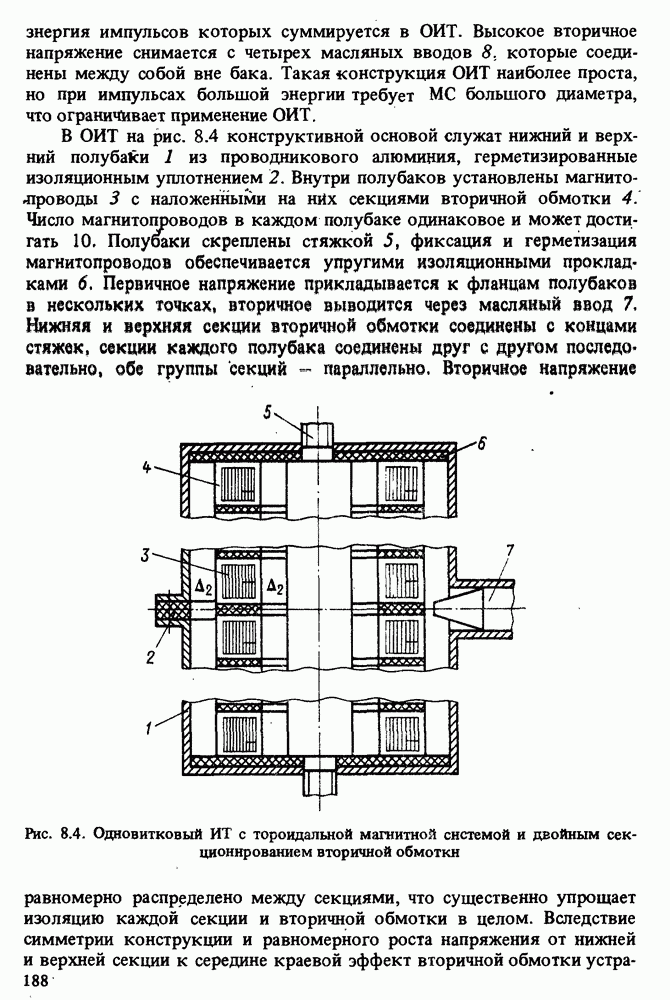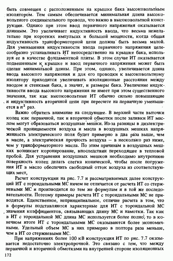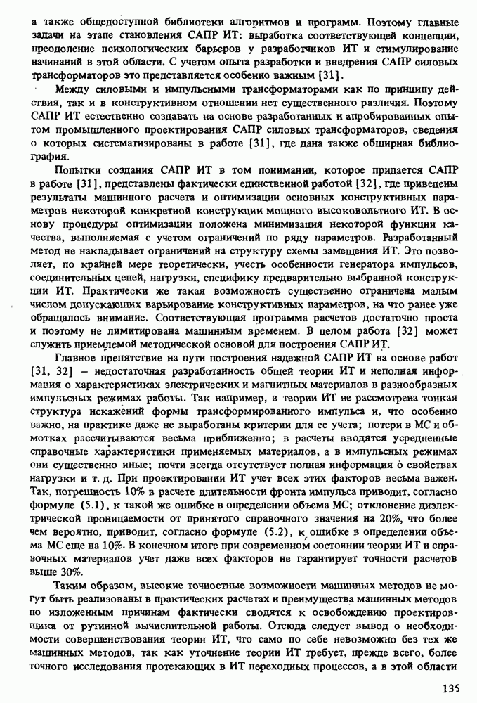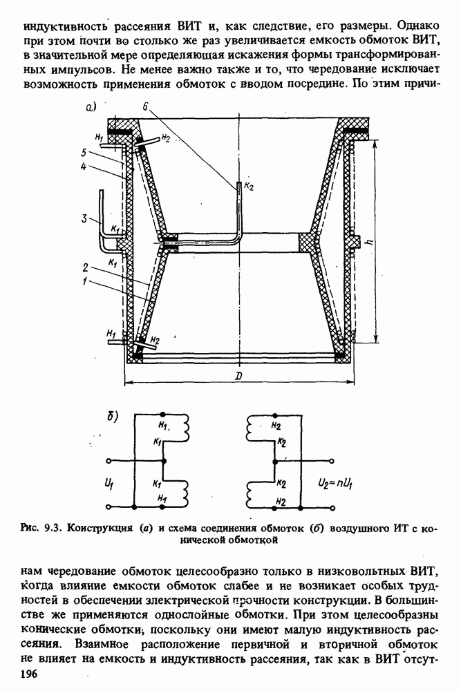 ГЛАВА ПЯТАЯ. ОСНОВЫ ПРОЕКТИРОВАНИЯ5.1. ПОСТАНОВКА ЗАДАЧИПроектирование ИТ состоит в решении комплекса взаимосвязанных частных технических задач. К ним относятся: задача о принципиальной возможности реализации ИТ, удовлетворяющего требованиям в отношении искажений формы трансформированного импульса; выбор конструктивной схемы активной части и общей компоновки ИТ, схемы и конструкции обмоток, изоляционных, магнитных материалов и типа МС; устройство ввода низшего и вывода высшего напряжения; организация режима работы и режима охлаждения МС, расчет конструктивных параметров МС, обмоток, изоляции, электромагнитных и тепловых режимов МС и обмоток; поверочный расчет по завершении отдельных этапов проектирования; оперативное внесение коррективов в ходе проектирования; выбор нормализованных и типовых элементов и повторение поверочных расчетов; оценка технико-экономических и функциональных показателей спроектированного ИТ. Решаемые в процессе проектирования задачи отличаются противоречивостью. Так, например, любые изменения конструкции ИТ, направленные на уменьшение искажений фронта трансформированного импульса или увеличение его напряжения, приводят к снижению всех, без исключения, технико-экономических показателей ИТ. При этом, в частности, увеличивается объем магнитных, проводниковых и изоляционных материалов, растут потери мощности в МС и обмотках, ухудшаются условия теплоотвода. В свою очередь, любые изменения конструкции МС и обмоток, имеющие целью улучшить теплоотвод, дополнительно снижают технико-экономические показатели, усложняют конструкцию и снижают технологичность ИТ. Противоречива также и сама задача уменьшения искажений формы трансформированного импульса. Например, уменьшение искажений вершины, как это следует из критерия осуществимости ИТ, приводит к увеличению искажений фронта и наоборот. Увеличение напряжения трансформированного импульса всегда увеличивает искажения вершины и фронта импульса. В целом можно констатировать, что всякие изменения конструкции с целью повышения функциональных показателей приводят к снижению технико-экономических и, наоборот, повышение технико-экономических показателей снижает функциональные. Таким образом, задача проектирования ИТ выглядит весьма сложной и неоднозначной. По этой причине вне зависимости от выбранной методики и способа расчета проектирование всегда состоит из ряда последовательных расчетных приближений, после выполнения каждого из которых проводится оценка и сопоставление полученных результатов и вносятся необходимые поправки. В связи со сложным и противоречивым характером задач, решаемых в процессе проектирования ИТ, особенно важно выбрать некоторую стратегическую линию проектирования. Для этого необходим простой, но достаточно общий критерий качества ИТ, которым бы учитывались главные технико-экономические показатели ИТ. Этот вопрос подробно исследовался, в результате чего был выработан критерий качества в виде минимума объема активной части ИТ, т. е. минимума объема стали МС и меди обмоток [28]. Обоснованием выбора такого критерия послужило то, что объему активной части пропорциональны потери мощности, стоимость, массогабаритные и другие характеристики ИТ. Если иметь в виду в основном мощные ИТ, критерий в виде минимума об