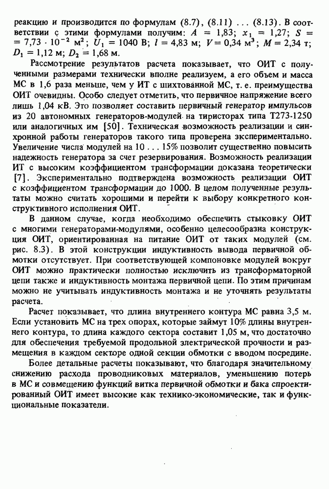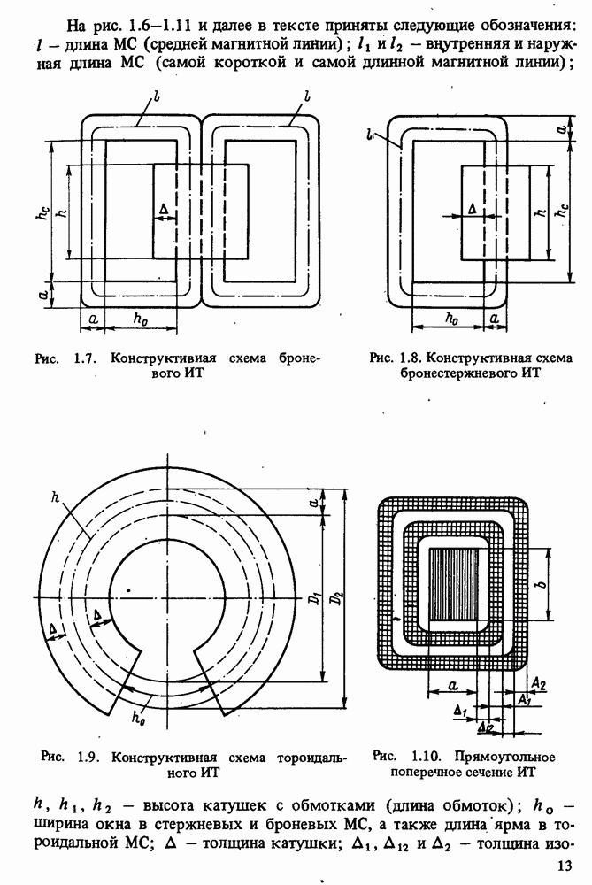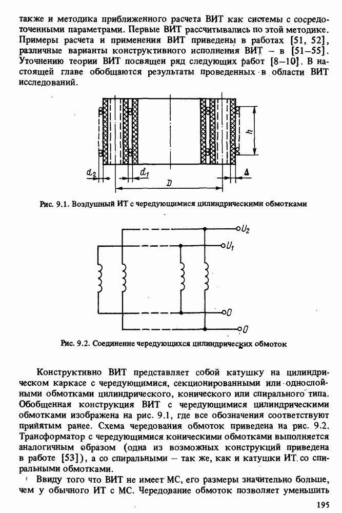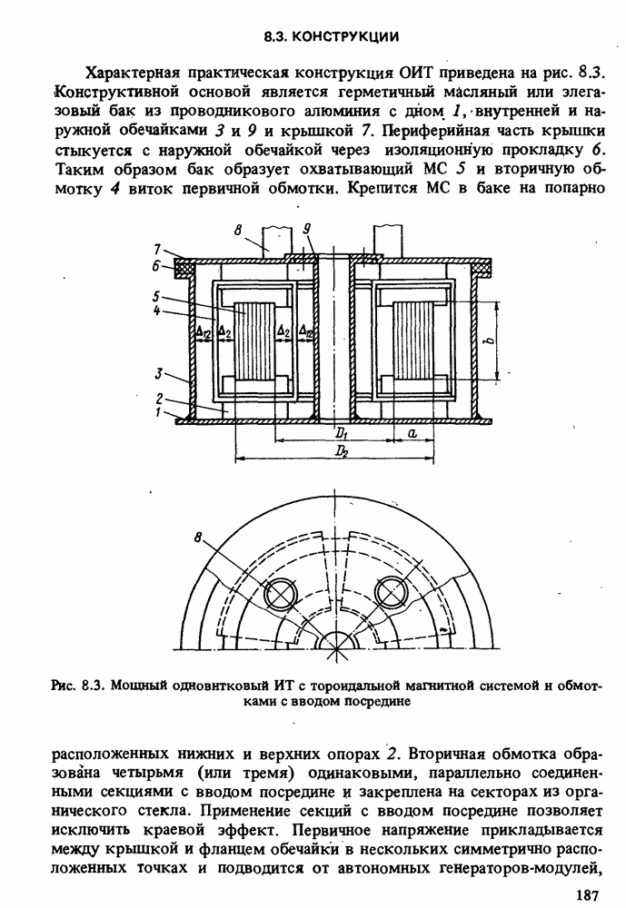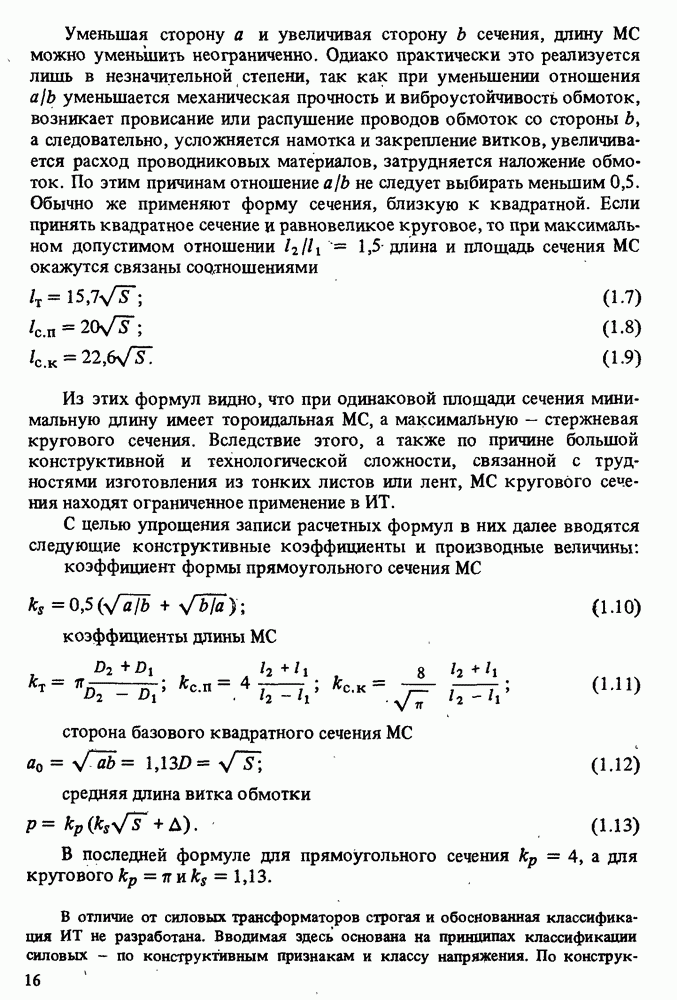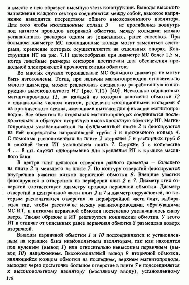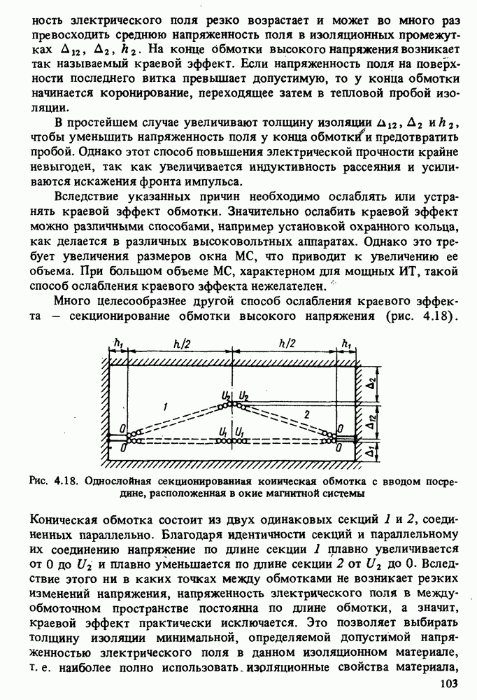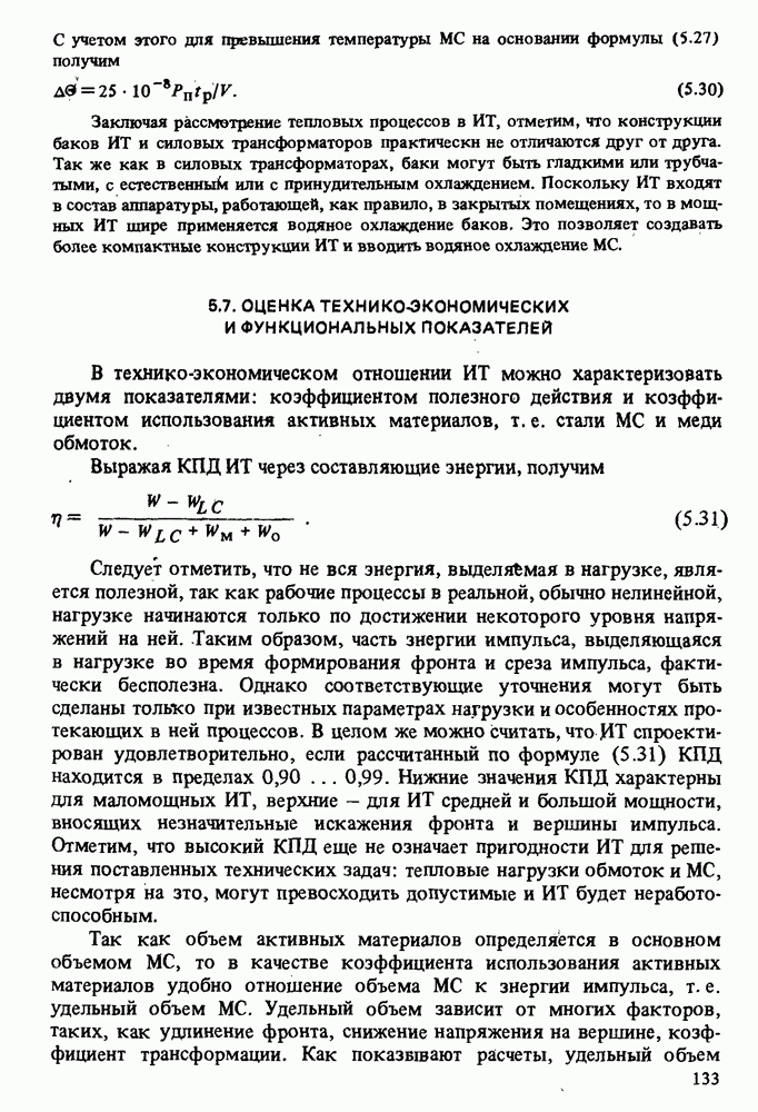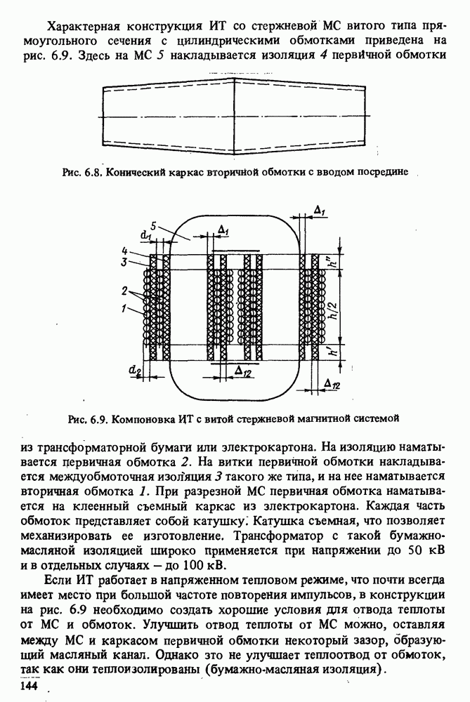 ГЛАВА ПЯТАЯ. ОСНОВЫ ПРОЕКТИРОВАНИЯ5.1. ПОСТАНОВКА ЗАДАЧИПроектирование ИТ состоит в решении комплекса взаимосвязанных частных технических задач. К ним относятся: задача о принципиальной возможности реализации ИТ, удовлетворяющего требованиям в отношении искажений формы трансформированного импульса; выбор конструктивной схемы активной части и общей компоновки ИТ, схемы и конструкции обмоток, изоляционных, магнитных материалов и типа МС; устройство ввода низшего и вывода высшего напряжения; организация режима работы и режима охлаждения МС, расчет конструктивных параметров МС, обмоток, изоляции, электромагнитных и тепловых режимов МС и обмоток; поверочный расчет по завершении отдельных этапов проектирования; оперативное внесение коррективов в ходе проектирования; выбор нормализованных и типовых элементов и повторение поверочных расчетов; оценка технико-экономических и функциональных показателей спроектированного ИТ. Решаемые в процессе проектирования задачи отличаются противоречивостью. Так, например, любые изменения конструкции ИТ, направленные на уменьшение искажений фронта трансформированного импульса или увеличение его напряжения, приводят к снижению всех, без исключения, технико-экономических показателей ИТ. При этом, в частности, увеличивается объем магнитных, проводниковых и изоляционных материалов, растут потери мощности в МС и обмотках, ухудшаются условия теплоотвода. В свою очередь, любые изменения конструкции МС и обмоток, имеющие целью улучшить теплоотвод, дополнительно снижают технико-экономические показатели, усложняют конструкцию и снижают технологичность ИТ. Противоречива также и сама задача уменьшения искажений формы трансформированного импульса. Например, уменьшение искажений вершины, как это следует из критерия осуществимости ИТ, приводит к увеличению искажений фронта и наоборот. Увеличение напряжения трансформированного импульса всегда увеличивает искажения вершины и фронта импульса. В целом можно констатировать, что всякие изменения конструкции с целью повышения функциональных показателей приводят к снижению технико-экономических и, наоборот, повышение технико-экономических показателей снижает функциональные. Таким образом, задача проектирования ИТ выглядит весьма сложной и неоднозначной. По этой причине вне зависимости от выбранной методики и способа расчета проектирование всегда состоит из ряда последовательных расчетных приближений, после выполнения каждого из которых проводится оценка и сопоставление полученных результатов и вносятся необходимые поправки. В связи со сложным и противоречивым характером задач, решаемых в процессе проектирования ИТ, особенно важно выбрать некоторую стратегическую линию проектирования. Для этого необходим простой, но достаточно общий критерий качества ИТ, которым бы учитывались главные технико-экономические показатели ИТ. Этот вопрос подробно исследовался, в результате чего был выработан критерий качества в виде минимума объема активной части ИТ, т. е. минимума объема стали МС и меди обмоток [28]. Обоснованием выбора такого критерия послужило то, что объему активной части пропорциональны потери мощности, стоимость, массогабаритные и другие характеристики ИТ. Если иметь в виду в основном мощные ИТ, критерий в виде минимума об