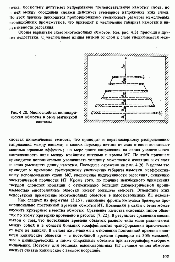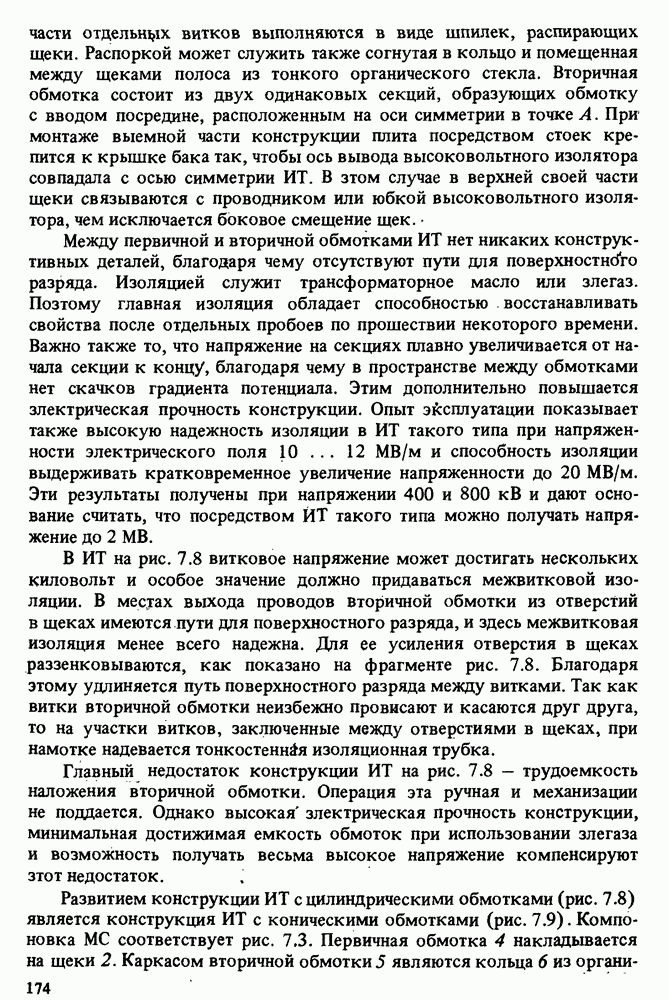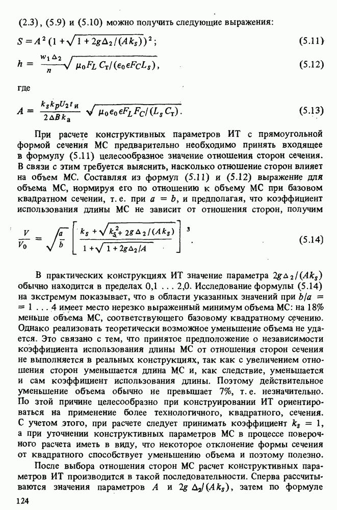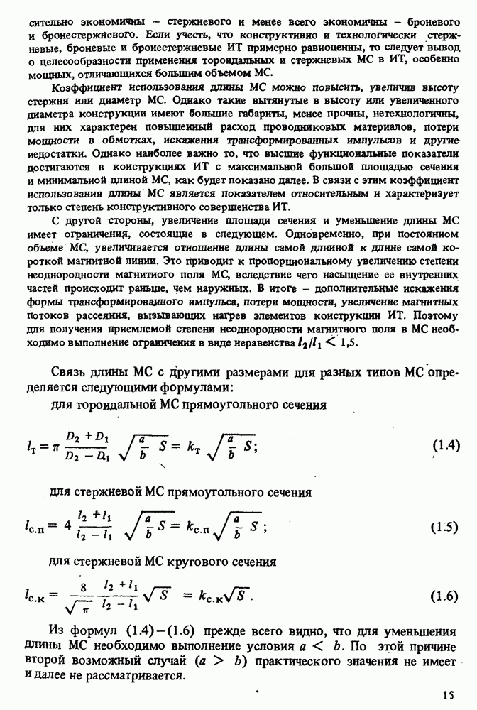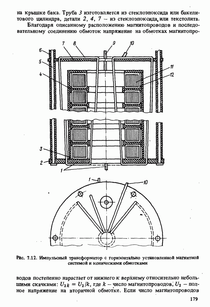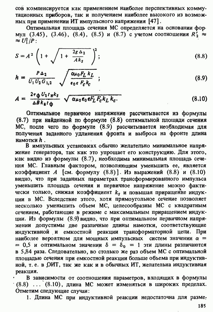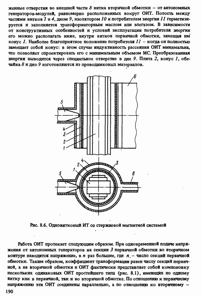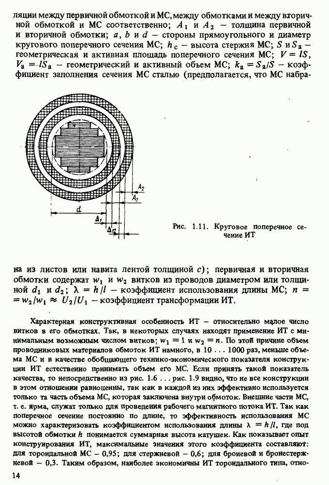 ГЛАВА ПЯТАЯ. ОСНОВЫ ПРОЕКТИРОВАНИЯ5.1. ПОСТАНОВКА ЗАДАЧИПроектирование ИТ состоит в решении комплекса взаимосвязанных частных технических задач. К ним относятся: задача о принципиальной возможности реализации ИТ, удовлетворяющего требованиям в отношении искажений формы трансформированного импульса; выбор конструктивной схемы активной части и общей компоновки ИТ, схемы и конструкции обмоток, изоляционных, магнитных материалов и типа МС; устройство ввода низшего и вывода высшего напряжения; организация режима работы и режима охлаждения МС, расчет конструктивных параметров МС, обмоток, изоляции, электромагнитных и тепловых режимов МС и обмоток; поверочный расчет по завершении отдельных этапов проектирования; оперативное внесение коррективов в ходе проектирования; выбор нормализованных и типовых элементов и повторение поверочных расчетов; оценка технико-экономических и функциональных показателей спроектированного ИТ. Решаемые в процессе проектирования задачи отличаются противоречивостью. Так, например, любые изменения конструкции ИТ, направленные на уменьшение искажений фронта трансформированного импульса или увеличение его напряжения, приводят к снижению всех, без исключения, технико-экономических показателей ИТ. При этом, в частности, увеличивается объем магнитных, проводниковых и изоляционных материалов, растут потери мощности в МС и обмотках, ухудшаются условия теплоотвода. В свою очередь, любые изменения конструкции МС и обмоток, имеющие целью улучшить теплоотвод, дополнительно снижают технико-экономические показатели, усложняют конструкцию и снижают технологичность ИТ. Противоречива также и сама задача уменьшения искажений формы трансформированного импульса. Например, уменьшение искажений вершины, как это следует из критерия осуществимости ИТ, приводит к увеличению искажений фронта и наоборот. Увеличение напряжения трансформированного импульса всегда увеличивает искажения вершины и фронта импульса. В целом можно констатировать, что всякие изменения конструкции с целью повышения функциональных показателей приводят к снижению технико-экономических и, наоборот, повышение технико-экономических показателей снижает функциональные. Таким образом, задача проектирования ИТ выглядит весьма сложной и неоднозначной. По этой причине вне зависимости от выбранной методики и способа расчета проектирование всегда состоит из ряда последовательных расчетных приближений, после выполнения каждого из которых проводится оценка и сопоставление полученных результатов и вносятся необходимые поправки. В связи со сложным и противоречивым характером задач, решаемых в процессе проектирования ИТ, особенно важно выбрать некоторую стратегическую линию проектирования. Для этого необходим простой, но достаточно общий критерий качества ИТ, которым бы учитывались главные технико-экономические показатели ИТ. Этот вопрос подробно исследовался, в результате чего был выработан критерий качества в виде минимума объема активной части ИТ, т. е. минимума объема стали МС и меди обмоток [28]. Обоснованием выбора такого критерия послужило то, что объему активной части пропорциональны потери мощности, стоимость, массогабаритные и другие характеристики ИТ. Если иметь в виду в основном мощные ИТ, критерий в виде минимума об