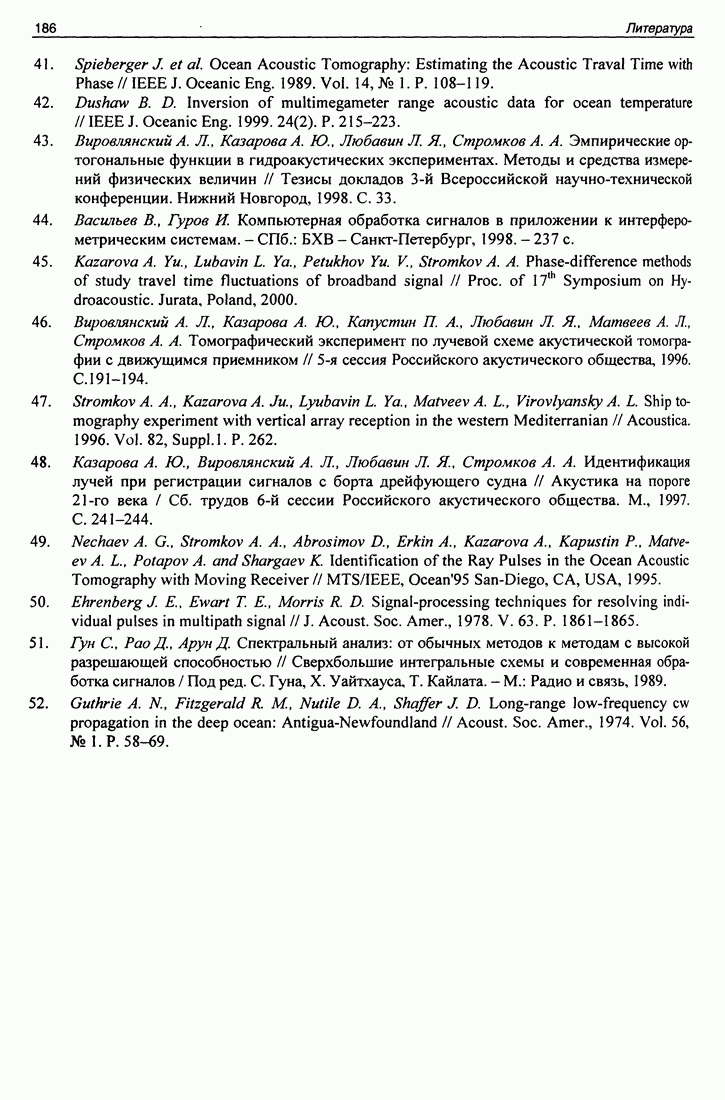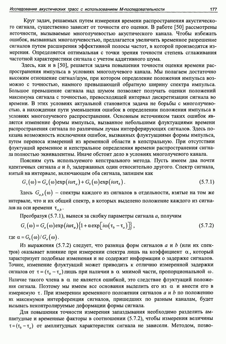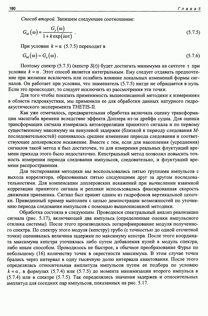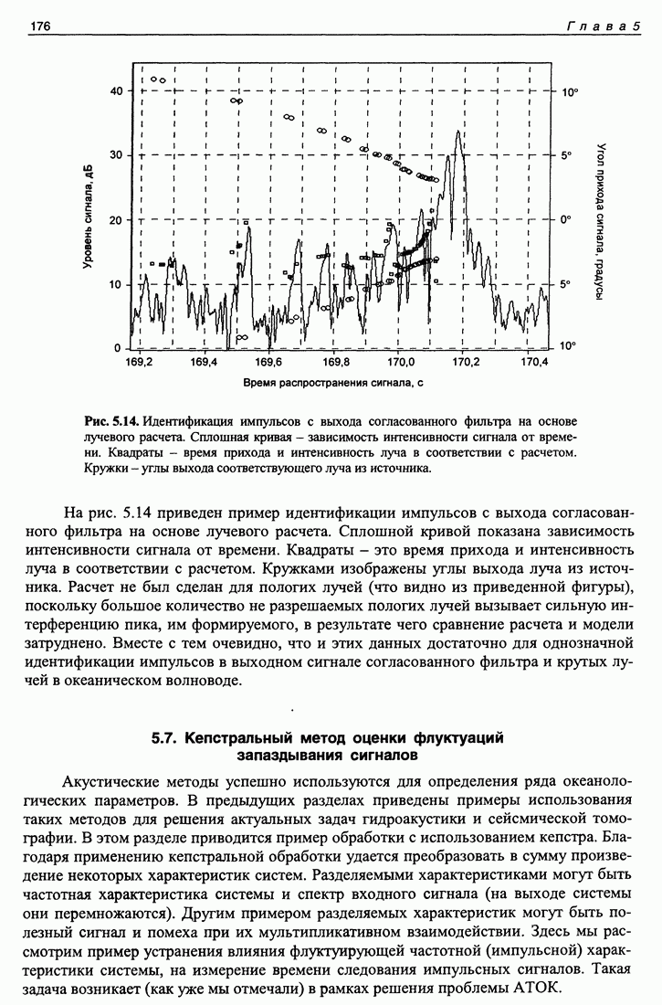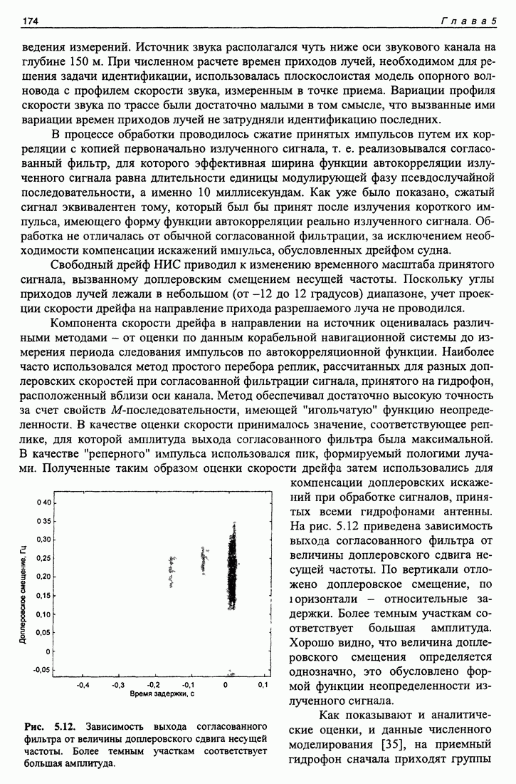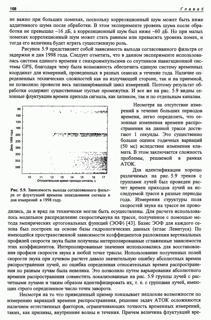 Рис. 5.9. Зависимость выхода согласованного фильтра от флуктуаций времени запаздывания сигнала и дня измерений в 1998 году. Несмотря на отсутствие измерений в течение больших периодов времени, легко определить, что сезонные изменения времени распространения на данной трассе достигают 1 секунды. Это существенно больше оценок годичных вариаций (50 мс) вследствие изменения климата. В этом заключается сложность проблемы, решаемой в рамках АТОК. Для идентификации хорошо различимых на рис. 5.9 треков с группами лучей был проведен расчет времен приходов лучей на исследуемой трассе в разные периоды года. Измерения структуры поля скоростей звука на трассе не проводились, да и вряд ли технически могли быть осуществлены. Для расчета использовалось модельное распределение скоростичзвука на трассе, полученное с помощью метода эмпирических ортогональных функций (ЭОФ) [43]. Базис ЭОФ для каждого сезона был построен на основе базы гидрологических данных (атлас Левитуса). По имеющейся пространственной зависимости коэффициентов разложения вертикальных профилей скорости звука были получены интерполированные сглаженные зависимости этих коэффициентов. Интерполированные значения использовались для восстановления профиля скорости звука в любой точке трассы. Использование полученных полей скорости звука при лучевом расчете давало значительную ошибку абсолютных времен распространения лучей, но ошибка определения относительных времен распространения по разным лучам была невелика. Это позволило путем варьирования абсолютного времени распространения совместить локализованные на рис. 5.9 группы лучей с расчетными лучами и таким образом идентифицировать их, т. е. с группами лучей, имеющих строго определенное число точек заворота. Несмотря на то что приведенный пример показывает неплохие возможности по измерению вариаций времени распространения, решение задач АТОК осложняются наличием естественных факторов, ограничивающих точность временных измерений, таких, как приливы, внутренние волны и течения. Причем величина флуктуаций времени распространения по этим причинам может быть одного порядка с сезонными и многолетними изменениями времени распространения сигнала. Поэтому исследование флуктуаций времени распространения, разработка модели их воздействия на время распространения имеет большое значение для проблемы АТОК. Исследование флуктуаций времени распространения и их идентификация с физическими явлениями в океане является и самостоятельной задачей изучения волновых процессов в океане, и необходимым условием повышения устойчивости решений томографических задач и проблем АТОК. Применение сигналов на основе М-последовательности позволяет одновременно с измерением медленных вариаций измерить и быстрые. Рассмотрим различные алгоритмы измерения флуктуаций времени распространения при прохождении сигнала через линейную систему. Одним из наиболее ранних и простых методов исследования флуктуаций был метод с использованием тонального сигнала, подаваемого на вход системы. Из уравнения (5.2.4) видно что измерения разности фаз между входным и выходным сигналами одноканальной линейной системы при использовании гармонического сигнала дают возможность измерять фазу частотной характеристики системы Рассмотрим пример оцениван