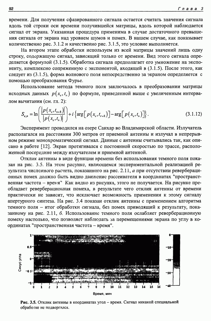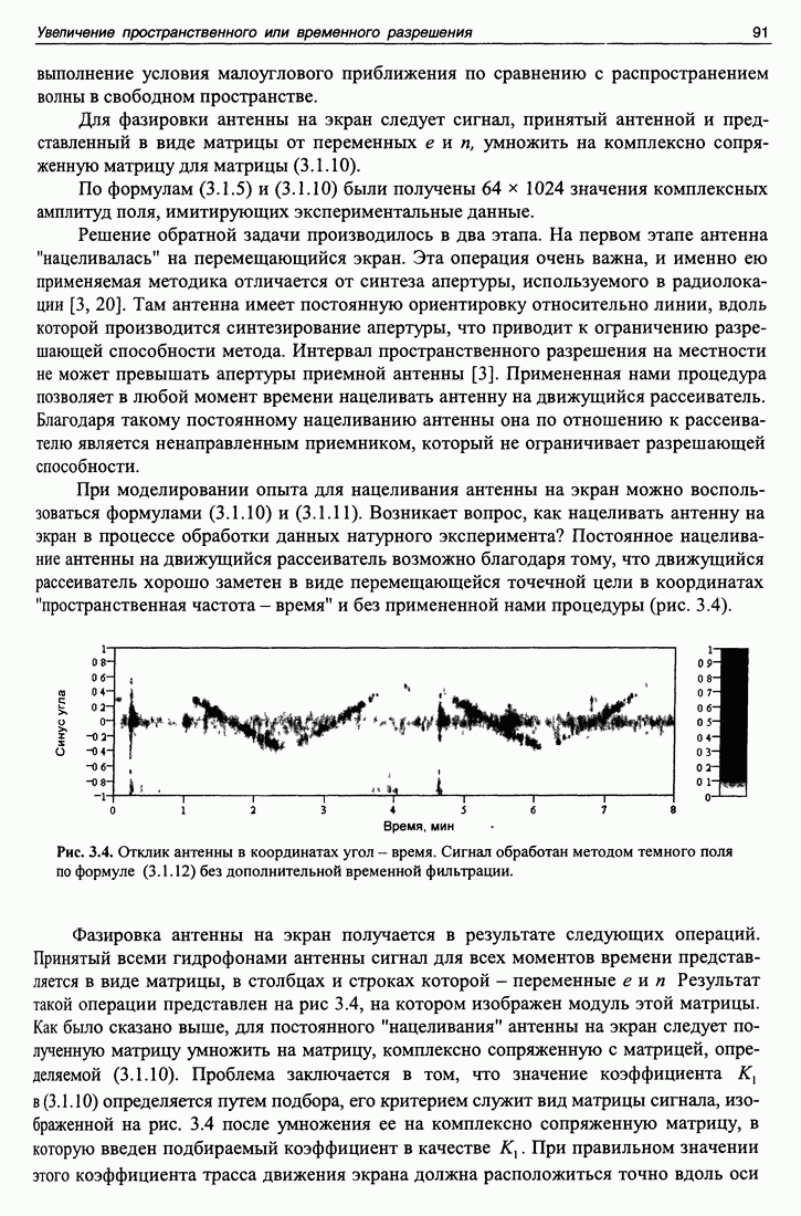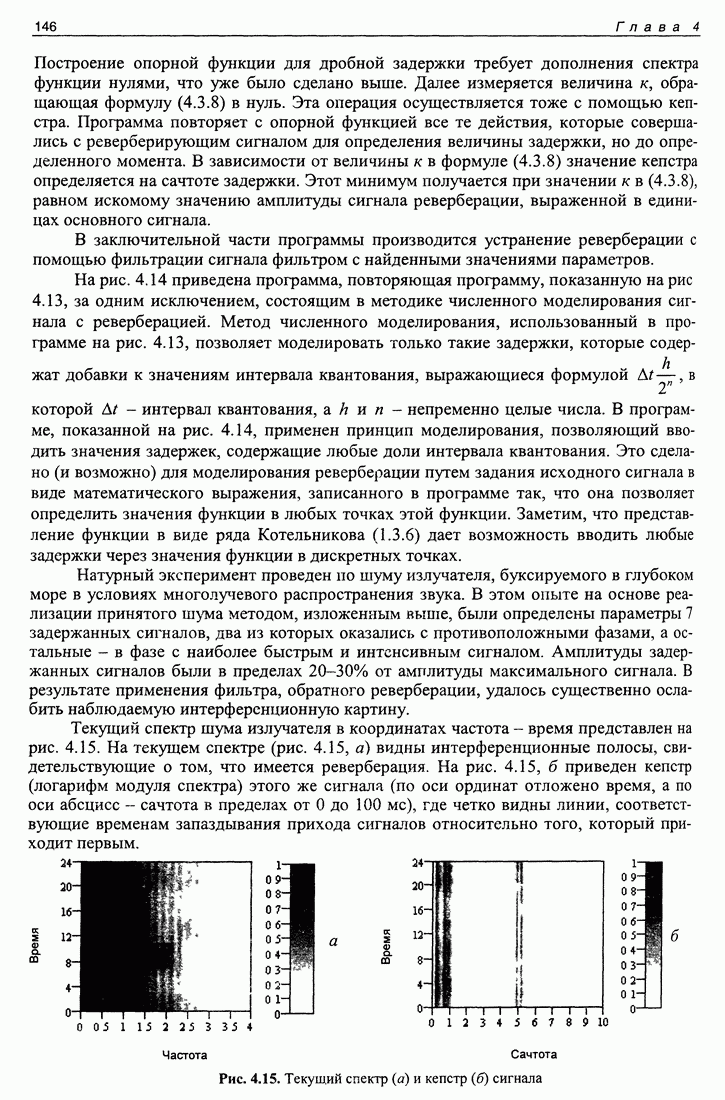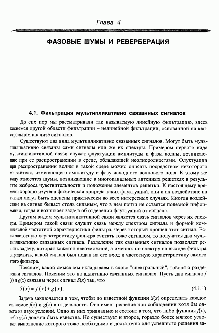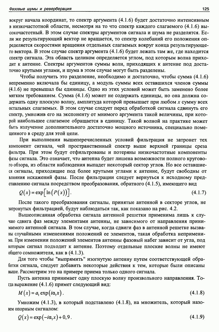 Рис. 5.9. Зависимость выхода согласованного фильтра от флуктуаций времени запаздывания сигнала и дня измерений в 1998 году. Несмотря на отсутствие измерений в течение больших периодов времени, легко определить, что сезонные изменения времени распространения на данной трассе достигают 1 секунды. Это существенно больше оценок годичных вариаций (50 мс) вследствие изменения климата. В этом заключается сложность проблемы, решаемой в рамках АТОК. Для идентификации хорошо различимых на рис. 5.9 треков с группами лучей был проведен расчет времен приходов лучей на исследуемой трассе в разные периоды года. Измерения структуры поля скоростей звука на трассе не проводились, да и вряд ли технически могли быть осуществлены. Для расчета использовалось модельное распределение скоростичзвука на трассе, полученное с помощью метода эмпирических ортогональных функций (ЭОФ) [43]. Базис ЭОФ для каждого сезона был построен на основе базы гидрологических данных (атлас Левитуса). По имеющейся пространственной зависимости коэффициентов разложения вертикальных профилей скорости звука были получены интерполированные сглаженные зависимости этих коэффициентов. Интерполированные значения использовались для восстановления профиля скорости звука в любой точке трассы. Использование полученных полей скорости звука при лучевом расчете давало значительную ошибку абсолютных времен распространения лучей, но ошибка определения относительных времен распространения по разным лучам была невелика. Это позволило путем варьирования абсолютного времени распространения совместить локализованные на рис. 5.9 группы лучей с расчетными лучами и таким образом идентифицировать их, т. е. с группами лучей, имеющих строго определенное число точек заворота. Несмотря на то что приведенный пример показывает неплохие возможности по измерению вариаций времени распространения, решение задач АТОК осложняются наличием естественных факторов, ограничивающих точность временных измерений, таких, как приливы, внутренние волны и течения. Причем величина флуктуаций времени распространения по этим причинам может быть одного порядка с сезонными и многолетними изменениями времени распространения сигнала. Поэтому исследование флуктуаций времени распространения, разработка модели их воздействия на время распространения имеет большое значение для проблемы АТОК. Исследование флуктуаций времени распространения и их идентификация с физическими явлениями в океане является и самостоятельной задачей изучения волновых процессов в океане, и необходимым условием повышения устойчивости решений томографических задач и проблем АТОК. Применение сигналов на основе М-последовательности позволяет одновременно с измерением медленных вариаций измерить и быстрые. Рассмотрим различные алгоритмы измерения флуктуаций времени распространения при прохождении сигнала через линейную систему. Одним из наиболее ранних и простых методов исследования флуктуаций был метод с использованием тонального сигнала, подаваемого на вход системы. Из уравнения (5.2.4) видно что измерения разности фаз между входным и выходным сигналами одноканальной линейной системы при использовании гармонического сигнала дают возможность измерять фазу частотной характеристики системы Рассмотрим пример оцениван