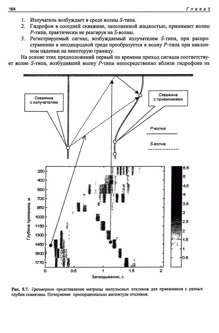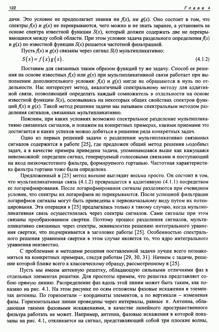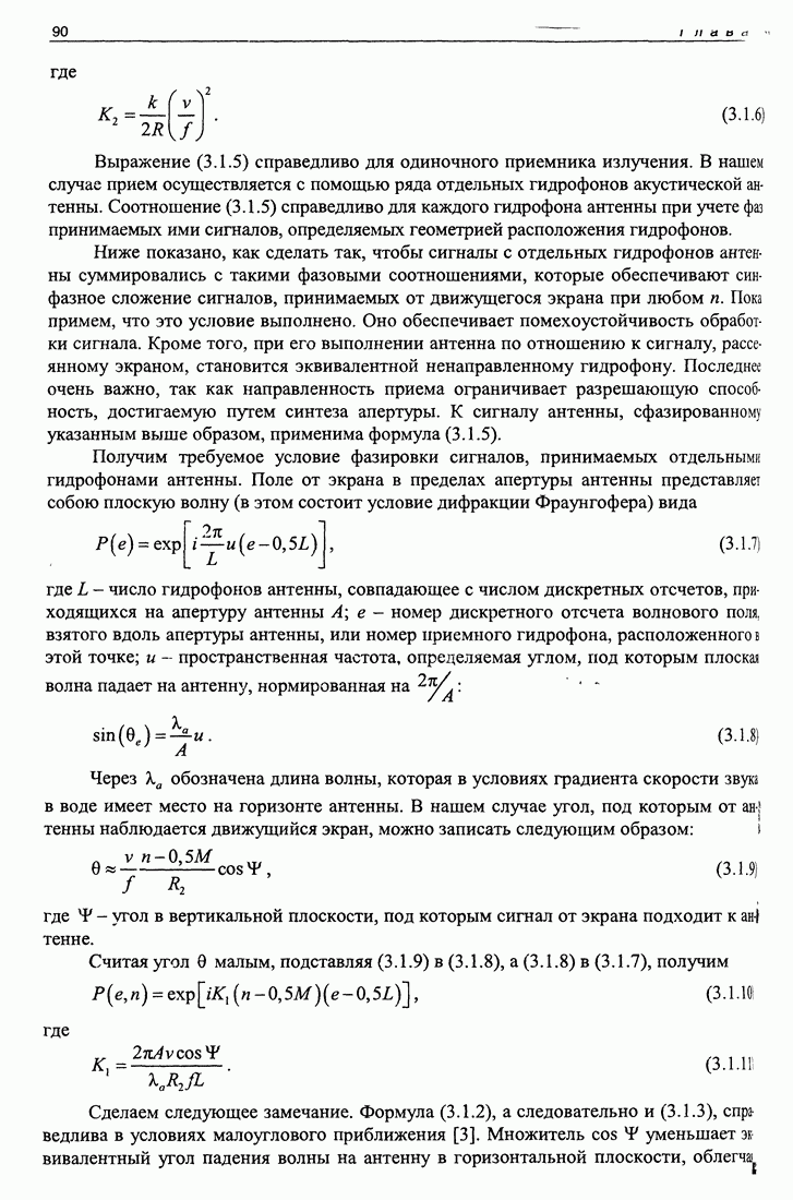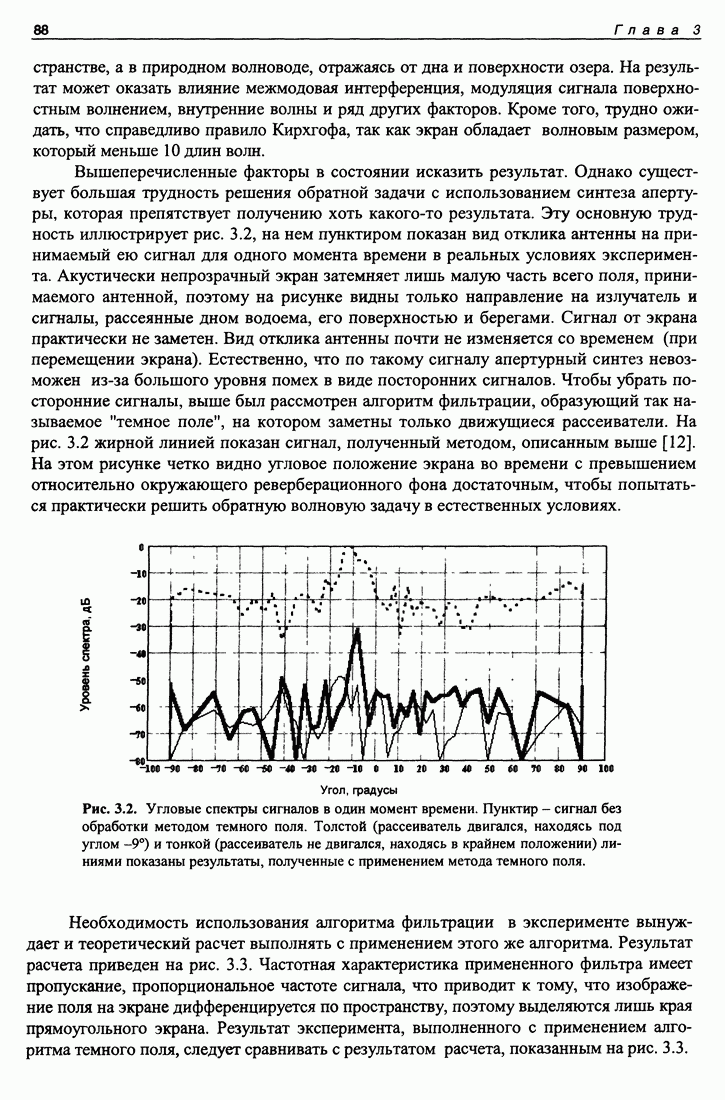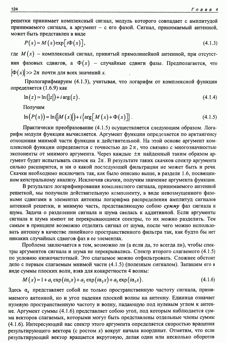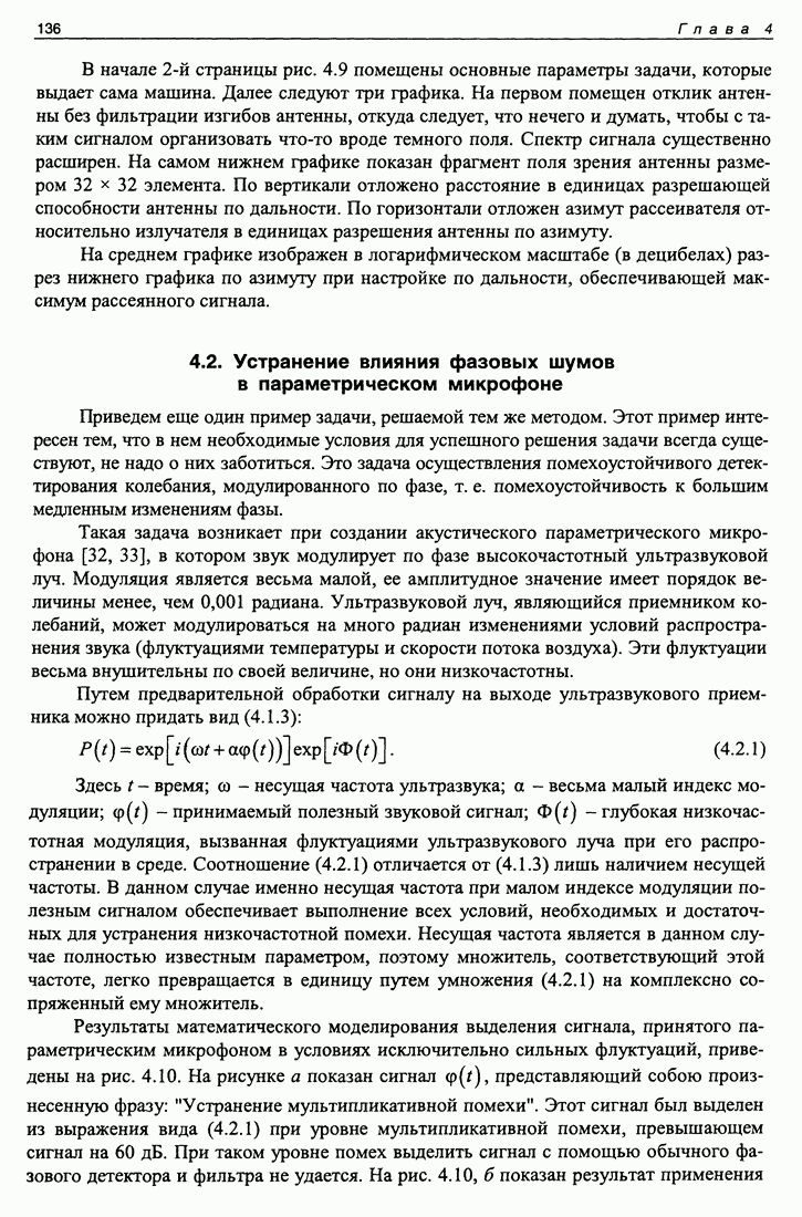 Рис. 5.9. Зависимость выхода согласованного фильтра от флуктуаций времени запаздывания сигнала и дня измерений в 1998 году. Несмотря на отсутствие измерений в течение больших периодов времени, легко определить, что сезонные изменения времени распространения на данной трассе достигают 1 секунды. Это существенно больше оценок годичных вариаций (50 мс) вследствие изменения климата. В этом заключается сложность проблемы, решаемой в рамках АТОК. Для идентификации хорошо различимых на рис. 5.9 треков с группами лучей был проведен расчет времен приходов лучей на исследуемой трассе в разные периоды года. Измерения структуры поля скоростей звука на трассе не проводились, да и вряд ли технически могли быть осуществлены. Для расчета использовалось модельное распределение скоростичзвука на трассе, полученное с помощью метода эмпирических ортогональных функций (ЭОФ) [43]. Базис ЭОФ для каждого сезона был построен на основе базы гидрологических данных (атлас Левитуса). По имеющейся пространственной зависимости коэффициентов разложения вертикальных профилей скорости звука были получены интерполированные сглаженные зависимости этих коэффициентов. Интерполированные значения использовались для восстановления профиля скорости звука в любой точке трассы. Использование полученных полей скорости звука при лучевом расчете давало значительную ошибку абсолютных времен распространения лучей, но ошибка определения относительных времен распространения по разным лучам была невелика. Это позволило путем варьирования абсолютного времени распространения совместить локализованные на рис. 5.9 группы лучей с расчетными лучами и таким образом идентифицировать их, т. е. с группами лучей, имеющих строго определенное число точек заворота. Несмотря на то что приведенный пример показывает неплохие возможности по измерению вариаций времени распространения, решение задач АТОК осложняются наличием естественных факторов, ограничивающих точность временных измерений, таких, как приливы, внутренние волны и течения. Причем величина флуктуаций времени распространения по этим причинам может быть одного порядка с сезонными и многолетними изменениями времени распространения сигнала. Поэтому исследование флуктуаций времени распространения, разработка модели их воздействия на время распространения имеет большое значение для проблемы АТОК. Исследование флуктуаций времени распространения и их идентификация с физическими явлениями в океане является и самостоятельной задачей изучения волновых процессов в океане, и необходимым условием повышения устойчивости решений томографических задач и проблем АТОК. Применение сигналов на основе М-последовательности позволяет одновременно с измерением медленных вариаций измерить и быстрые. Рассмотрим различные алгоритмы измерения флуктуаций времени распространения при прохождении сигнала через линейную систему. Одним из наиболее ранних и простых методов исследования флуктуаций был метод с использованием тонального сигнала, подаваемого на вход системы. Из уравнения (5.2.4) видно что измерения разности фаз между входным и выходным сигналами одноканальной линейной системы при использовании гармонического сигнала дают возможность измерять фазу частотной характеристики системы Рассмотрим пример оцениван