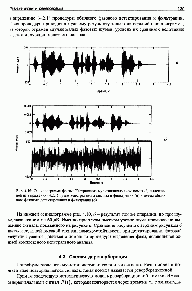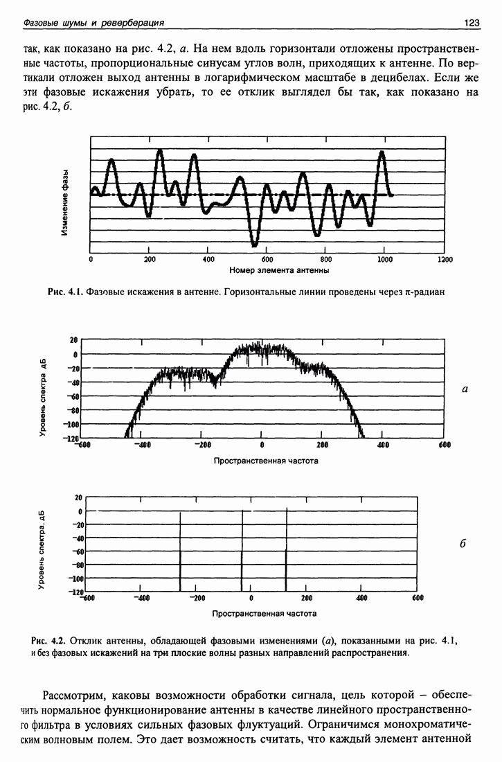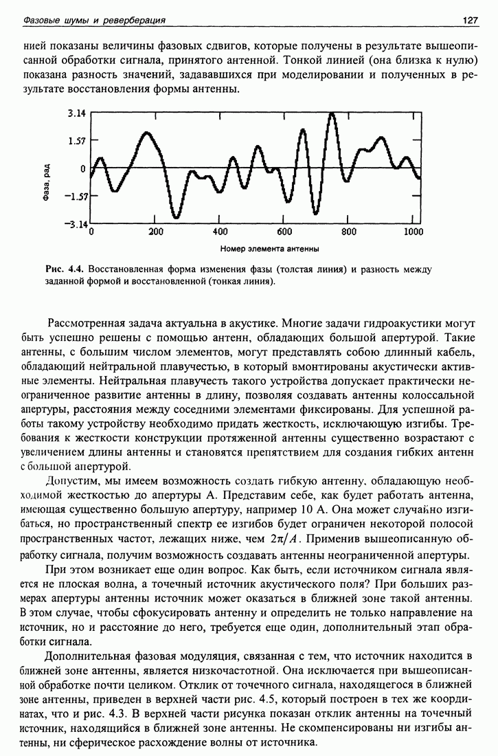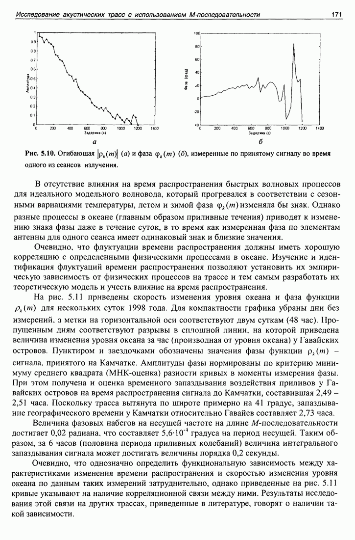 Рис. 5.11. Скорость изменения уровня океана и фаза функции Приведенные в этой части примеры иллюстрируют возможности сигнала в виде несущей с модуляцией М-последовательностью идентифицировать отдельные каналы распространения, измерять большие (до 10 секунд) и малые (0,02 радиана от периода несущей или 0,0001 с) флуктуации времени распространения. Из приведенных примеров становится понятна оптимальность использования М-последовательности в качестве тестового сигнала. Конечно, применяя тональный тестовый сигнал можно было бы измерить быстрые флуктуации времени распространения, однако при этом невозможно было бы измерить их сезонные вариации, выделить и идентифицировать отдельные группы лучей.