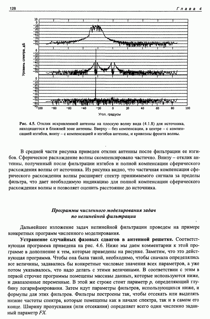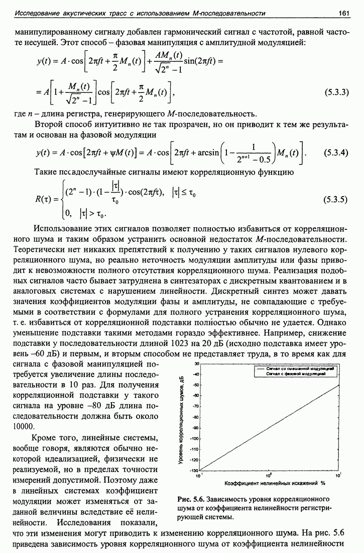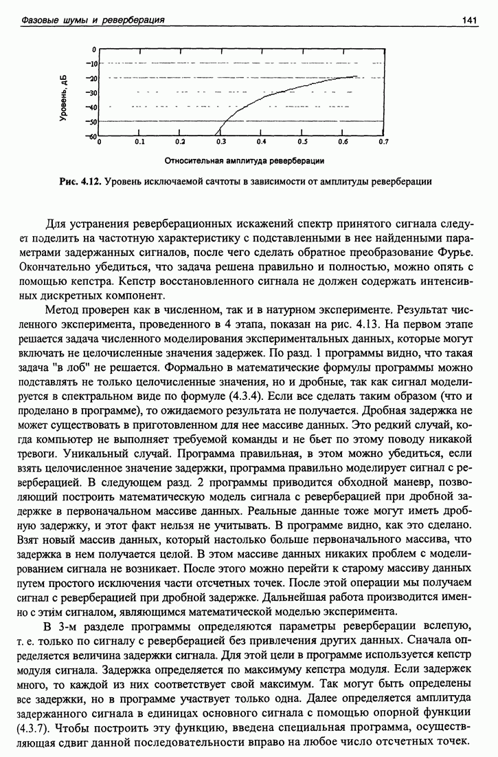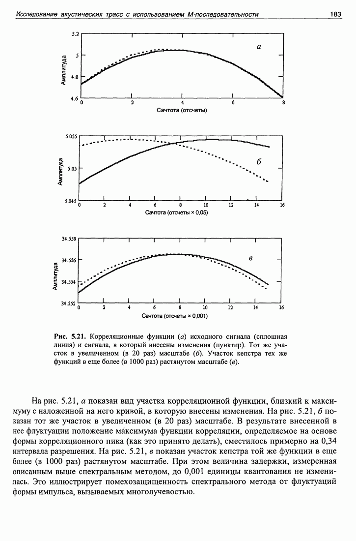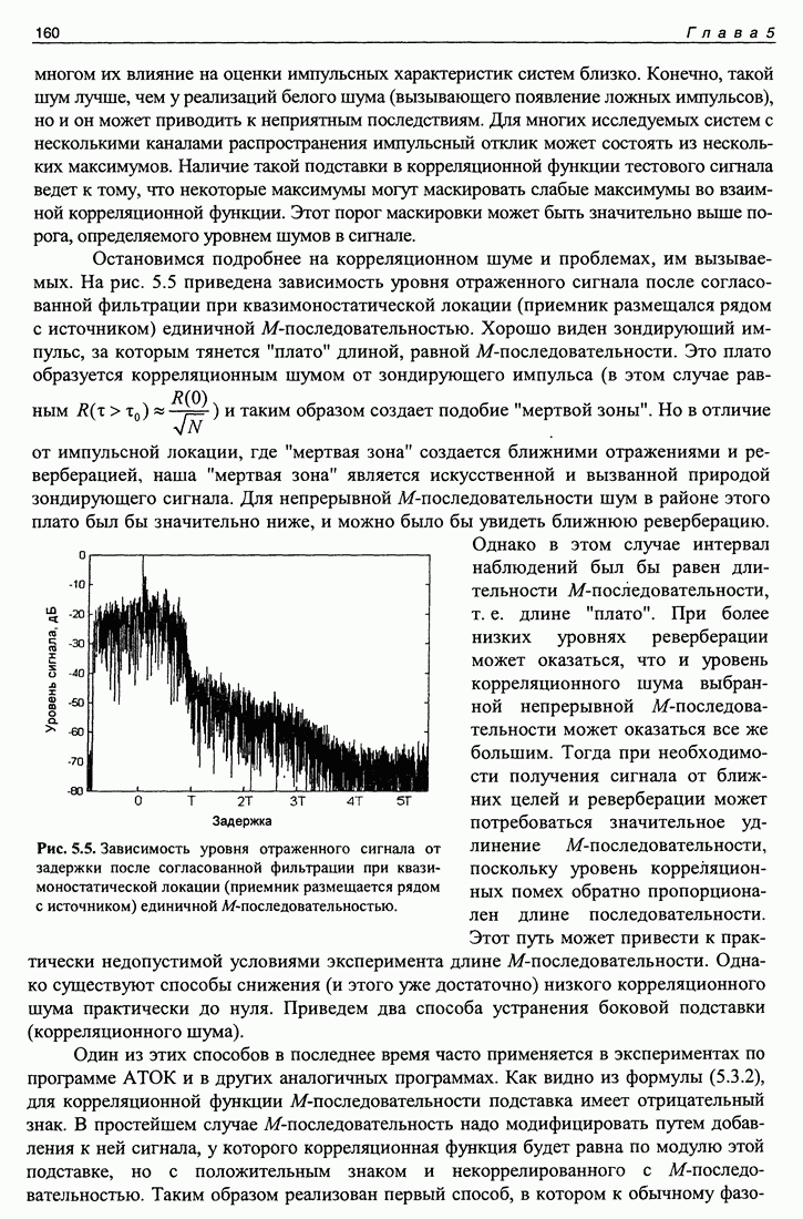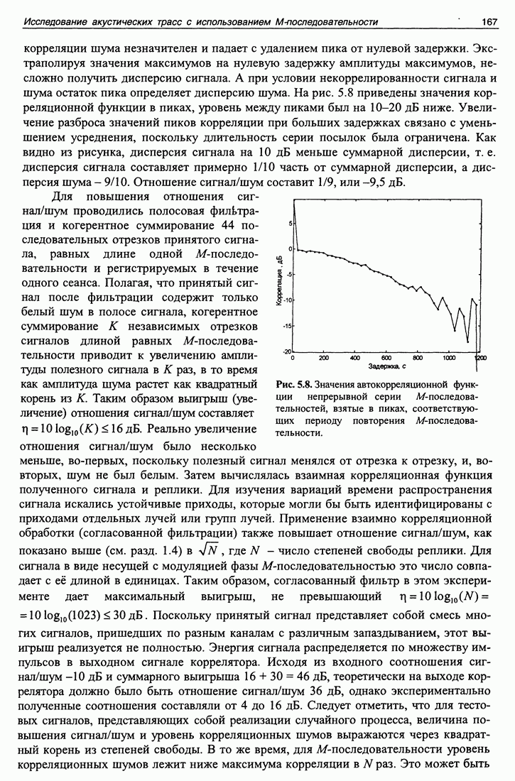 Рис. 5.8. Значения автокорреляционной функции непрерывной серии М-последова-тельностей, взятые в пиках, соответствующих периоду повторения М-последовательности. не важно при больших помехах, поскольку корреляционный шум может быть ниже аддитивного шума после обработки. В этом эксперименте уровень шума после обработки не превышал -16 дБ, а корреляционный шум был ниже -60 дБ. Но при малых помехах корреляционный шум может стать равным или превысить уровень помех, и тогда его величина будет играть существенную роль. Рисунок 5.9 представляет собой зависимость выхода согласованного фильтра от задержки и дня 1998 года. Следует отметить, что в данном эксперименте использовалась система единого времени с синхроимпульсами со спутников навигационной системы GPS, благодаря чему была возможность обеспечить единую систему временных координат для измерений, проведенных в разных сеансах в течение года. Наличие определенных технических сложностей как на излучающей стороне, так и на приемной, не позволило провести весь запланированный цикл измерений. Поэтому результат обработки содержит существенные пустые промежутки. И все же на рис. 5.9 видны сезонные флуктуации времен прихода сигнала, как целиком, так и по отдельным каналам.