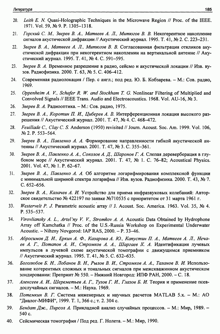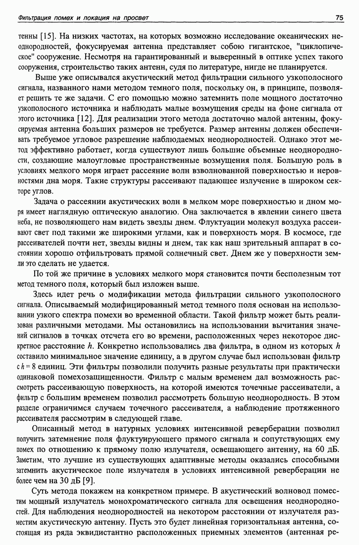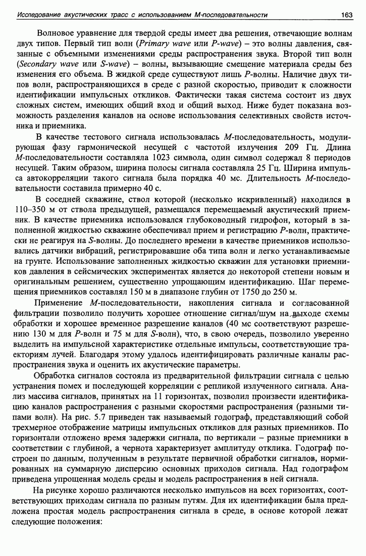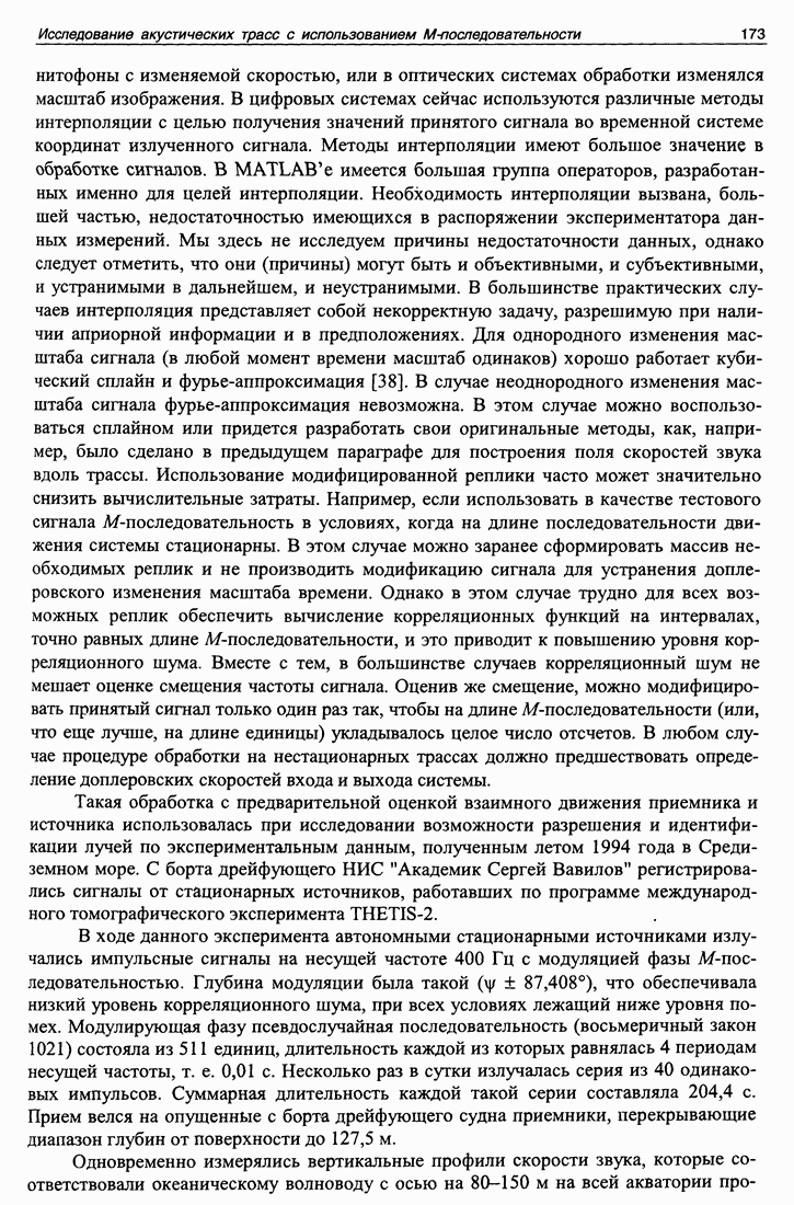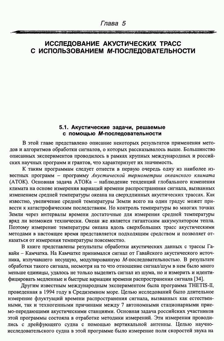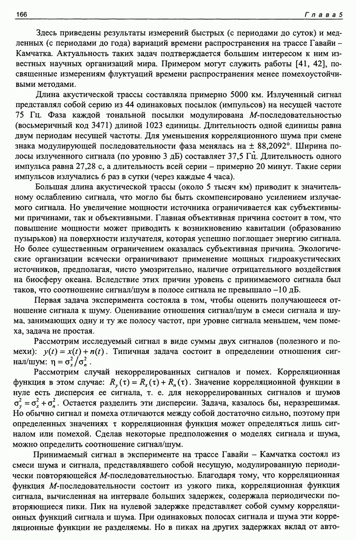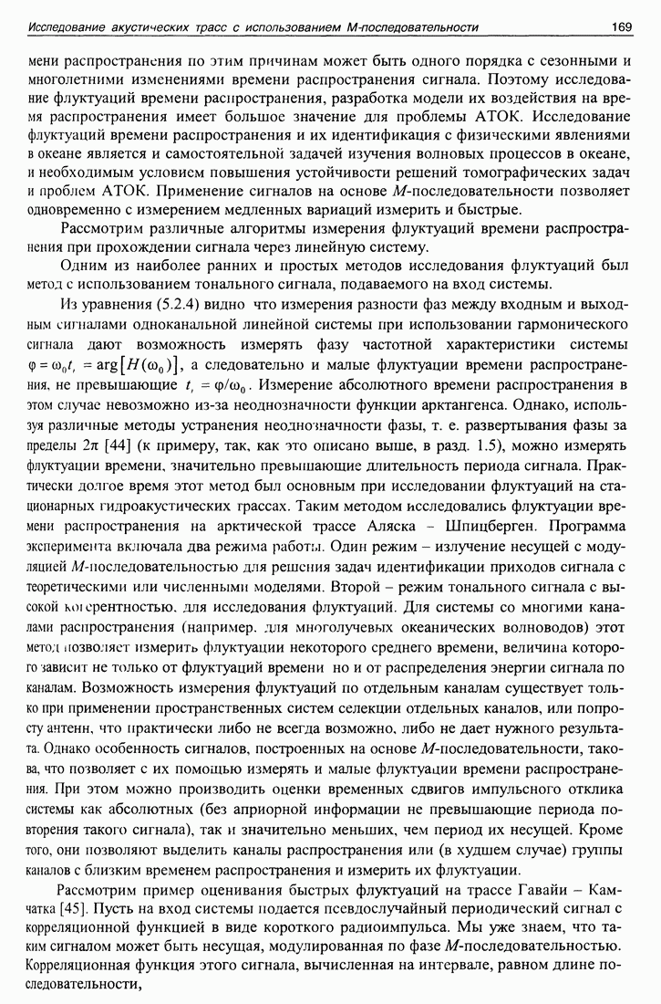 5.5. Применение М-последовательности на сверхдлинных океанических трассахИспользование тестовых сигналов на основе М-последовательности на стационарных трассах иллюстрирует возможности разделения каналов и их идентификации с теоретическими моделями в многоканальных системах. В настоящем разделе мы рассмотрим примеры применения М-последовательностей для идентификации каналов распространения в лучевом приближении и оценки их параметров, а также измерения быстрых и медленных вариаций времени распространения. В 1998 и 1999 годах в рамках проекта АТОК на стационарной акустической трассе в северной части Тихого океана проводился совместный российско-американский эксперимент по сверхдальнему распространению низкочастотного звука. Сигналы, излучаемые стационарным источником, находящимся на глубине 800 м около Гавайских островов, регистрировались на многоэлементные приемные системы США и России, стационарно установленные в акватории Тихого океана. Целью экспериментов было определение вариаций как интегрального времени распространения сигнала, так и по отдельным группам лучевых каналов на стационарных трассах, вызванных глобальными (многолетними) и сезонными изменениями климата. В результате выполнения проекта АТОК в целом должен быть получен ответ, есть или нет глобальное потепление климата. В том эксперименте, о котором идет речь, нащупывалась методика измерения, определялась та точность, которая может быть достигнута в результате длительных наблюдений на протяженной акустической трассе, уточнялись и технические параметры, достижимые или необходимые в ходе такого эксперимента. Здесь приведены результаты измерений быстрых (с периодами до суток) и медленных (с периодами до года) вариаций времени распространения на трассе Гавайи -Камчатка. Актуальность таких задач подтверждается большим интересом к ним известных научных организаций мира. Примером могут служить работы [41, 42], посвященные измерениям флуктуаций времени распространения менее помехоустойчивыми методами. Длина акустической трассы составляла примерно 5000 км. Излученный сигнал представлял собой серию из 44 одинаковых посылок (импульсов) на несущей частоте 75 Гц. Фаза каждой тональной посылки модулирована М-последовательностью (восьмеричный код 3471) длиной 1023 единицы. Длительность одной единицы равна двум периодам несущей частоты. Для уменьшения корреляционного шума при смене знака модулирующей последовательности фаза менялась на ±88,2092°. Ширина полосы излученного сигнала (по уровню 3 дБ) составляет 37,5 Гц. Длительность одного импульса равна 27,28 с, а длительность всей серии - примерно 20 минут. Такие серии импульсов излучались 6 раз в сутки (через каждые 4 часа). Большая длина акустической трассы (около 5 тысяч км) приводит к значительному ослаблению сигнала, что могло бы быть скомпенсировано усилением излучаемого сигнала. Но увеличение мощности источника ограничивается как субъективными причинами, так и объективными. Главная объективная причина состоит в том, что повышение мощности может приводить к возникновению кавитации (образованию пузырьков) на поверхности излучателя, которая успешно поглощает энергию сигнала. Но более существенным ограничением оказалась субъективная причина. Экологические организации всячески ограничивают применение мощны