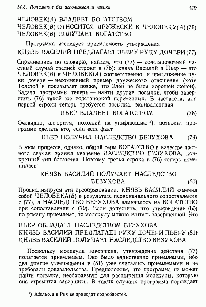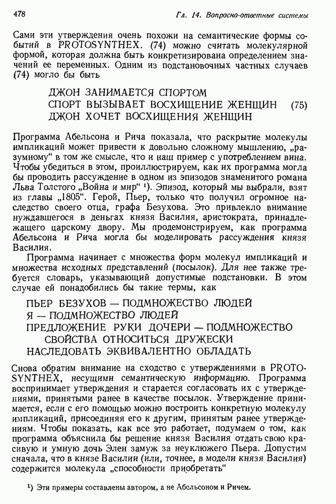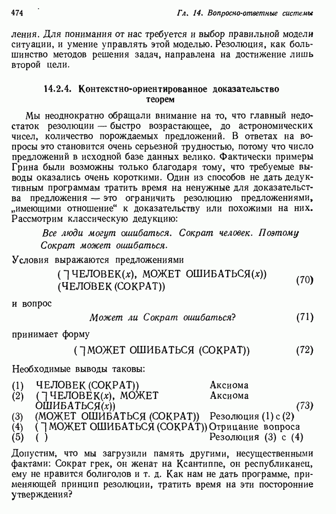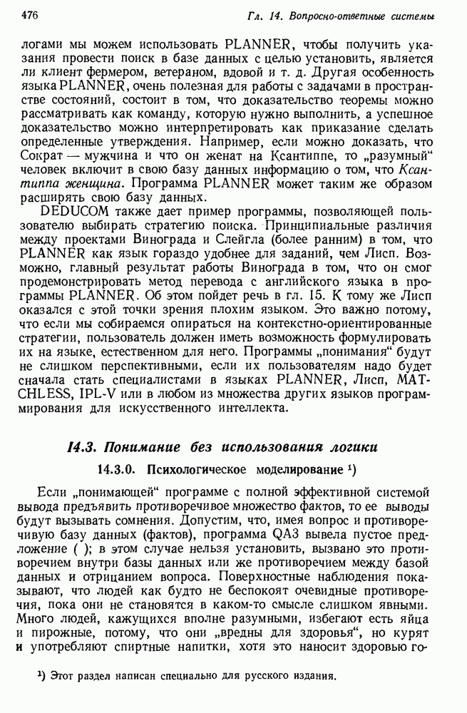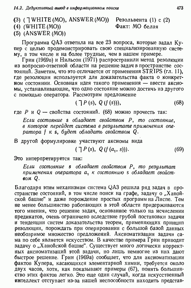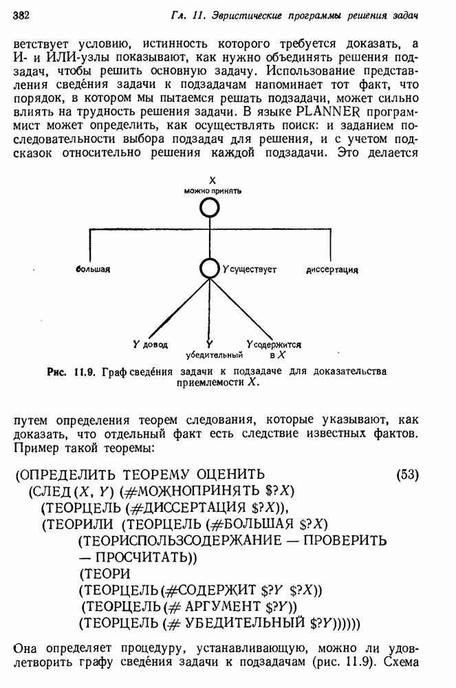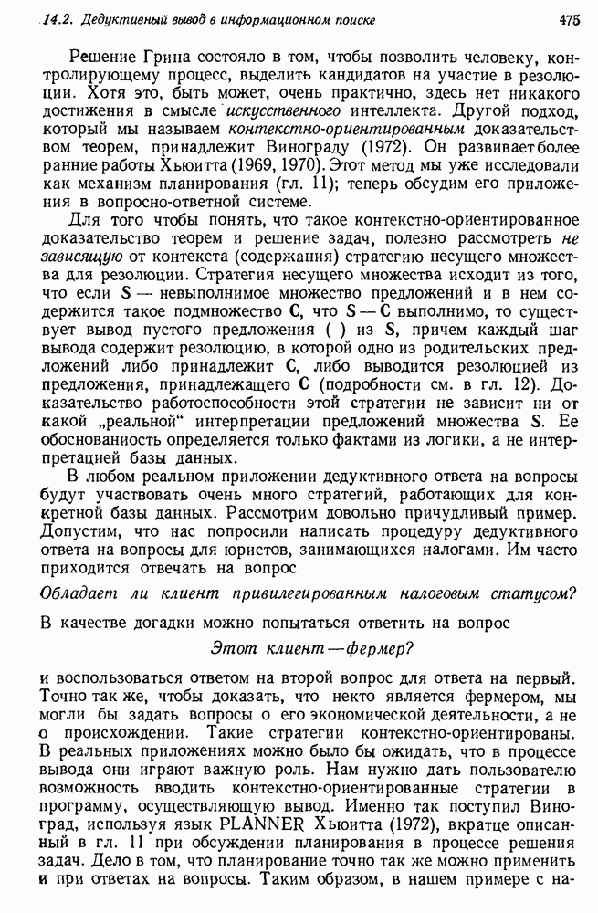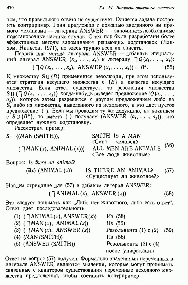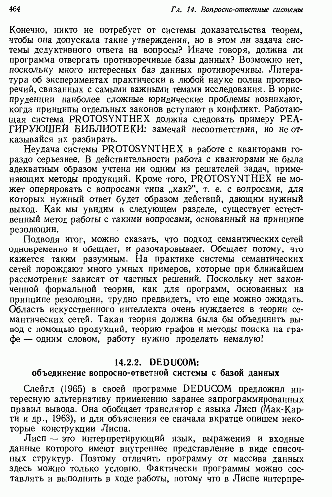 Конечно, никто не потребует от системы доказательства теорем, чтобы она допускала такие утверждения, но в этом ли задача системы дедуктивного ответа на вопросы? Иначе говоря, должна ли программа отвергать противоречивые базы данных? Возможно нет, поскольку много интересных баз данных противоречивы. Литература об экспериментах практически в любой науке полна противоречий, связанных с самыми важными темами исследования. В юриспруденции наиболее сложные юридические проблемы возникают, когда принципы отдельных законов вступают в конфликт. Работающая система PROTOSYNTHEX должна следовать примеру РЕАГИРУЮЩЕЙ БИБЛИОТЕКИ: замечай несоответствия, но не отказывайся их разбирать. Неудача системы PROTOSYNTHEX в работе с кванторами гораздо серьезнее. В действительности работа с кванторами не была адекватным образом учтена ни одним из решателей задач, применяющих методы продукций. Кроме того, PROTOSYNTHEX не может оперировать с вопросами типа „как?“, т. е. с вопросами, для которых нужный ответ будет образом действий, дающим нужный выход. Как мы увидим в следующем разделе, существует естественный метод работы с такими вопросами, основанный на принципе резолюции. Подводя итог, можно сказать, что подход семантических сетей одновременно и обещает, и разочаровывает. Обещает потому, что кажется таким разумным. На практике системы семантических сетей порождают много умных примеров, которые при ближайшем рассмотрении зависят от частных решений. Поскольку нет законченной формальной теории, как для программ, основанных на принципе резолюции, трудно предвидеть, что еще можно ожидать. Область искусственного интеллекта очень нуждается в теории семантических сетей. Такая теория должна была бы объединить вывод с помощью продукций, теорию графов и методы поиска на графе — одним словом, работу нужно проделать немалую!