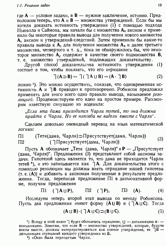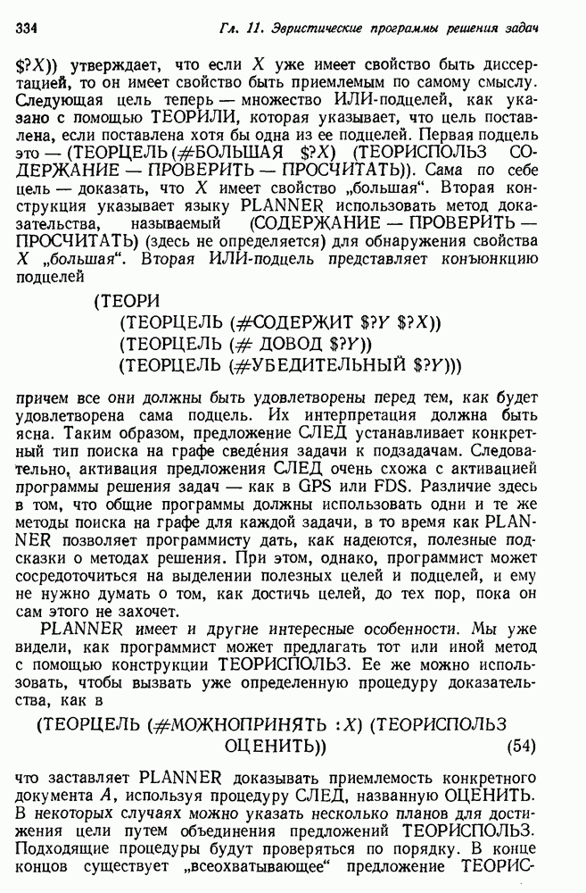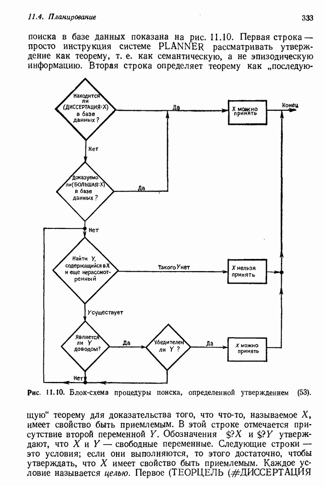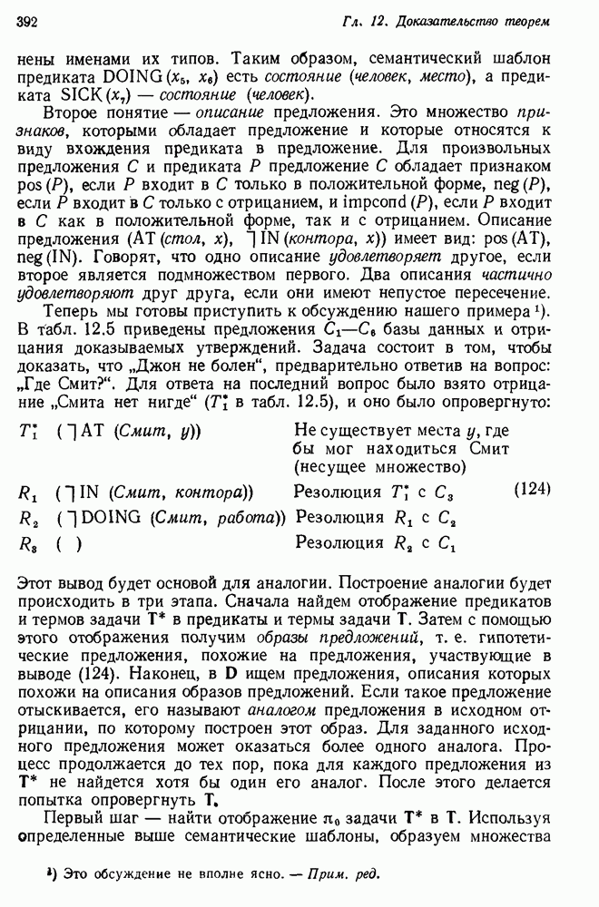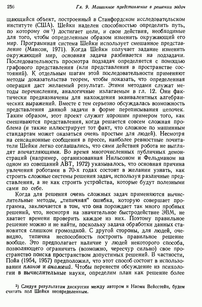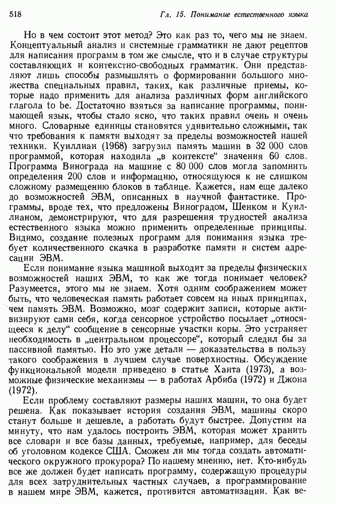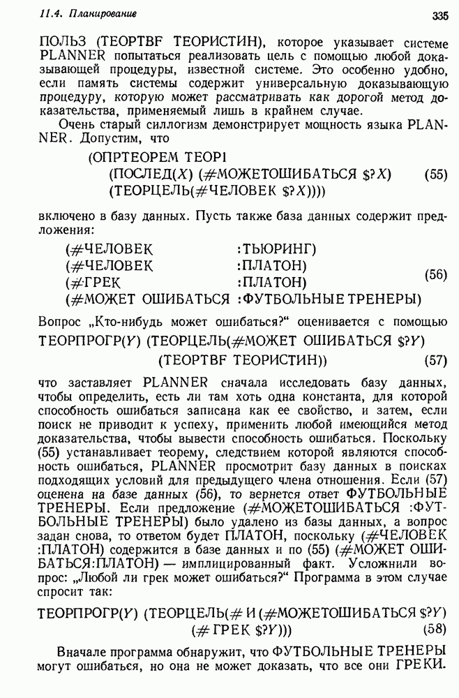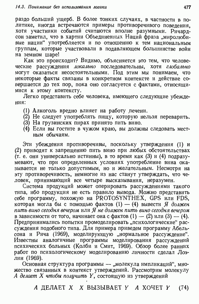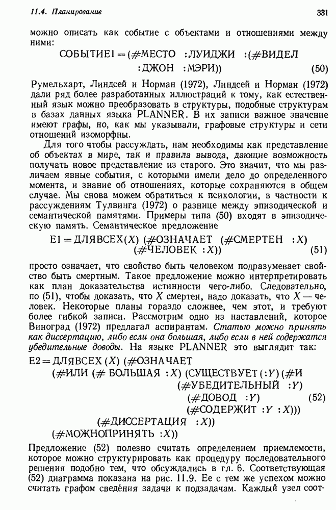 Конечно, никто не потребует от системы доказательства теорем, чтобы она допускала такие утверждения, но в этом ли задача системы дедуктивного ответа на вопросы? Иначе говоря, должна ли программа отвергать противоречивые базы данных? Возможно нет, поскольку много интересных баз данных противоречивы. Литература об экспериментах практически в любой науке полна противоречий, связанных с самыми важными темами исследования. В юриспруденции наиболее сложные юридические проблемы возникают, когда принципы отдельных законов вступают в конфликт. Работающая система PROTOSYNTHEX должна следовать примеру РЕАГИРУЮЩЕЙ БИБЛИОТЕКИ: замечай несоответствия, но не отказывайся их разбирать. Неудача системы PROTOSYNTHEX в работе с кванторами гораздо серьезнее. В действительности работа с кванторами не была адекватным образом учтена ни одним из решателей задач, применяющих методы продукций. Кроме того, PROTOSYNTHEX не может оперировать с вопросами типа „как?“, т. е. с вопросами, для которых нужный ответ будет образом действий, дающим нужный выход. Как мы увидим в следующем разделе, существует естественный метод работы с такими вопросами, основанный на принципе резолюции. Подводя итог, можно сказать, что подход семантических сетей одновременно и обещает, и разочаровывает. Обещает потому, что кажется таким разумным. На практике системы семантических сетей порождают много умных примеров, которые при ближайшем рассмотрении зависят от частных решений. Поскольку нет законченной формальной теории, как для программ, основанных на принципе резолюции, трудно предвидеть, что еще можно ожидать. Область искусственного интеллекта очень нуждается в теории семантических сетей. Такая теория должна была бы объединить вывод с помощью продукций, теорию графов и методы поиска на графе — одним словом, работу нужно проделать немалую!
