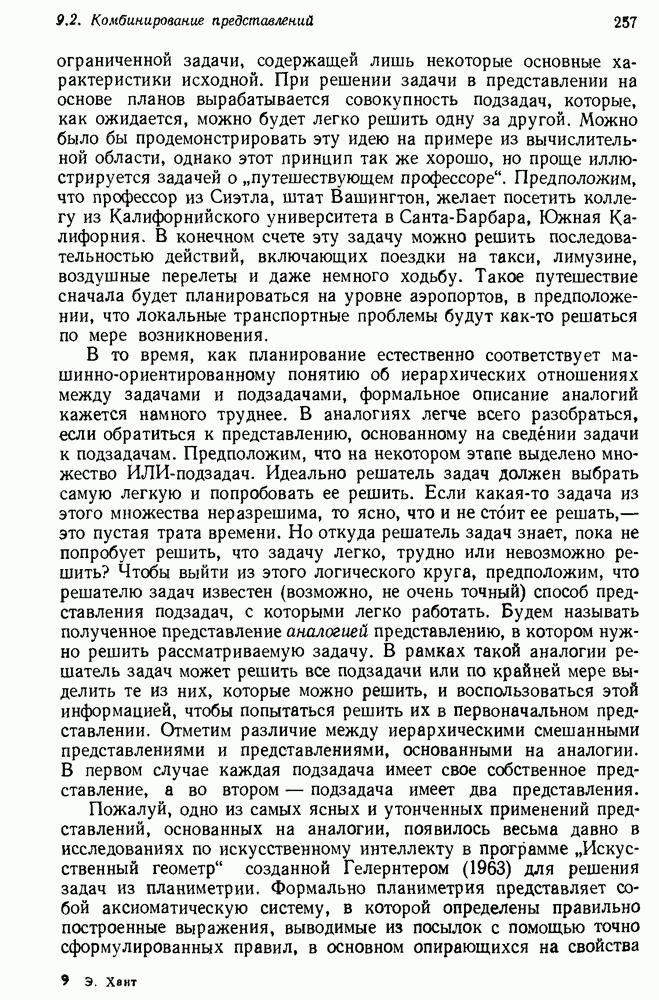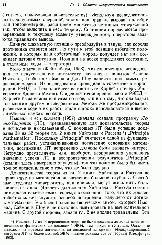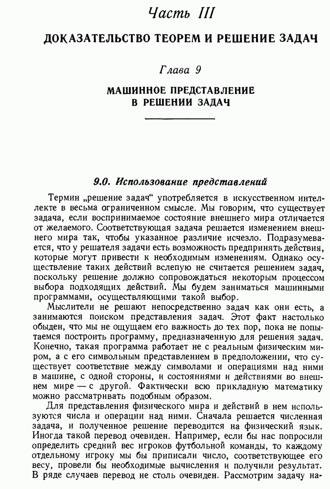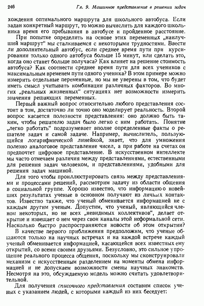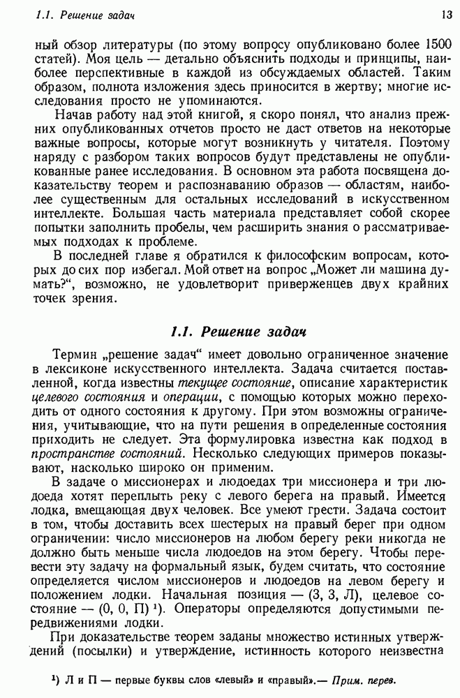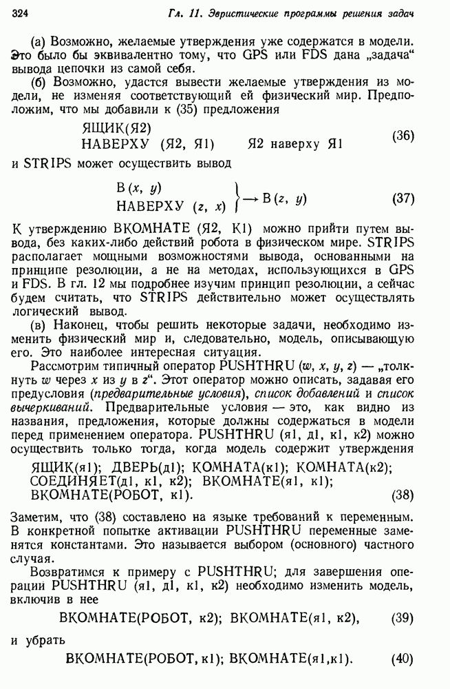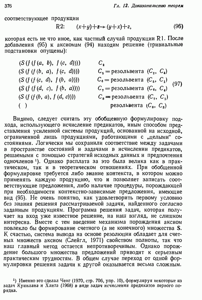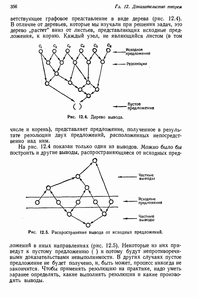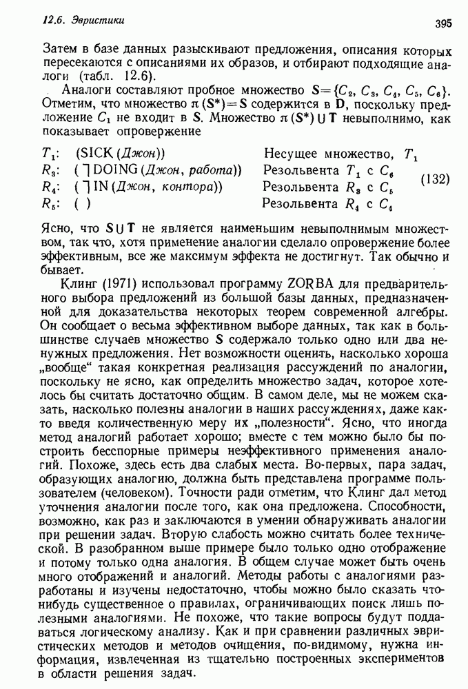 Конечно, никто не потребует от системы доказательства теорем, чтобы она допускала такие утверждения, но в этом ли задача системы дедуктивного ответа на вопросы? Иначе говоря, должна ли программа отвергать противоречивые базы данных? Возможно нет, поскольку много интересных баз данных противоречивы. Литература об экспериментах практически в любой науке полна противоречий, связанных с самыми важными темами исследования. В юриспруденции наиболее сложные юридические проблемы возникают, когда принципы отдельных законов вступают в конфликт. Работающая система PROTOSYNTHEX должна следовать примеру РЕАГИРУЮЩЕЙ БИБЛИОТЕКИ: замечай несоответствия, но не отказывайся их разбирать. Неудача системы PROTOSYNTHEX в работе с кванторами гораздо серьезнее. В действительности работа с кванторами не была адекватным образом учтена ни одним из решателей задач, применяющих методы продукций. Кроме того, PROTOSYNTHEX не может оперировать с вопросами типа „как?“, т. е. с вопросами, для которых нужный ответ будет образом действий, дающим нужный выход. Как мы увидим в следующем разделе, существует естественный метод работы с такими вопросами, основанный на принципе резолюции. Подводя итог, можно сказать, что подход семантических сетей одновременно и обещает, и разочаровывает. Обещает потому, что кажется таким разумным. На практике системы семантических сетей порождают много умных примеров, которые при ближайшем рассмотрении зависят от частных решений. Поскольку нет законченной формальной теории, как для программ, основанных на принципе резолюции, трудно предвидеть, что еще можно ожидать. Область искусственного интеллекта очень нуждается в теории семантических сетей. Такая теория должна была бы объединить вывод с помощью продукций, теорию графов и методы поиска на графе — одним словом, работу нужно проделать немалую!