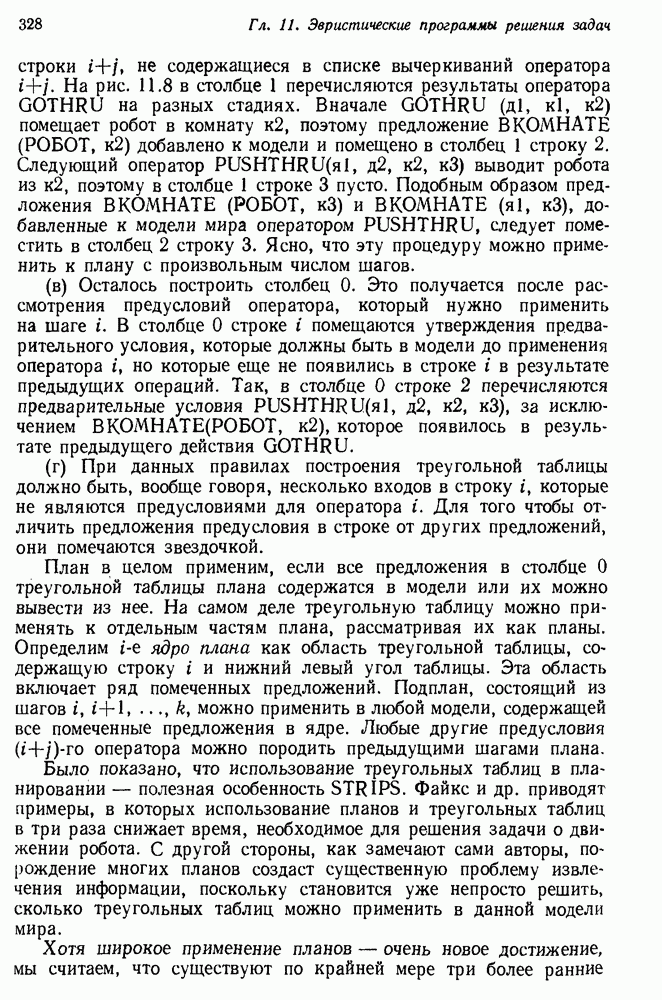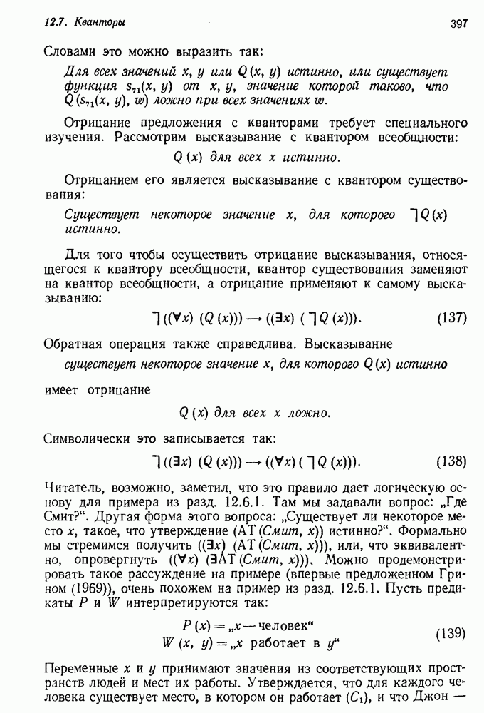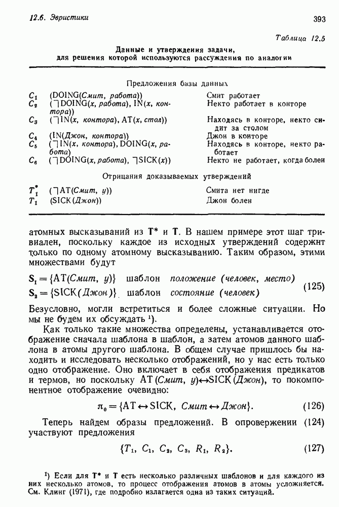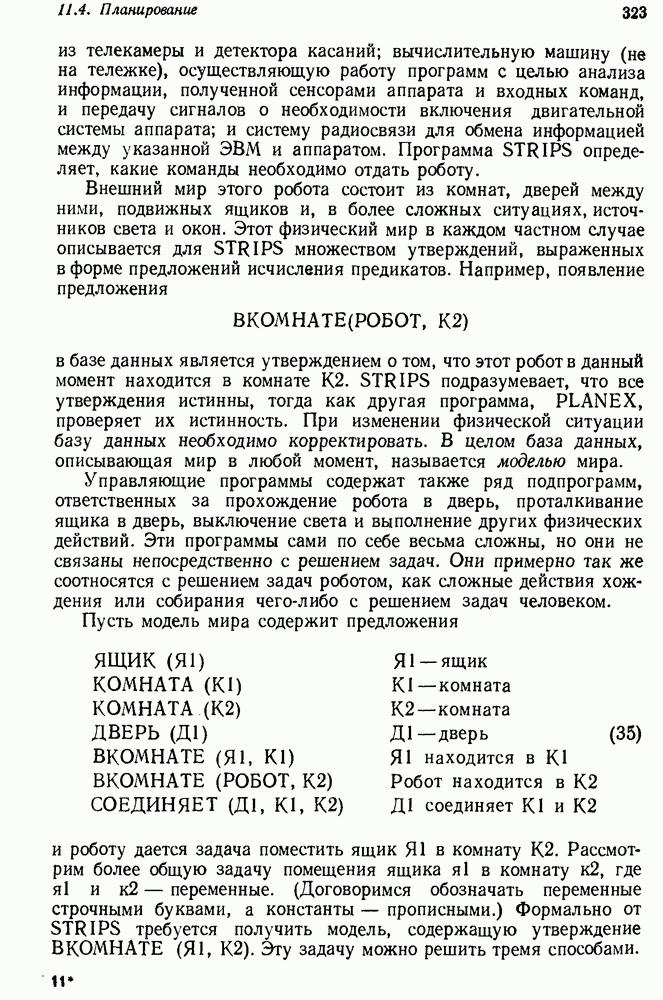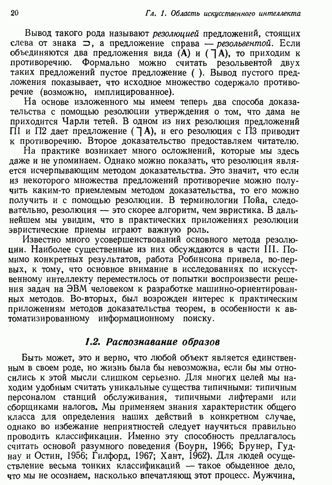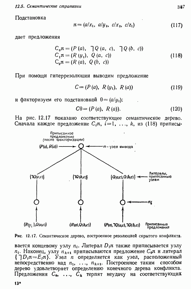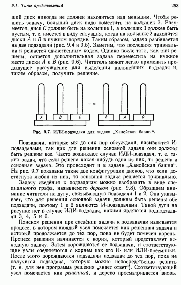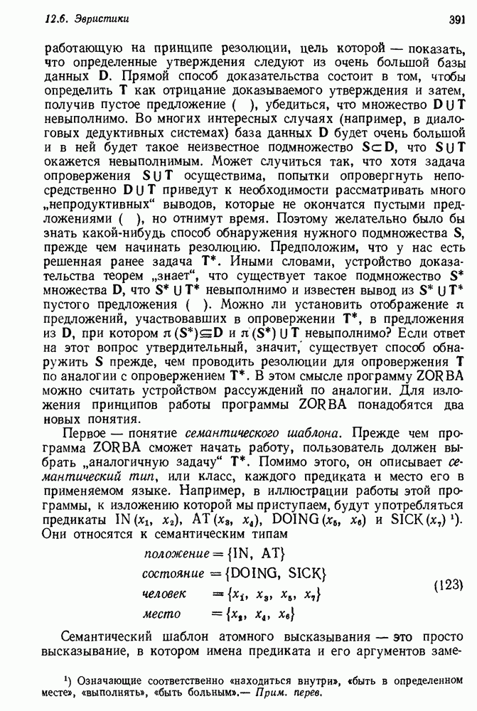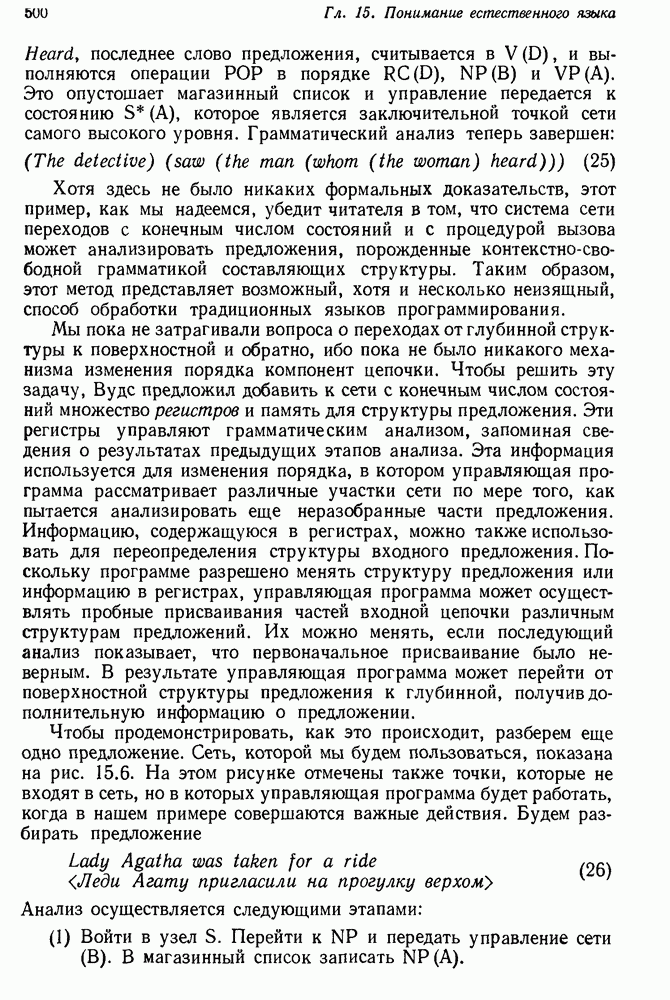 Конечно, никто не потребует от системы доказательства теорем, чтобы она допускала такие утверждения, но в этом ли задача системы дедуктивного ответа на вопросы? Иначе говоря, должна ли программа отвергать противоречивые базы данных? Возможно нет, поскольку много интересных баз данных противоречивы. Литература об экспериментах практически в любой науке полна противоречий, связанных с самыми важными темами исследования. В юриспруденции наиболее сложные юридические проблемы возникают, когда принципы отдельных законов вступают в конфликт. Работающая система PROTOSYNTHEX должна следовать примеру РЕАГИРУЮЩЕЙ БИБЛИОТЕКИ: замечай несоответствия, но не отказывайся их разбирать. Неудача системы PROTOSYNTHEX в работе с кванторами гораздо серьезнее. В действительности работа с кванторами не была адекватным образом учтена ни одним из решателей задач, применяющих методы продукций. Кроме того, PROTOSYNTHEX не может оперировать с вопросами типа „как?“, т. е. с вопросами, для которых нужный ответ будет образом действий, дающим нужный выход. Как мы увидим в следующем разделе, существует естественный метод работы с такими вопросами, основанный на принципе резолюции. Подводя итог, можно сказать, что подход семантических сетей одновременно и обещает, и разочаровывает. Обещает потому, что кажется таким разумным. На практике системы семантических сетей порождают много умных примеров, которые при ближайшем рассмотрении зависят от частных решений. Поскольку нет законченной формальной теории, как для программ, основанных на принципе резолюции, трудно предвидеть, что еще можно ожидать. Область искусственного интеллекта очень нуждается в теории семантических сетей. Такая теория должна была бы объединить вывод с помощью продукций, теорию графов и методы поиска на графе — одним словом, работу нужно проделать немалую!
