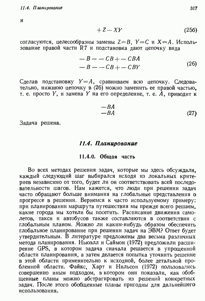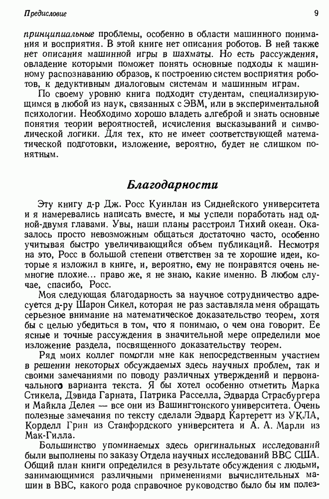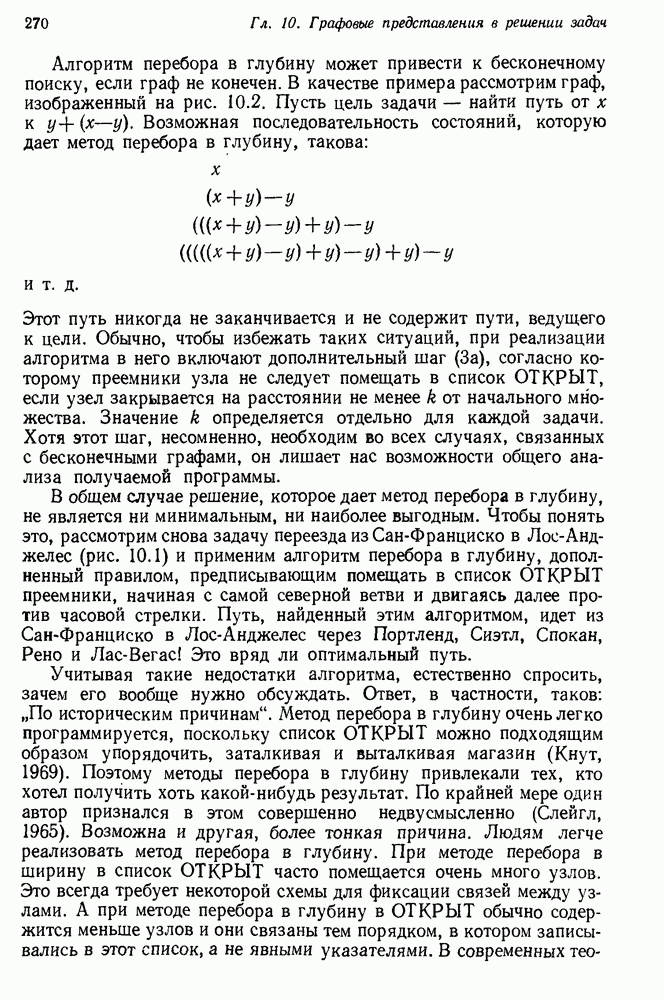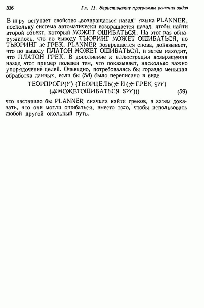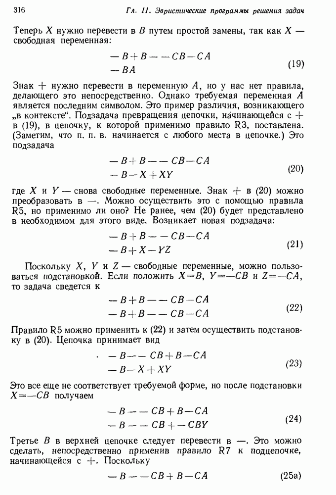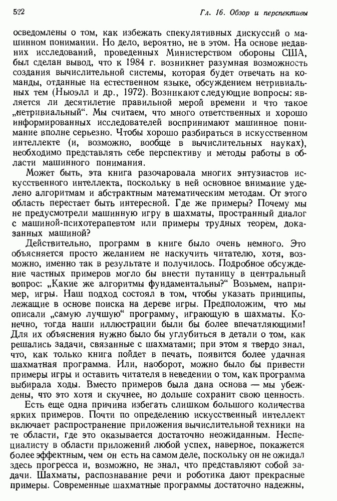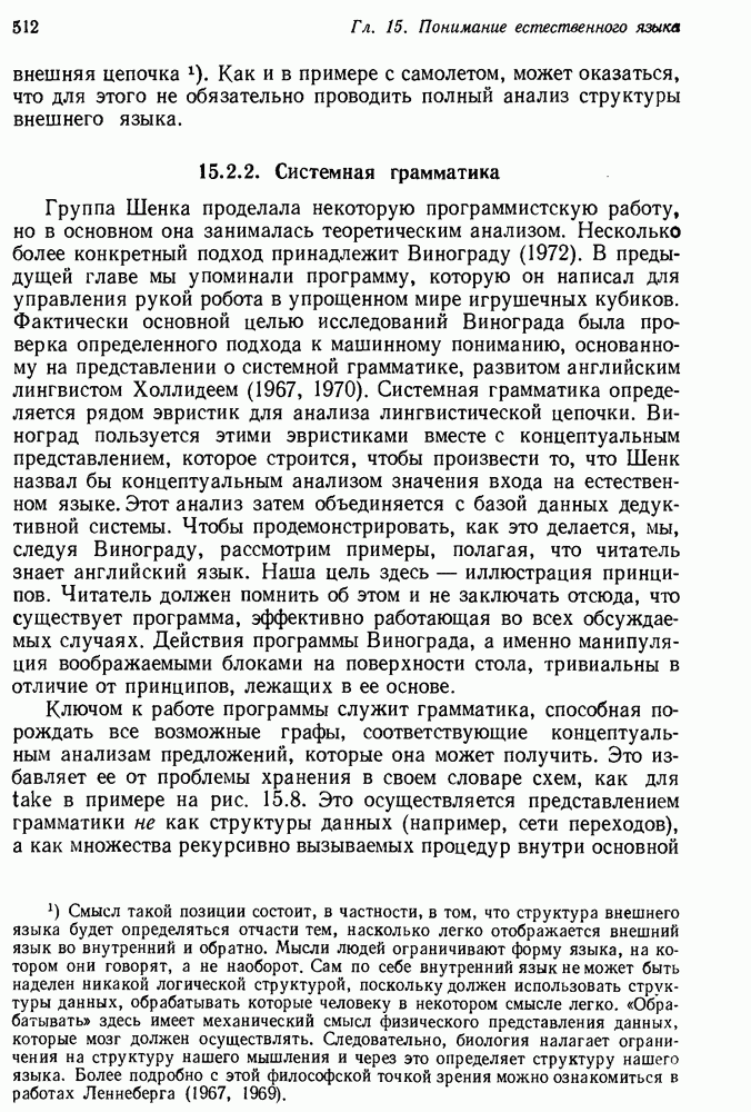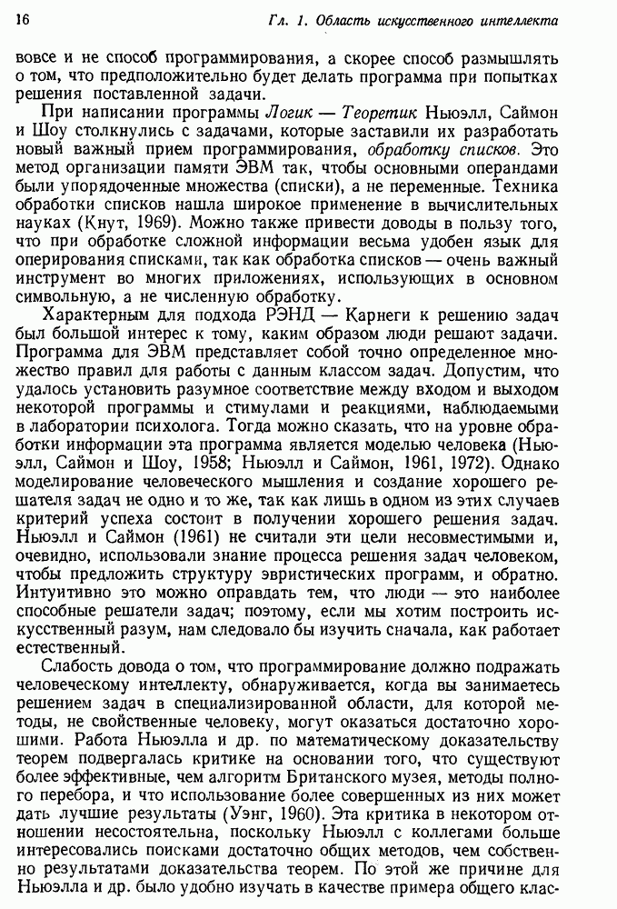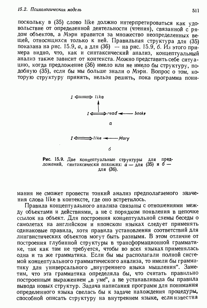 Конечно, никто не потребует от системы доказательства теорем, чтобы она допускала такие утверждения, но в этом ли задача системы дедуктивного ответа на вопросы? Иначе говоря, должна ли программа отвергать противоречивые базы данных? Возможно нет, поскольку много интересных баз данных противоречивы. Литература об экспериментах практически в любой науке полна противоречий, связанных с самыми важными темами исследования. В юриспруденции наиболее сложные юридические проблемы возникают, когда принципы отдельных законов вступают в конфликт. Работающая система PROTOSYNTHEX должна следовать примеру РЕАГИРУЮЩЕЙ БИБЛИОТЕКИ: замечай несоответствия, но не отказывайся их разбирать. Неудача системы PROTOSYNTHEX в работе с кванторами гораздо серьезнее. В действительности работа с кванторами не была адекватным образом учтена ни одним из решателей задач, применяющих методы продукций. Кроме того, PROTOSYNTHEX не может оперировать с вопросами типа „как?“, т. е. с вопросами, для которых нужный ответ будет образом действий, дающим нужный выход. Как мы увидим в следующем разделе, существует естественный метод работы с такими вопросами, основанный на принципе резолюции. Подводя итог, можно сказать, что подход семантических сетей одновременно и обещает, и разочаровывает. Обещает потому, что кажется таким разумным. На практике системы семантических сетей порождают много умных примеров, которые при ближайшем рассмотрении зависят от частных решений. Поскольку нет законченной формальной теории, как для программ, основанных на принципе резолюции, трудно предвидеть, что еще можно ожидать. Область искусственного интеллекта очень нуждается в теории семантических сетей. Такая теория должна была бы объединить вывод с помощью продукций, теорию графов и методы поиска на графе — одним словом, работу нужно проделать немалую!