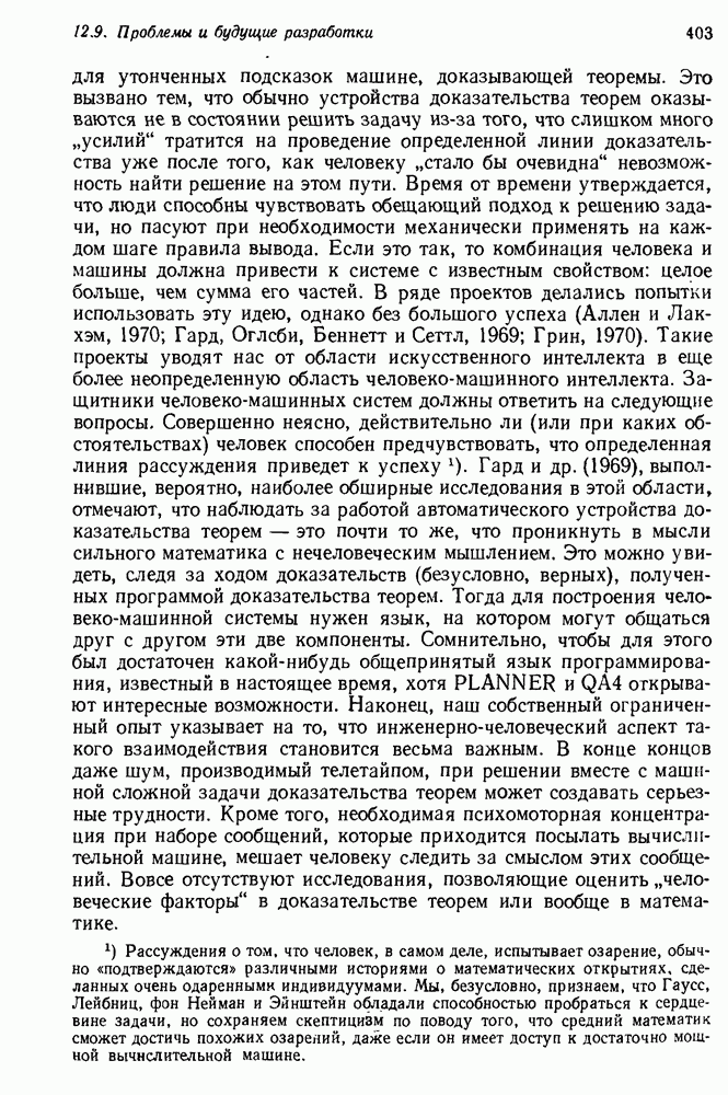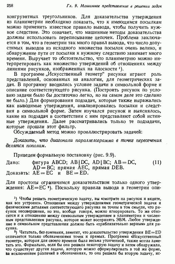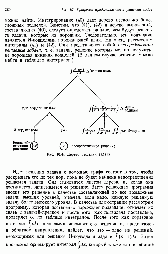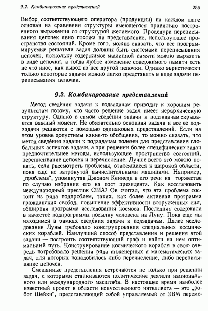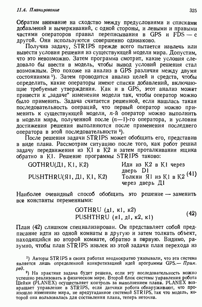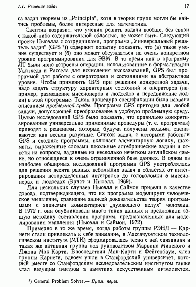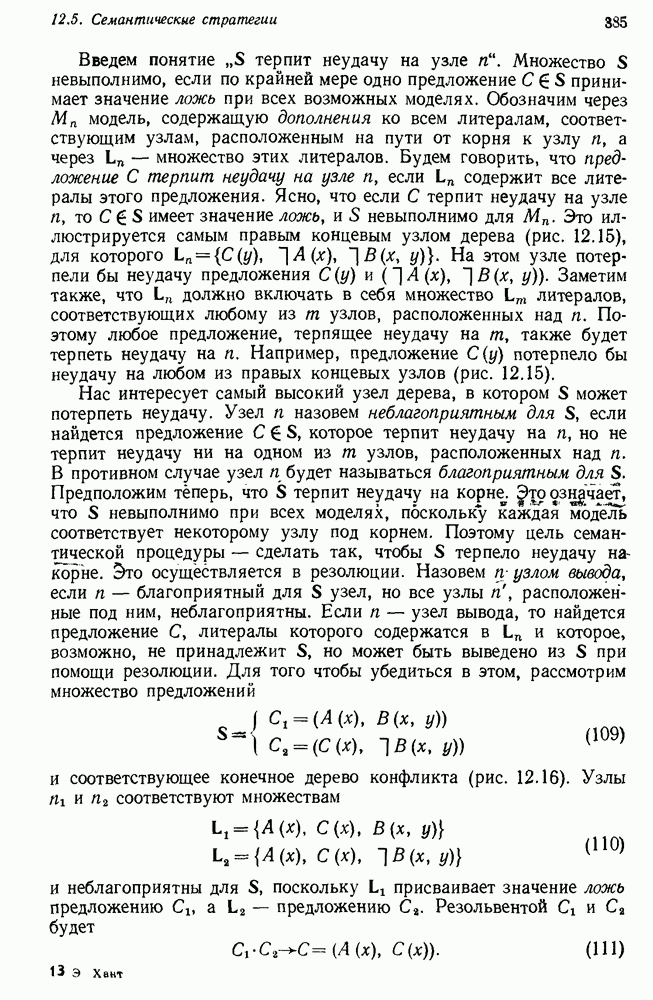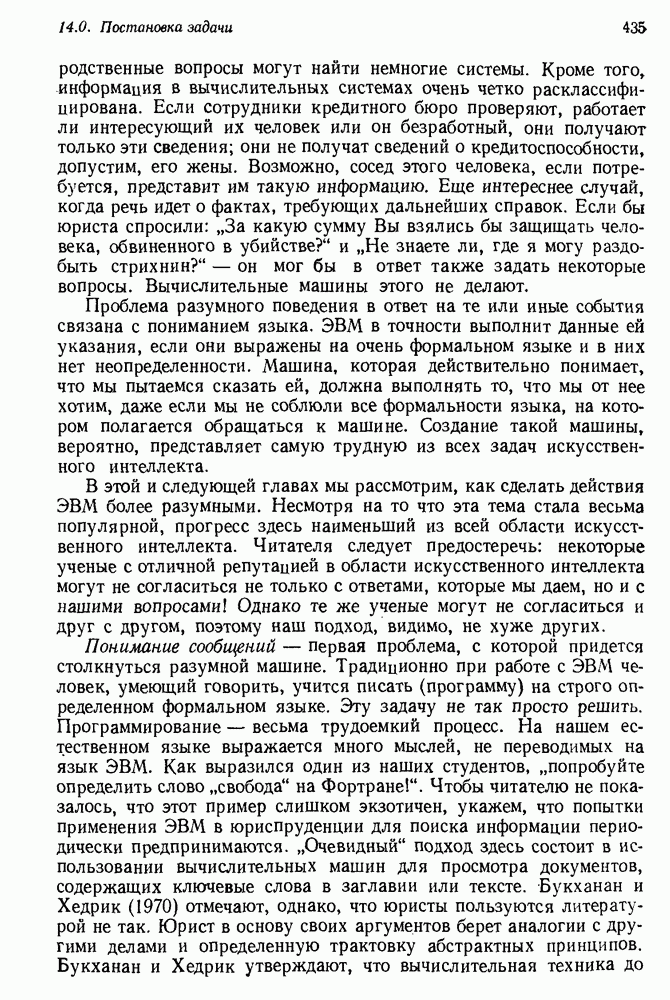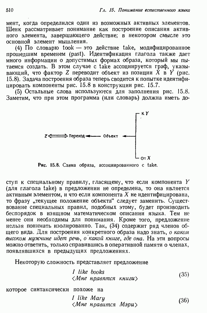 Конечно, никто не потребует от системы доказательства теорем, чтобы она допускала такие утверждения, но в этом ли задача системы дедуктивного ответа на вопросы? Иначе говоря, должна ли программа отвергать противоречивые базы данных? Возможно нет, поскольку много интересных баз данных противоречивы. Литература об экспериментах практически в любой науке полна противоречий, связанных с самыми важными темами исследования. В юриспруденции наиболее сложные юридические проблемы возникают, когда принципы отдельных законов вступают в конфликт. Работающая система PROTOSYNTHEX должна следовать примеру РЕАГИРУЮЩЕЙ БИБЛИОТЕКИ: замечай несоответствия, но не отказывайся их разбирать. Неудача системы PROTOSYNTHEX в работе с кванторами гораздо серьезнее. В действительности работа с кванторами не была адекватным образом учтена ни одним из решателей задач, применяющих методы продукций. Кроме того, PROTOSYNTHEX не может оперировать с вопросами типа „как?“, т. е. с вопросами, для которых нужный ответ будет образом действий, дающим нужный выход. Как мы увидим в следующем разделе, существует естественный метод работы с такими вопросами, основанный на принципе резолюции. Подводя итог, можно сказать, что подход семантических сетей одновременно и обещает, и разочаровывает. Обещает потому, что кажется таким разумным. На практике системы семантических сетей порождают много умных примеров, которые при ближайшем рассмотрении зависят от частных решений. Поскольку нет законченной формальной теории, как для программ, основанных на принципе резолюции, трудно предвидеть, что еще можно ожидать. Область искусственного интеллекта очень нуждается в теории семантических сетей. Такая теория должна была бы объединить вывод с помощью продукций, теорию графов и методы поиска на графе — одним словом, работу нужно проделать немалую!