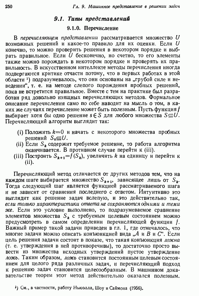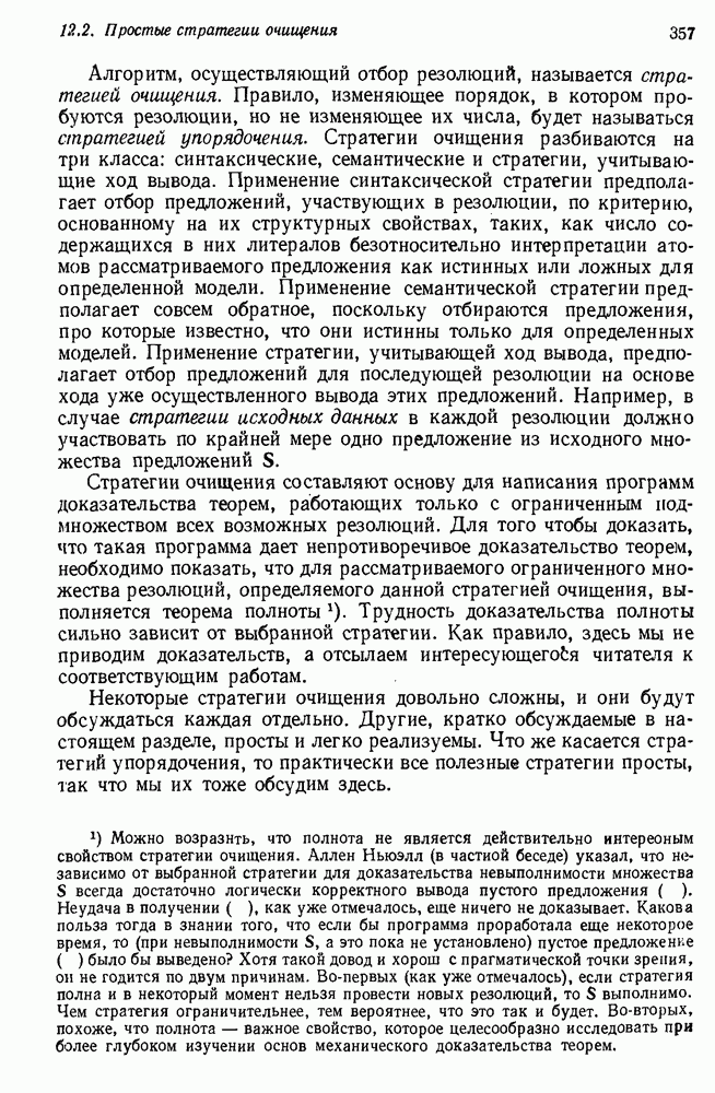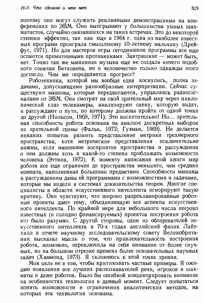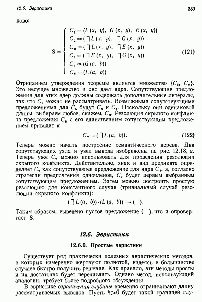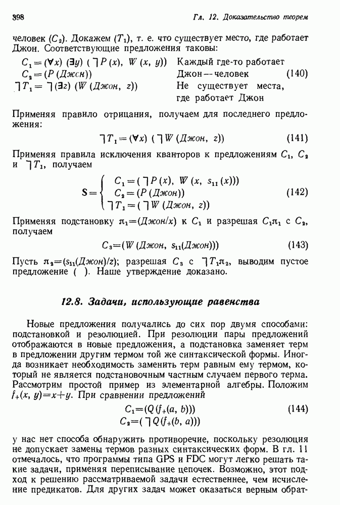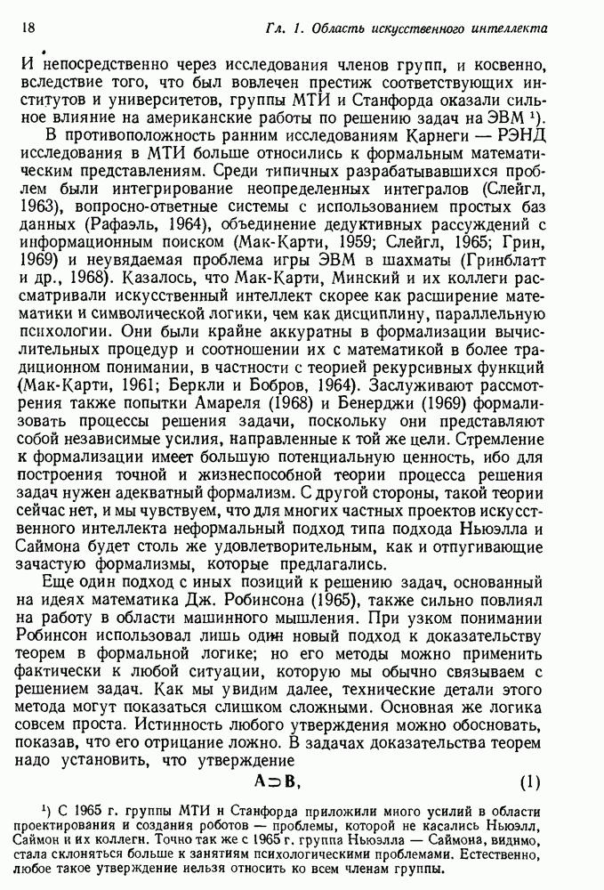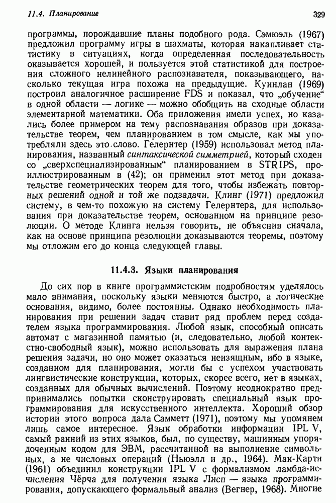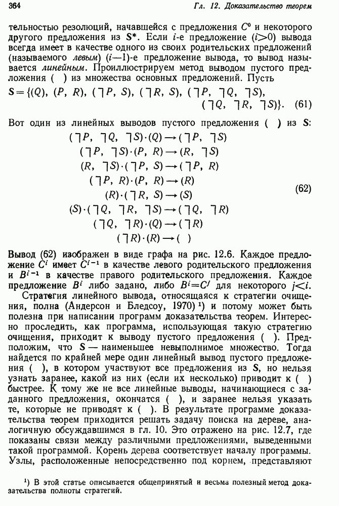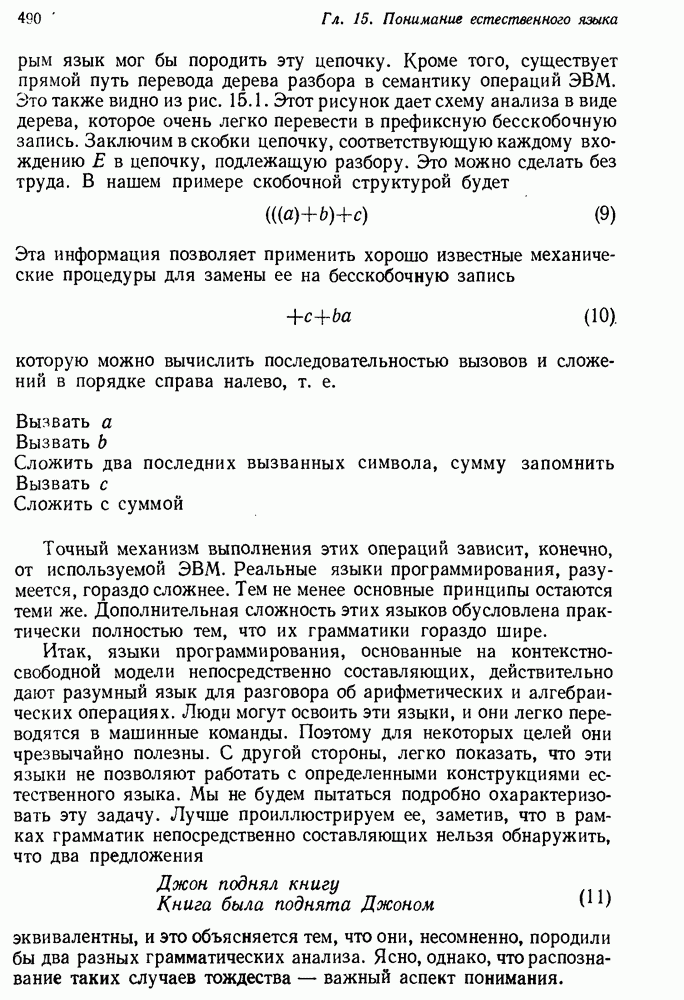 Конечно, никто не потребует от системы доказательства теорем, чтобы она допускала такие утверждения, но в этом ли задача системы дедуктивного ответа на вопросы? Иначе говоря, должна ли программа отвергать противоречивые базы данных? Возможно нет, поскольку много интересных баз данных противоречивы. Литература об экспериментах практически в любой науке полна противоречий, связанных с самыми важными темами исследования. В юриспруденции наиболее сложные юридические проблемы возникают, когда принципы отдельных законов вступают в конфликт. Работающая система PROTOSYNTHEX должна следовать примеру РЕАГИРУЮЩЕЙ БИБЛИОТЕКИ: замечай несоответствия, но не отказывайся их разбирать. Неудача системы PROTOSYNTHEX в работе с кванторами гораздо серьезнее. В действительности работа с кванторами не была адекватным образом учтена ни одним из решателей задач, применяющих методы продукций. Кроме того, PROTOSYNTHEX не может оперировать с вопросами типа „как?“, т. е. с вопросами, для которых нужный ответ будет образом действий, дающим нужный выход. Как мы увидим в следующем разделе, существует естественный метод работы с такими вопросами, основанный на принципе резолюции. Подводя итог, можно сказать, что подход семантических сетей одновременно и обещает, и разочаровывает. Обещает потому, что кажется таким разумным. На практике системы семантических сетей порождают много умных примеров, которые при ближайшем рассмотрении зависят от частных решений. Поскольку нет законченной формальной теории, как для программ, основанных на принципе резолюции, трудно предвидеть, что еще можно ожидать. Область искусственного интеллекта очень нуждается в теории семантических сетей. Такая теория должна была бы объединить вывод с помощью продукций, теорию графов и методы поиска на графе — одним словом, работу нужно проделать немалую!