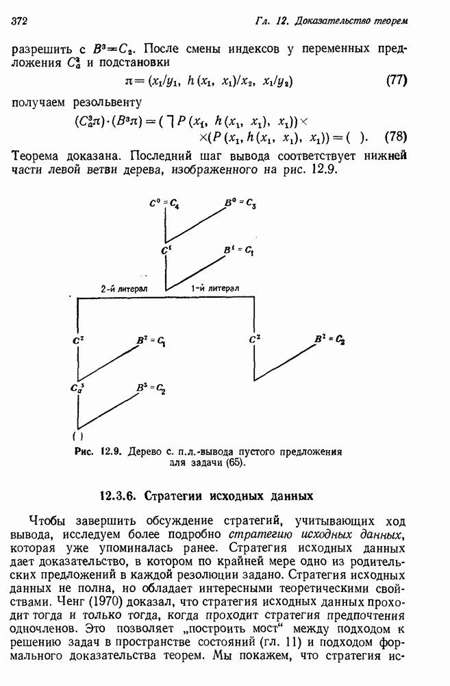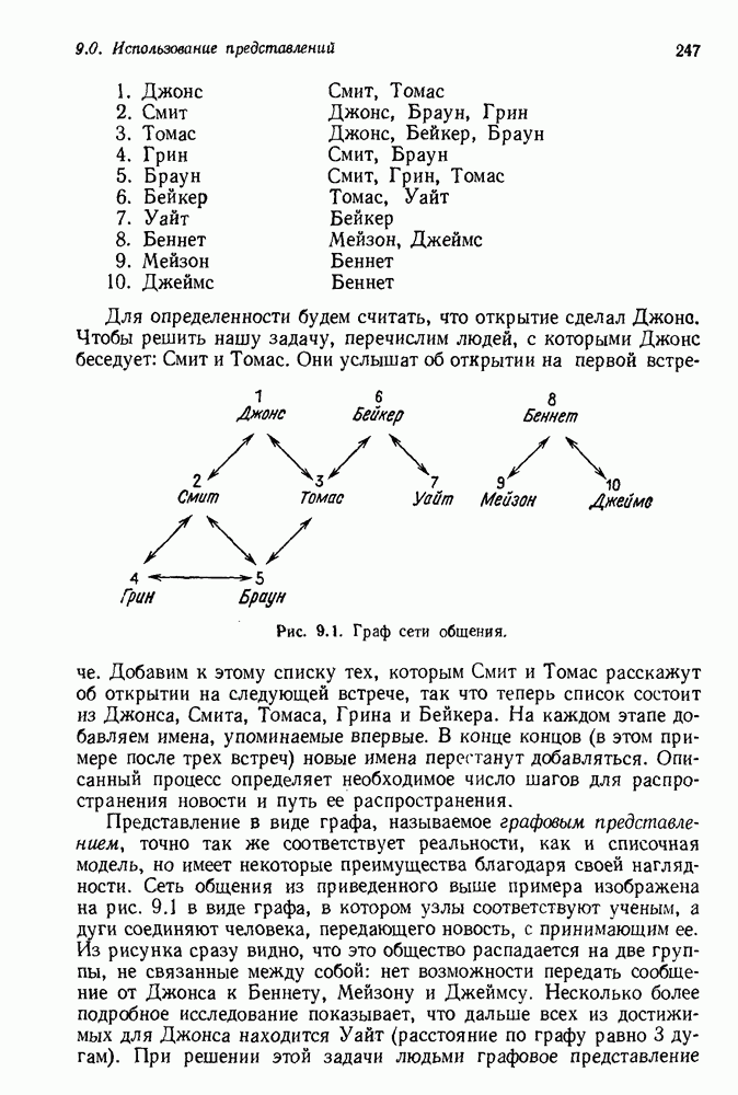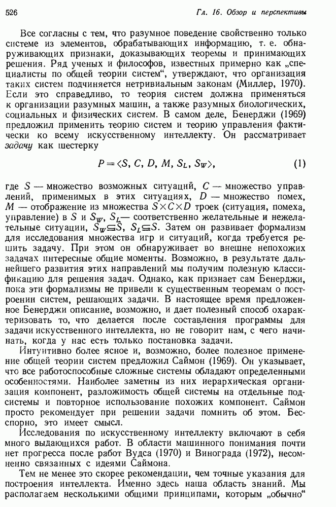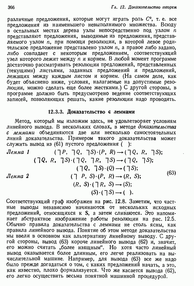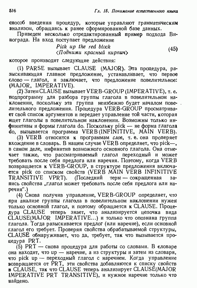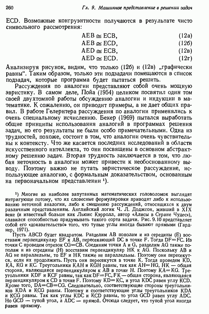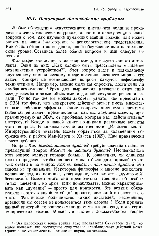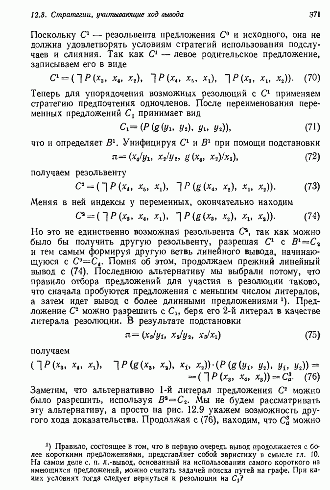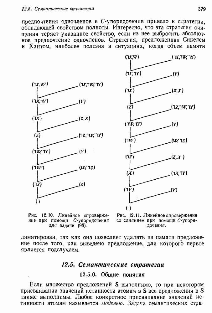 Конечно, никто не потребует от системы доказательства теорем, чтобы она допускала такие утверждения, но в этом ли задача системы дедуктивного ответа на вопросы? Иначе говоря, должна ли программа отвергать противоречивые базы данных? Возможно нет, поскольку много интересных баз данных противоречивы. Литература об экспериментах практически в любой науке полна противоречий, связанных с самыми важными темами исследования. В юриспруденции наиболее сложные юридические проблемы возникают, когда принципы отдельных законов вступают в конфликт. Работающая система PROTOSYNTHEX должна следовать примеру РЕАГИРУЮЩЕЙ БИБЛИОТЕКИ: замечай несоответствия, но не отказывайся их разбирать. Неудача системы PROTOSYNTHEX в работе с кванторами гораздо серьезнее. В действительности работа с кванторами не была адекватным образом учтена ни одним из решателей задач, применяющих методы продукций. Кроме того, PROTOSYNTHEX не может оперировать с вопросами типа „как?“, т. е. с вопросами, для которых нужный ответ будет образом действий, дающим нужный выход. Как мы увидим в следующем разделе, существует естественный метод работы с такими вопросами, основанный на принципе резолюции. Подводя итог, можно сказать, что подход семантических сетей одновременно и обещает, и разочаровывает. Обещает потому, что кажется таким разумным. На практике системы семантических сетей порождают много умных примеров, которые при ближайшем рассмотрении зависят от частных решений. Поскольку нет законченной формальной теории, как для программ, основанных на принципе резолюции, трудно предвидеть, что еще можно ожидать. Область искусственного интеллекта очень нуждается в теории семантических сетей. Такая теория должна была бы объединить вывод с помощью продукций, теорию графов и методы поиска на графе — одним словом, работу нужно проделать немалую!