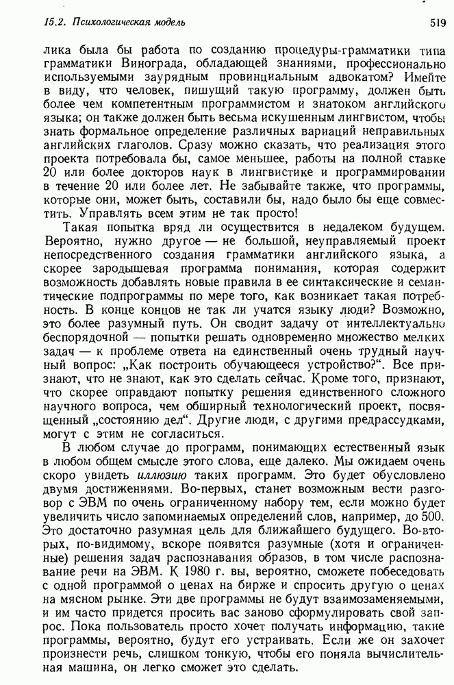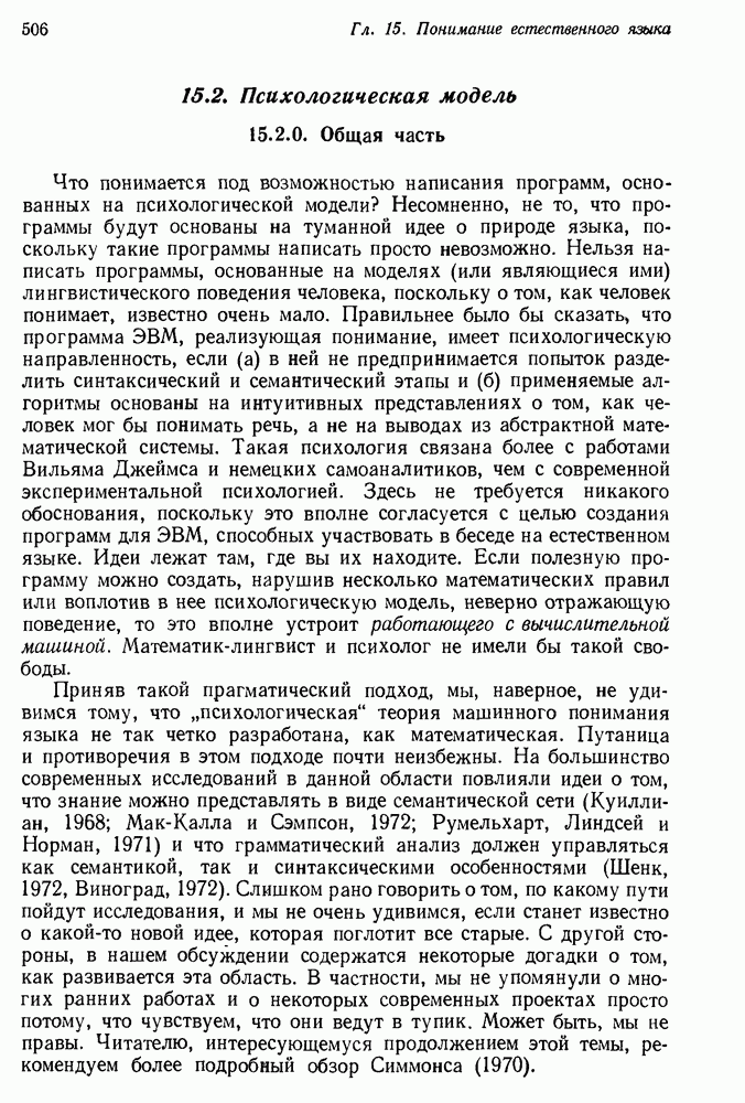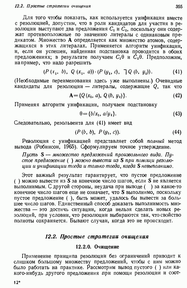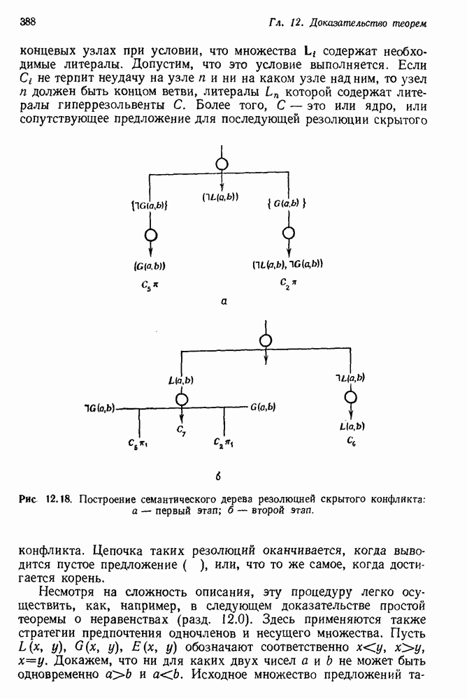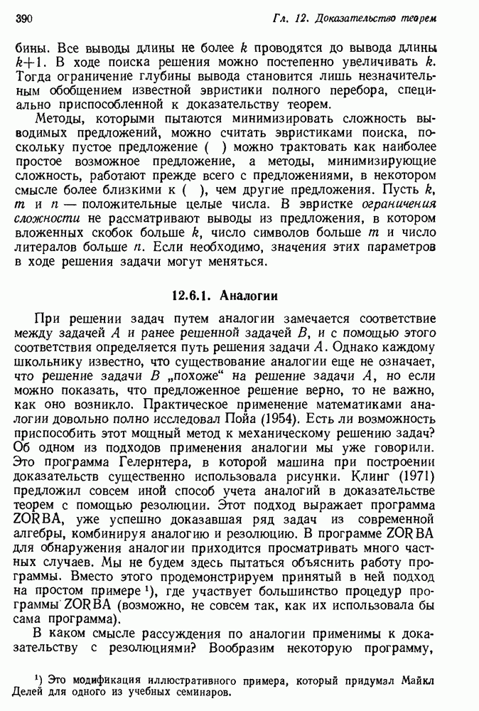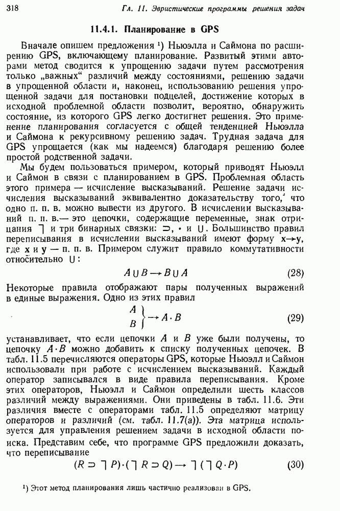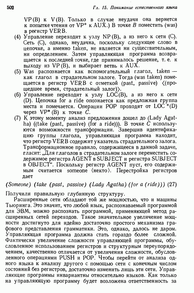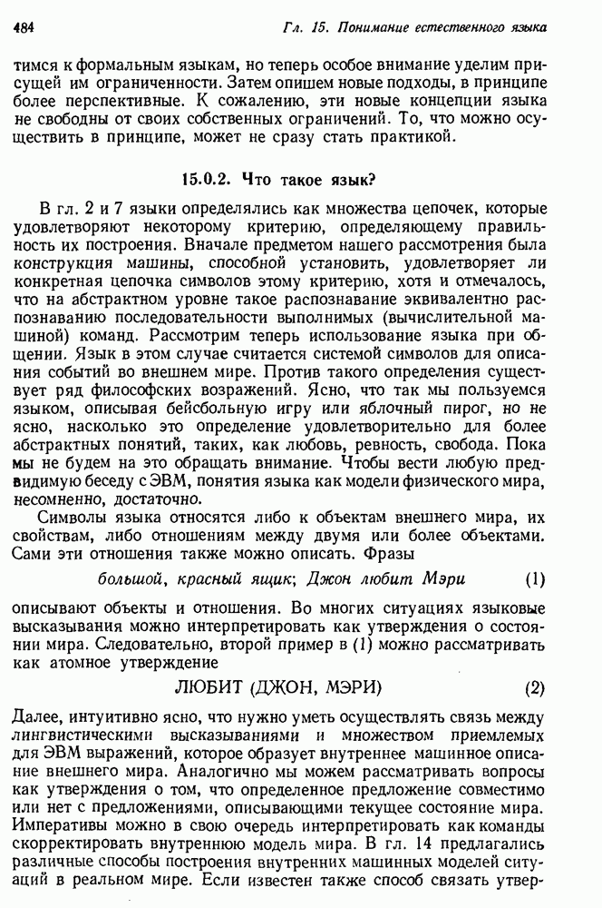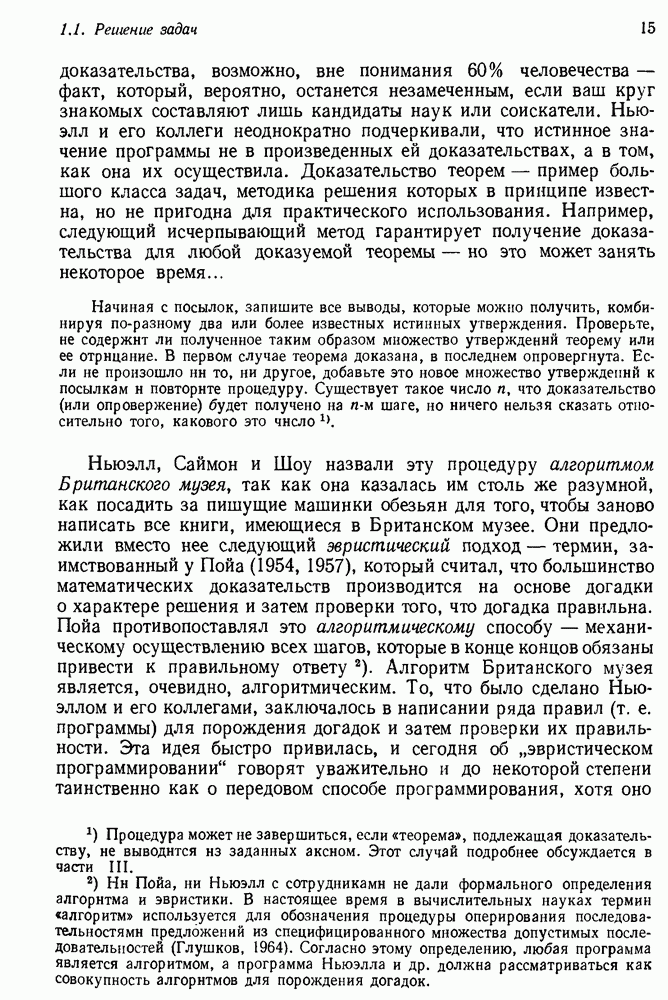 Конечно, никто не потребует от системы доказательства теорем, чтобы она допускала такие утверждения, но в этом ли задача системы дедуктивного ответа на вопросы? Иначе говоря, должна ли программа отвергать противоречивые базы данных? Возможно нет, поскольку много интересных баз данных противоречивы. Литература об экспериментах практически в любой науке полна противоречий, связанных с самыми важными темами исследования. В юриспруденции наиболее сложные юридические проблемы возникают, когда принципы отдельных законов вступают в конфликт. Работающая система PROTOSYNTHEX должна следовать примеру РЕАГИРУЮЩЕЙ БИБЛИОТЕКИ: замечай несоответствия, но не отказывайся их разбирать. Неудача системы PROTOSYNTHEX в работе с кванторами гораздо серьезнее. В действительности работа с кванторами не была адекватным образом учтена ни одним из решателей задач, применяющих методы продукций. Кроме того, PROTOSYNTHEX не может оперировать с вопросами типа „как?“, т. е. с вопросами, для которых нужный ответ будет образом действий, дающим нужный выход. Как мы увидим в следующем разделе, существует естественный метод работы с такими вопросами, основанный на принципе резолюции. Подводя итог, можно сказать, что подход семантических сетей одновременно и обещает, и разочаровывает. Обещает потому, что кажется таким разумным. На практике системы семантических сетей порождают много умных примеров, которые при ближайшем рассмотрении зависят от частных решений. Поскольку нет законченной формальной теории, как для программ, основанных на принципе резолюции, трудно предвидеть, что еще можно ожидать. Область искусственного интеллекта очень нуждается в теории семантических сетей. Такая теория должна была бы объединить вывод с помощью продукций, теорию графов и методы поиска на графе — одним словом, работу нужно проделать немалую!