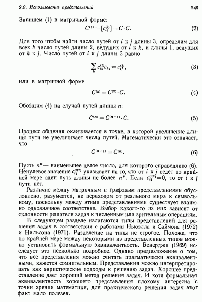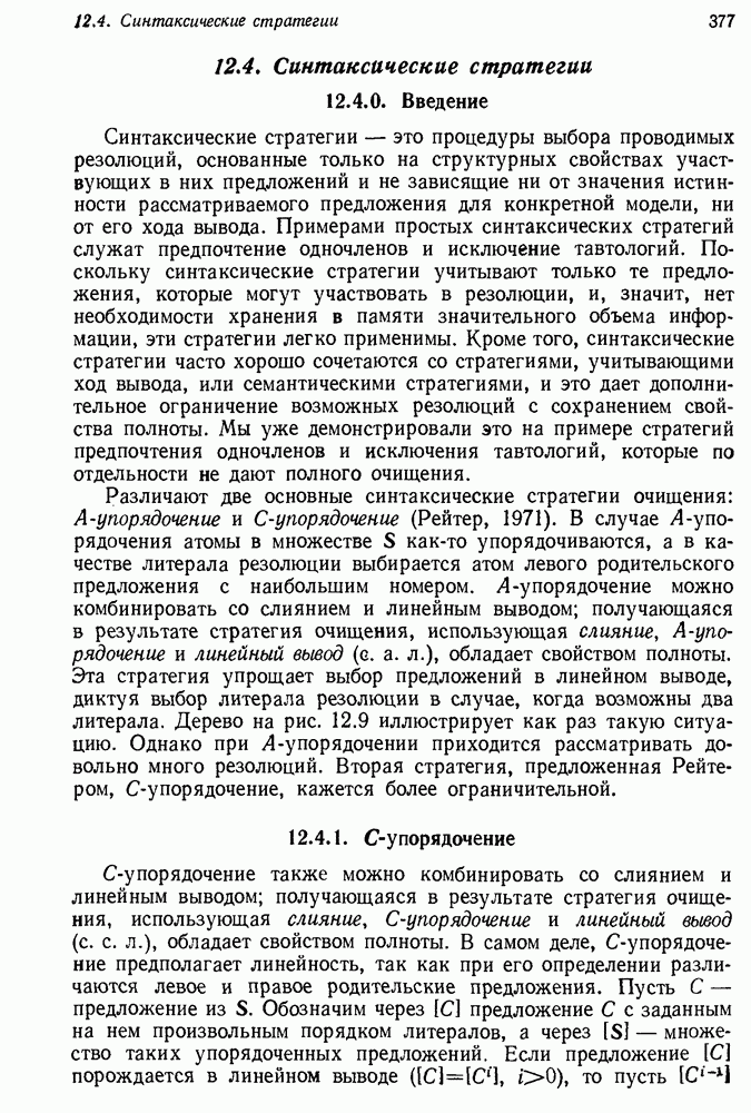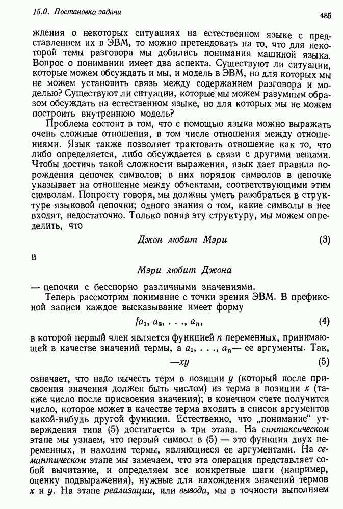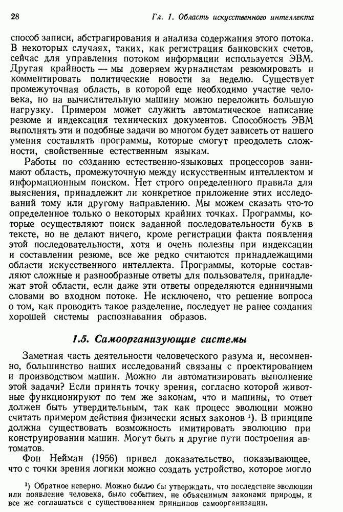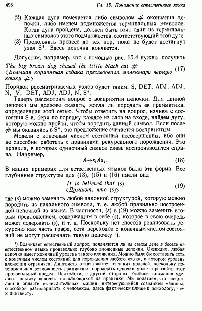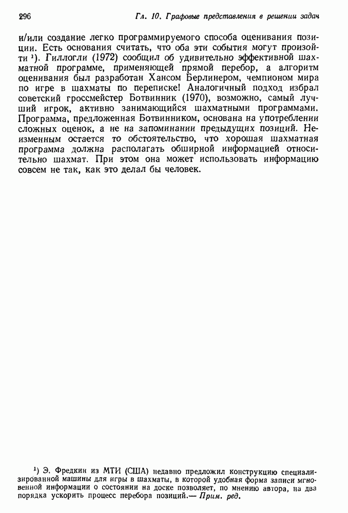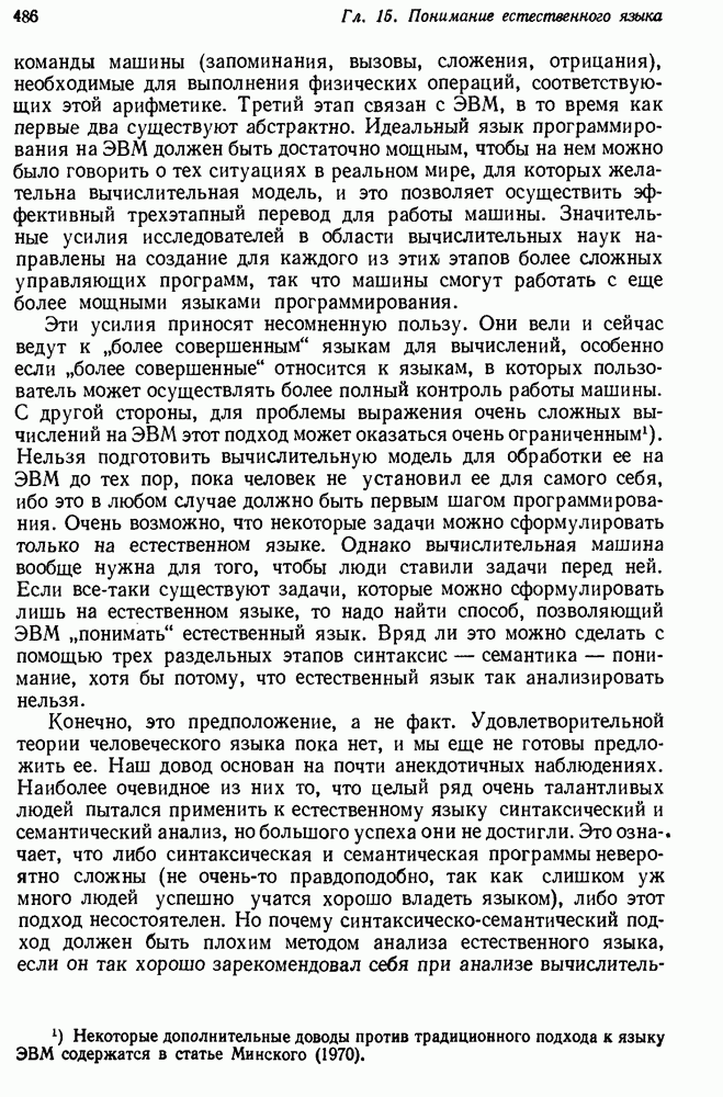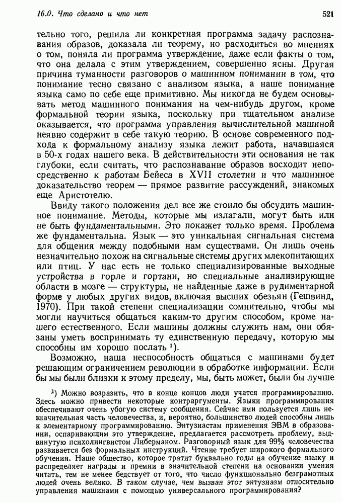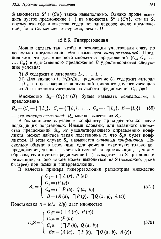 Конечно, никто не потребует от системы доказательства теорем, чтобы она допускала такие утверждения, но в этом ли задача системы дедуктивного ответа на вопросы? Иначе говоря, должна ли программа отвергать противоречивые базы данных? Возможно нет, поскольку много интересных баз данных противоречивы. Литература об экспериментах практически в любой науке полна противоречий, связанных с самыми важными темами исследования. В юриспруденции наиболее сложные юридические проблемы возникают, когда принципы отдельных законов вступают в конфликт. Работающая система PROTOSYNTHEX должна следовать примеру РЕАГИРУЮЩЕЙ БИБЛИОТЕКИ: замечай несоответствия, но не отказывайся их разбирать. Неудача системы PROTOSYNTHEX в работе с кванторами гораздо серьезнее. В действительности работа с кванторами не была адекватным образом учтена ни одним из решателей задач, применяющих методы продукций. Кроме того, PROTOSYNTHEX не может оперировать с вопросами типа „как?“, т. е. с вопросами, для которых нужный ответ будет образом действий, дающим нужный выход. Как мы увидим в следующем разделе, существует естественный метод работы с такими вопросами, основанный на принципе резолюции. Подводя итог, можно сказать, что подход семантических сетей одновременно и обещает, и разочаровывает. Обещает потому, что кажется таким разумным. На практике системы семантических сетей порождают много умных примеров, которые при ближайшем рассмотрении зависят от частных решений. Поскольку нет законченной формальной теории, как для программ, основанных на принципе резолюции, трудно предвидеть, что еще можно ожидать. Область искусственного интеллекта очень нуждается в теории семантических сетей. Такая теория должна была бы объединить вывод с помощью продукций, теорию графов и методы поиска на графе — одним словом, работу нужно проделать немалую!