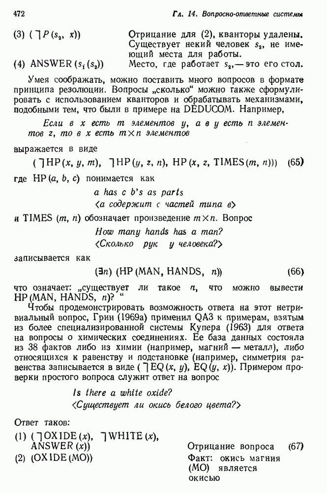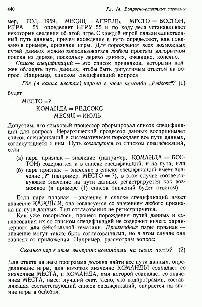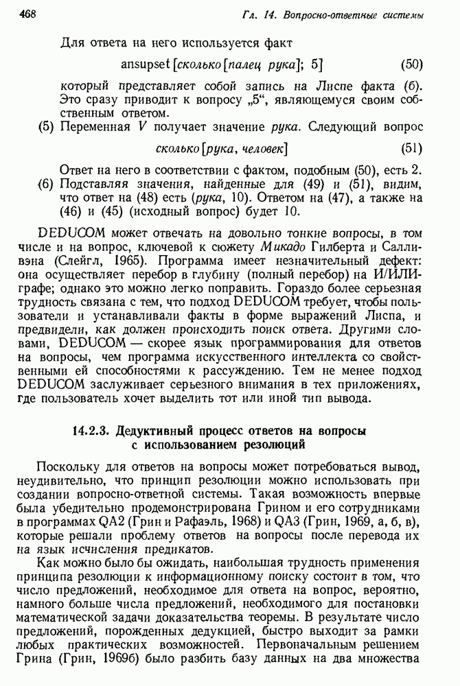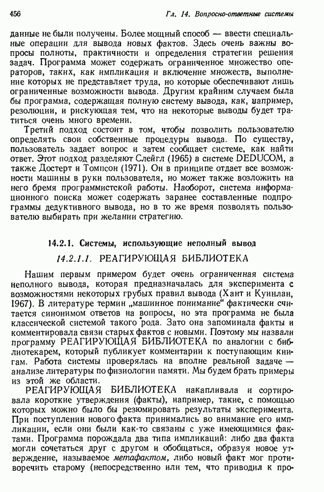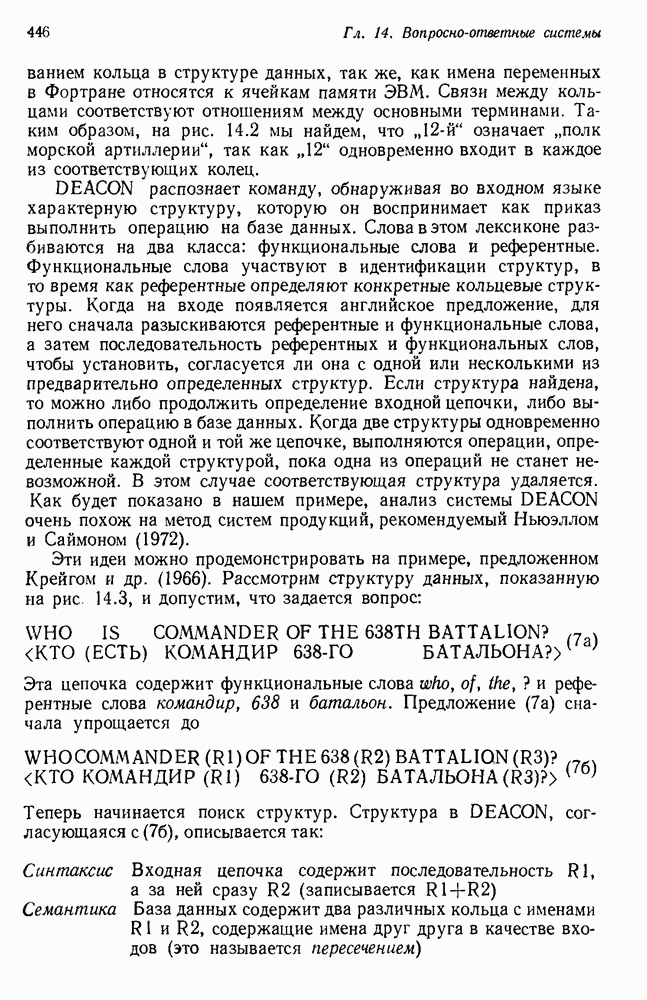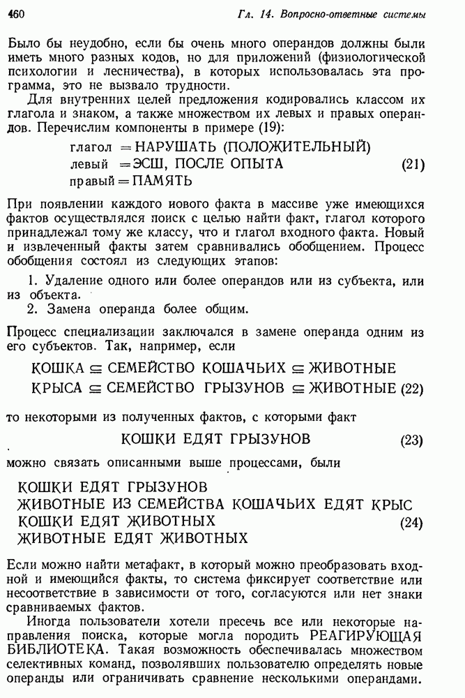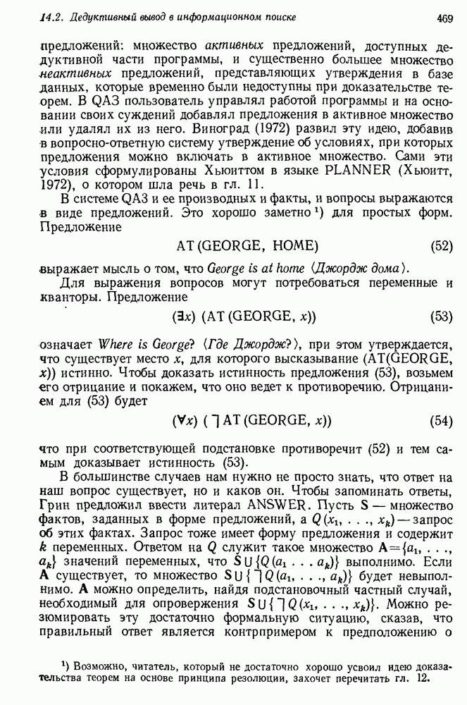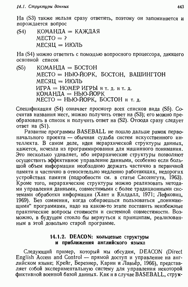 14.2. Дедуктивный вывод в информационном поиске14.2.0. Существующие методыПрограммы, обладающие способностью понимания, должны уметь отвечать на запросы, определяя, какой смысл заключен в той или иной базе данных и что она содержит. Для этого программа должна осуществлять вывод одних фактов из других. Как подразумевается в слове „выводить", соответствующие необходимые процедуры имеют самое непосредственное отношение к доказательству теоремы. Существуют, однако, важные различия между доказательством теорем и выводом при информационном поиске. Алгоритм вывода фактов должен быть корректным. Кажется, нет реальной ситуации, где были бы приемлемы ложные ответы. С другой стороны, полнота, т. е. способность ответить на любой вопрос, допускающий ответ, не является непременным условием. Как мы видели при обсуждении доказательства теорем, полнота часто достигается очень дорогой ценой. В наиболее реальных вопросно-ответных ситуациях большинство вопросов относится к одному и тому же типу, и лишь немногие — к другим. Цель конструктора такой системы — максимизировать полезность системы для пользователя, так что иногда было бы целесообразно пожертвовать способностью вообще отвечать на одни вопросы, чтобы на другие вопросы можно было отвечать очень быстро. Как и следовало ожидать, при создании экспериментальных вопросно-ответных систем вывода такими сугубо практическими соображениями пренебрегали. Возможно, это было оправдано. Мы будем различать несколько типов сложности в процедурах вывода. На самом нижнем уровне программа может быть способной только к перераспределению имеющихся фактов для ответа на запрос. Это демонстрировалось при ответе системы DEACON на вопрос „Кто командир 638-го батальона?“, где ответ был получен подбором нужного сочетания вхождений в базу данных. В качестве побочного продукта процесса ответа на вопросы никакие новые данные не были получены. Более мощный способ — ввести специальные операции для вывода новых фактов. Здесь очень важны вопросы полноты, практичности и определения стратегии решения задач. Программа может содержать ограниченное множество операторов, таких, как импликация и включение множеств, выполнение которых не представляет труда, но которые обеспечивают лишь ограниченные возможности вывода. Другим крайним случаем была бы программа, содержащая полную систему вывода, как, например, резолюции, и рискующая тем, что на некоторые выводы будет тратиться очень много времени. Третий подход состоит в том, чтобы позволить пользователю определять свои собственные процедуры вывода. По существу, пользователь задает вопрос и затем сообщает системе, как найти ответ. Этот подход разделяют Слейгл (1965) в системе DEDUCOM, а также Достерт и Томпсон (1971). Он в принципе отдает все возможности машины в руки пользователя, но может также возложить на него бремя программистской работы. Наоборот, система информационного поиска может содержать заранее составленные подпрограммы дедуктивного вывода, но в то же время позволять пользователю выбирать при желании стратегию. 14.2.1. Системы, использующие неполный вывод14.2.1.1. РЕАГИРУЮЩАЯ БИБЛИОТЕКАНашим первым примером будет очень ограниченная система неполного вывода, которая предназначалась для эксперимента с возможностями некоторых грубых правил вывода (Хант и Куинлан, 