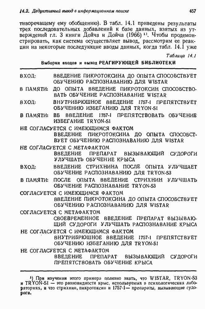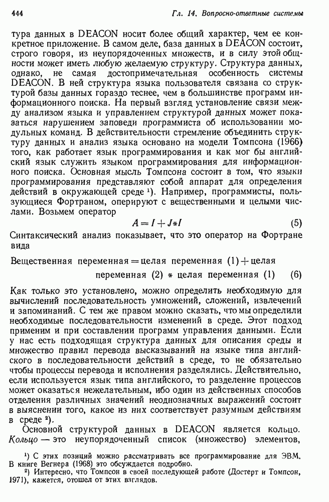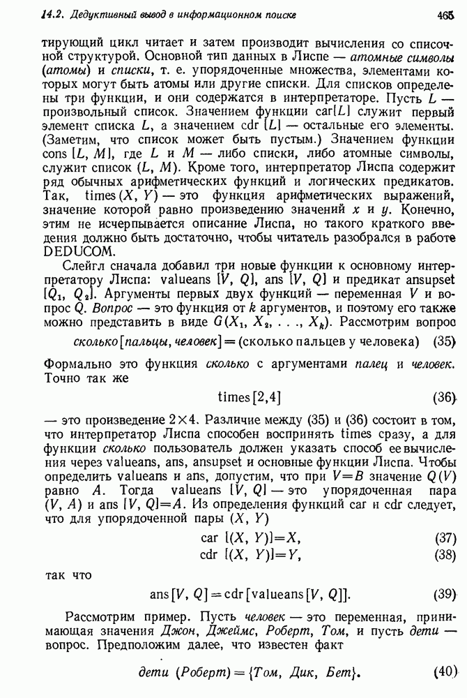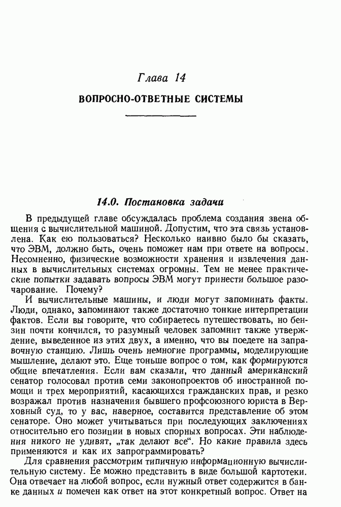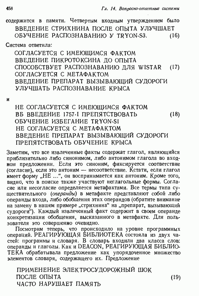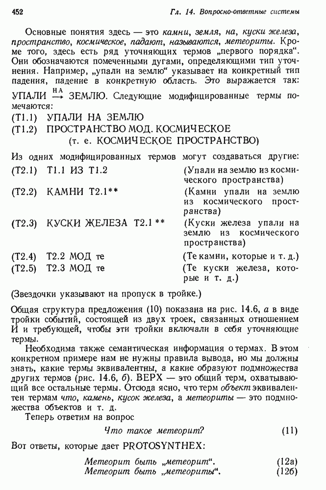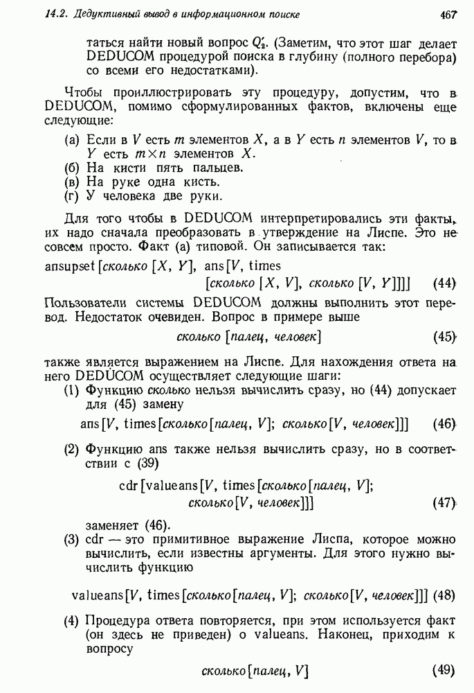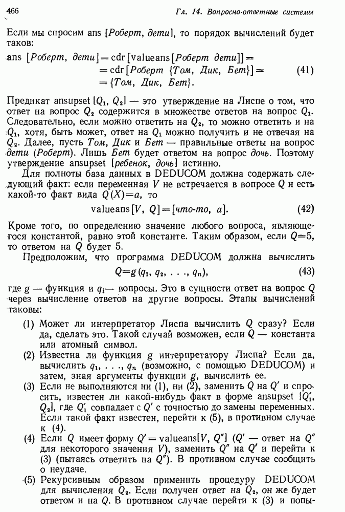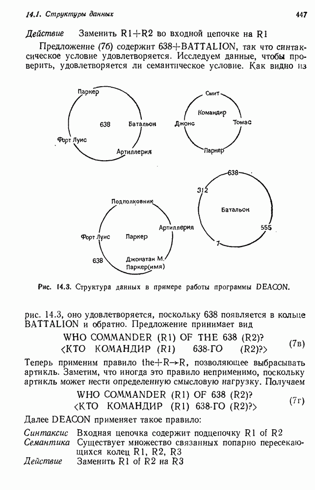 14.2. Дедуктивный вывод в информационном поиске14.2.0. Существующие методыПрограммы, обладающие способностью понимания, должны уметь отвечать на запросы, определяя, какой смысл заключен в той или иной базе данных и что она содержит. Для этого программа должна осуществлять вывод одних фактов из других. Как подразумевается в слове „выводить", соответствующие необходимые процедуры имеют самое непосредственное отношение к доказательству теоремы. Существуют, однако, важные различия между доказательством теорем и выводом при информационном поиске. Алгоритм вывода фактов должен быть корректным. Кажется, нет реальной ситуации, где были бы приемлемы ложные ответы. С другой стороны, полнота, т. е. способность ответить на любой вопрос, допускающий ответ, не является непременным условием. Как мы видели при обсуждении доказательства теорем, полнота часто достигается очень дорогой ценой. В наиболее реальных вопросно-ответных ситуациях большинство вопросов относится к одному и тому же типу, и лишь немногие — к другим. Цель конструктора такой системы — максимизировать полезность системы для пользователя, так что иногда было бы целесообразно пожертвовать способностью вообще отвечать на одни вопросы, чтобы на другие вопросы можно было отвечать очень быстро. Как и следовало ожидать, при создании экспериментальных вопросно-ответных систем вывода такими сугубо практическими соображениями пренебрегали. Возможно, это было оправдано. Мы будем различать несколько типов сложности в процедурах вывода. На самом нижнем уровне программа может быть способной только к перераспределению имеющихся фактов для ответа на запрос. Это демонстрировалось при ответе системы DEACON на вопрос „Кто командир 638-го батальона?“, где ответ был получен подбором нужного сочетания вхождений в базу данных. В качестве побочного продукта процесса ответа на вопросы никакие новые данные не были получены. Более мощный способ — ввести специальные операции для вывода новых фактов. Здесь очень важны вопросы полноты, практичности и определения стратегии решения задач. Программа может содержать ограниченное множество операторов, таких, как импликация и включение множеств, выполнение которых не представляет труда, но которые обеспечивают лишь ограниченные возможности вывода. Другим крайним случаем была бы программа, содержащая полную систему вывода, как, например, резолюции, и рискующая тем, что на некоторые выводы будет тратиться очень много времени. Третий подход состоит в том, чтобы позволить пользователю определять свои собственные процедуры вывода. По существу, пользователь задает вопрос и затем сообщает системе, как найти ответ. Этот подход разделяют Слейгл (1965) в системе DEDUCOM, а также Достерт и Томпсон (1971). Он в принципе отдает все возможности машины в руки пользователя, но может также возложить на него бремя программистской работы. Наоборот, система информационного поиска может содержать заранее составленные подпрограммы дедуктивного вывода, но в то же время позволять пользователю выбирать при желании стратегию. 14.2.1. Системы, использующие неполный вывод14.2.1.1. РЕАГИРУЮЩАЯ БИБЛИОТЕКАНашим первым примером будет очень ограниченная система неполного вывода, которая предназначалась для эксперимента с возможностями некоторых грубых правил вывода (Хант и Куинлан, 