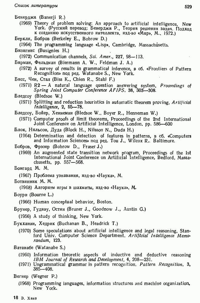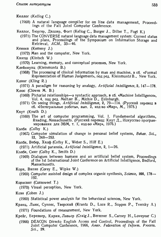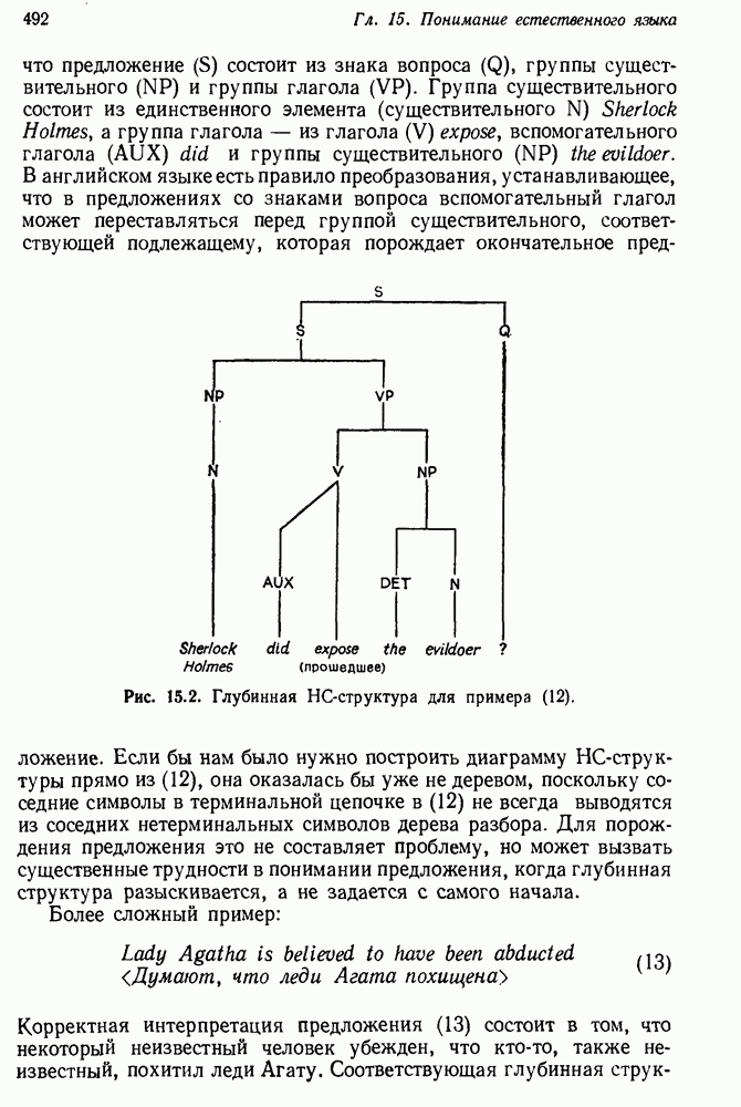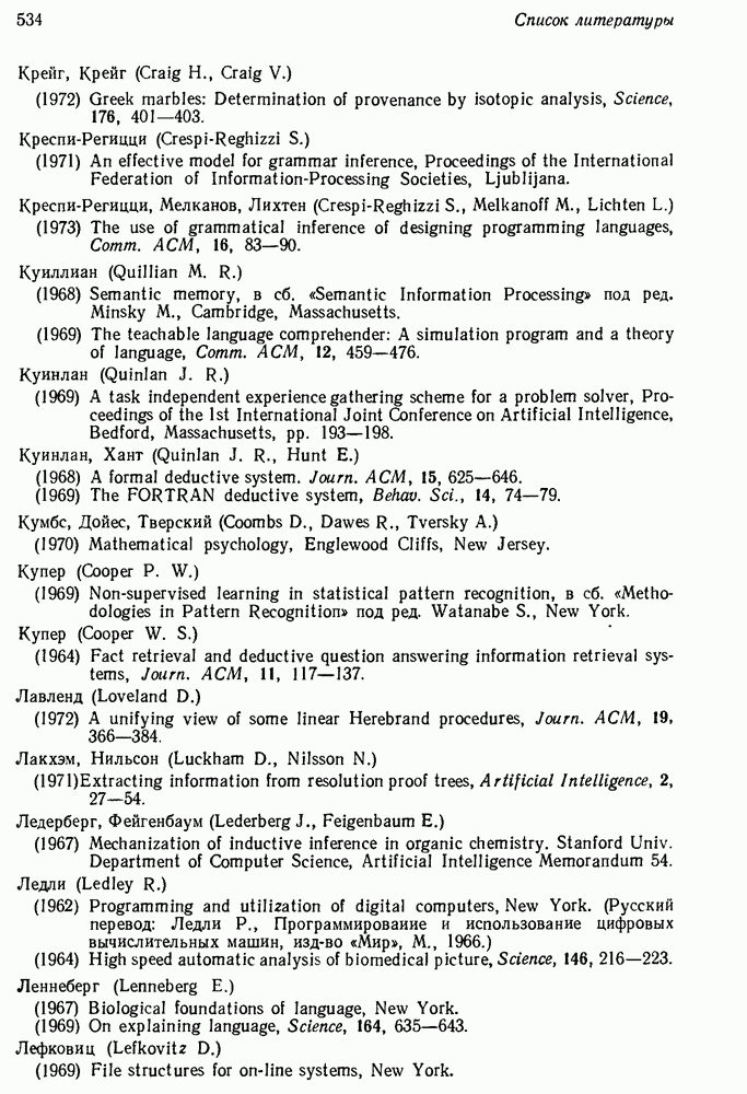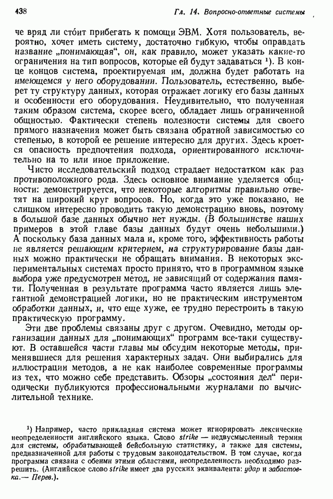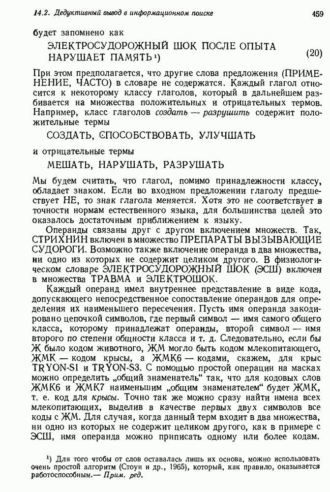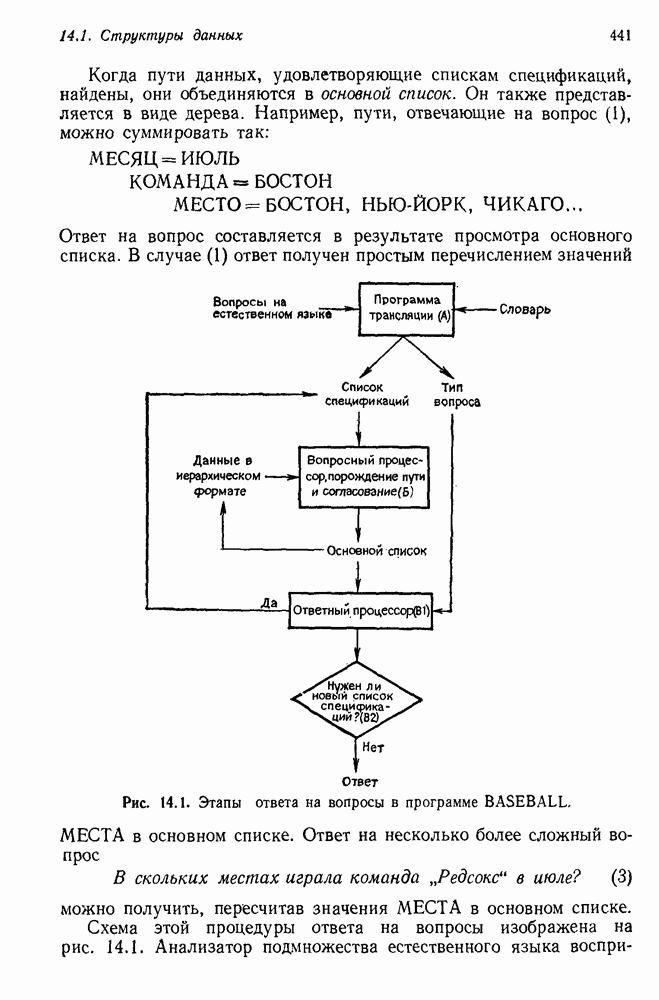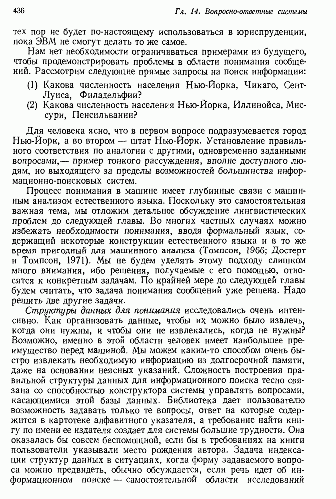 14.2. Дедуктивный вывод в информационном поиске14.2.0. Существующие методыПрограммы, обладающие способностью понимания, должны уметь отвечать на запросы, определяя, какой смысл заключен в той или иной базе данных и что она содержит. Для этого программа должна осуществлять вывод одних фактов из других. Как подразумевается в слове „выводить", соответствующие необходимые процедуры имеют самое непосредственное отношение к доказательству теоремы. Существуют, однако, важные различия между доказательством теорем и выводом при информационном поиске. Алгоритм вывода фактов должен быть корректным. Кажется, нет реальной ситуации, где были бы приемлемы ложные ответы. С другой стороны, полнота, т. е. способность ответить на любой вопрос, допускающий ответ, не является непременным условием. Как мы видели при обсуждении доказательства теорем, полнота часто достигается очень дорогой ценой. В наиболее реальных вопросно-ответных ситуациях большинство вопросов относится к одному и тому же типу, и лишь немногие — к другим. Цель конструктора такой системы — максимизировать полезность системы для пользователя, так что иногда было бы целесообразно пожертвовать способностью вообще отвечать на одни вопросы, чтобы на другие вопросы можно было отвечать очень быстро. Как и следовало ожидать, при создании экспериментальных вопросно-ответных систем вывода такими сугубо практическими соображениями пренебрегали. Возможно, это было оправдано. Мы будем различать несколько типов сложности в процедурах вывода. На самом нижнем уровне программа может быть способной только к перераспределению имеющихся фактов для ответа на запрос. Это демонстрировалось при ответе системы DEACON на вопрос „Кто командир 638-го батальона?“, где ответ был получен подбором нужного сочетания вхождений в базу данных. В качестве побочного продукта процесса ответа на вопросы никакие новые данные не были получены. Более мощный способ — ввести специальные операции для вывода новых фактов. Здесь очень важны вопросы полноты, практичности и определения стратегии решения задач. Программа может содержать ограниченное множество операторов, таких, как импликация и включение множеств, выполнение которых не представляет труда, но которые обеспечивают лишь ограниченные возможности вывода. Другим крайним случаем была бы программа, содержащая полную систему вывода, как, например, резолюции, и рискующая тем, что на некоторые выводы будет тратиться очень много времени. Третий подход состоит в том, чтобы позволить пользователю определять свои собственные процедуры вывода. По существу, пользователь задает вопрос и затем сообщает системе, как найти ответ. Этот подход разделяют Слейгл (1965) в системе DEDUCOM, а также Достерт и Томпсон (1971). Он в принципе отдает все возможности машины в руки пользователя, но может также возложить на него бремя программистской работы. Наоборот, система информационного поиска может содержать заранее составленные подпрограммы дедуктивного вывода, но в то же время позволять пользователю выбирать при желании стратегию. 14.2.1. Системы, использующие неполный вывод14.2.1.1. РЕАГИРУЮЩАЯ БИБЛИОТЕКАНашим первым примером будет очень ограниченная система неполного вывода, которая предназначалась для эксперимента с возможностями некоторых грубых правил вывода (Хант и Куинлан, 